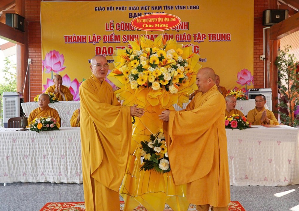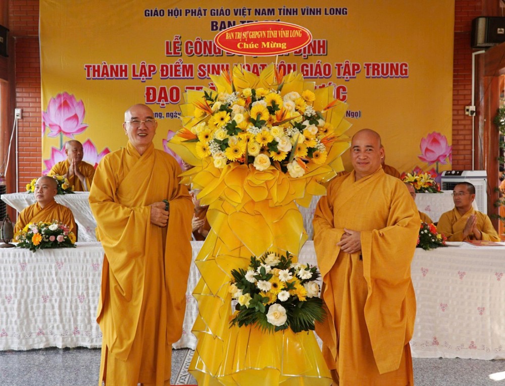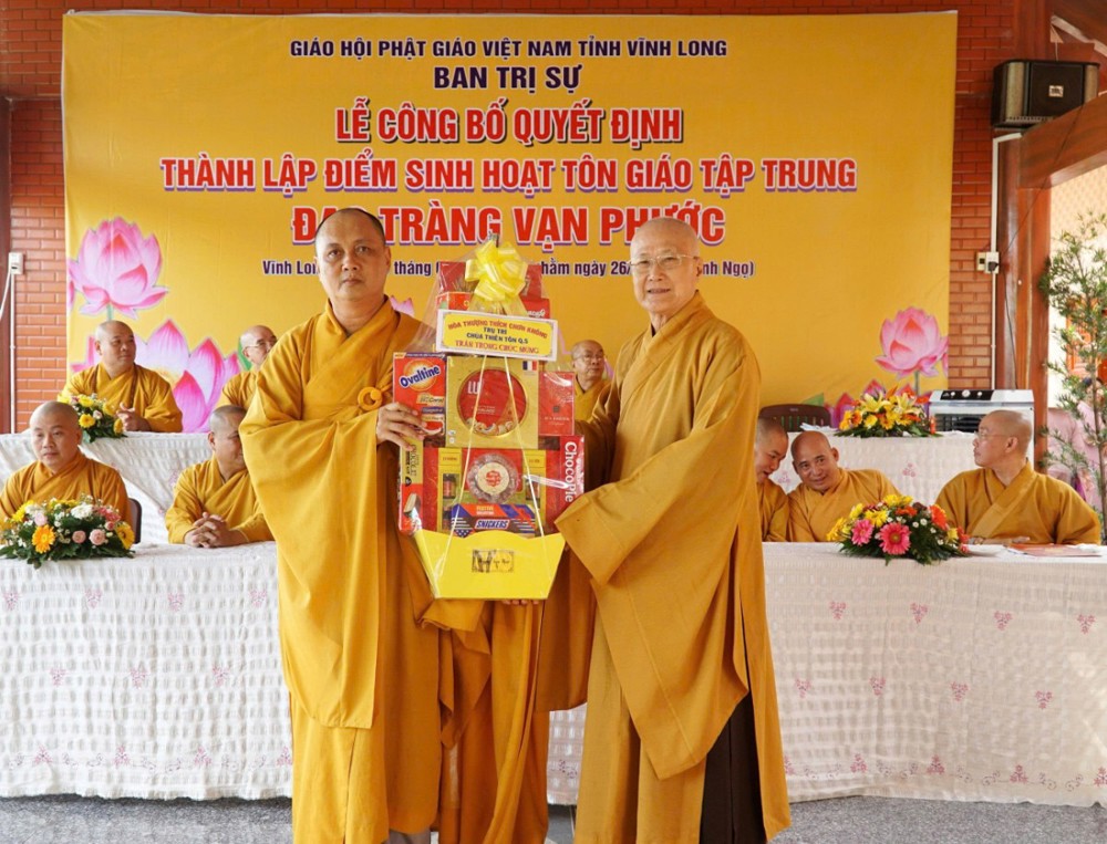 Đại diện Ban Trị sự, Hòa thượng Thích Trí Minh đã trao Quyết định, đồng thời gửi lời chúc mừng đến đạo tràng Vạn Phước, kỳ vọng nơi đây sẽ trở thành điểm sinh hoạt tu học ổn định, trang nghiêm, góp phần hoằng dương Chánh pháp tại địa phương.