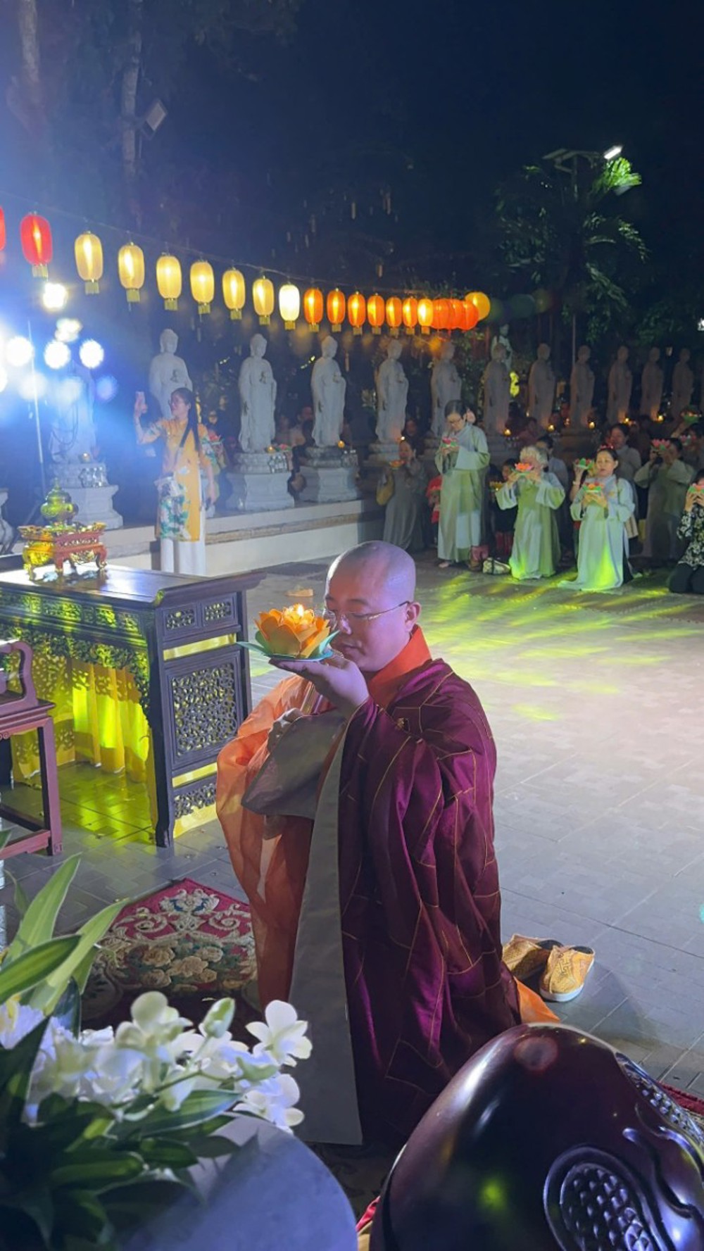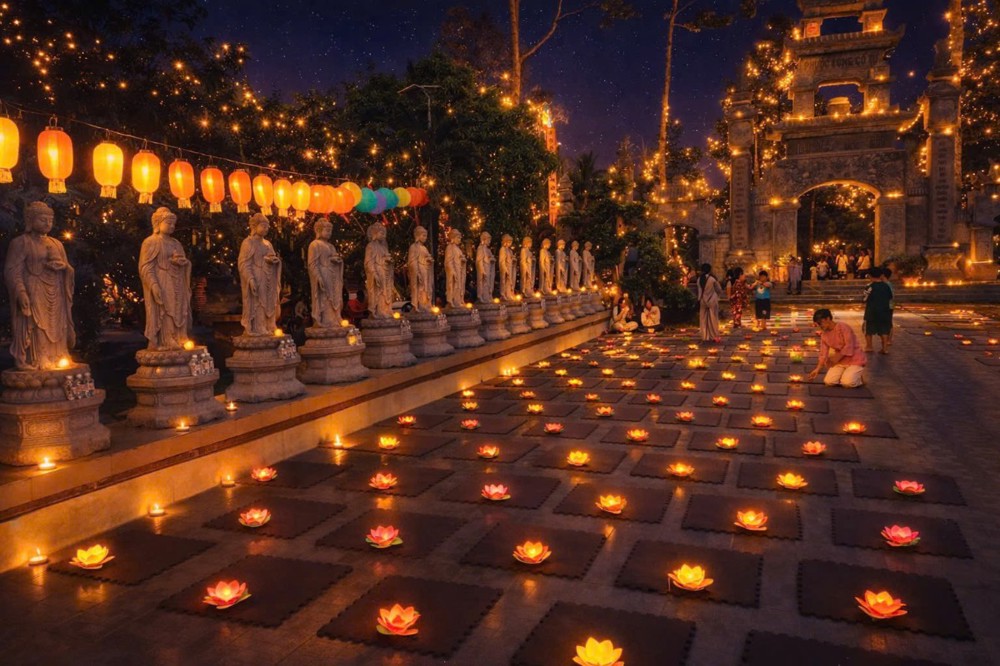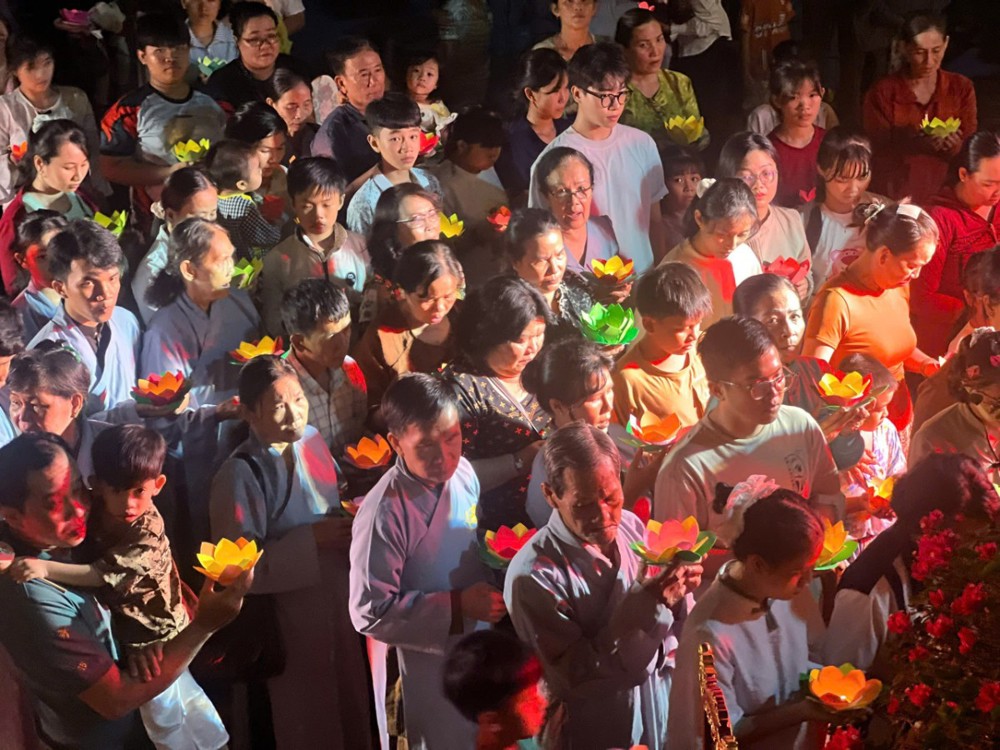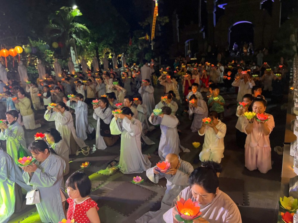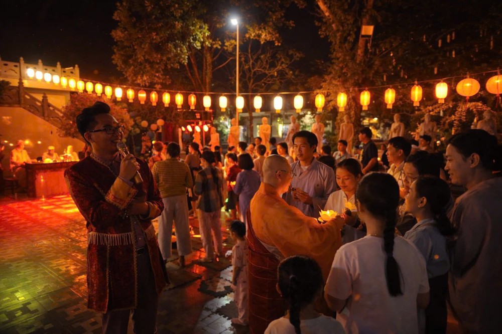 Điểm nhấn thiêng liêng của đêm hội là nghi thức Thắp đèn ước nguyện. Trong làn hương trầm thanh khiết, chư Tôn đức niêm hương bạch Phật, đại chúng đồng đảnh lễ Tam Bảo, nhất tâm hướng về ánh sáng giác ngộ. Từ ngọn nến được cung rước nơi Phật đài, ánh sáng được truyền trao đến từng người tham dự. Hàng trăm ngọn đèn đồng loạt thắp sáng, lan tỏa khắp đạo tràng, tạo nên khung cảnh lung linh, trang nghiêm và đầy xúc cảm.
