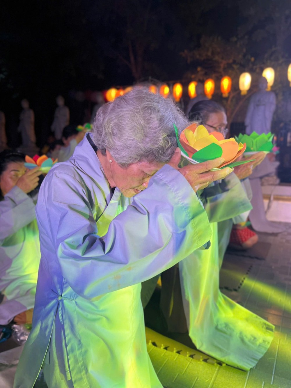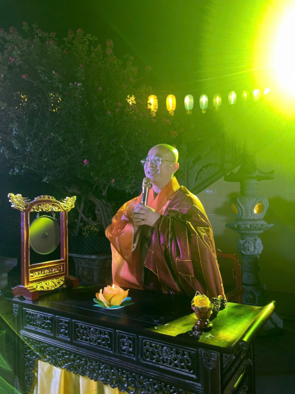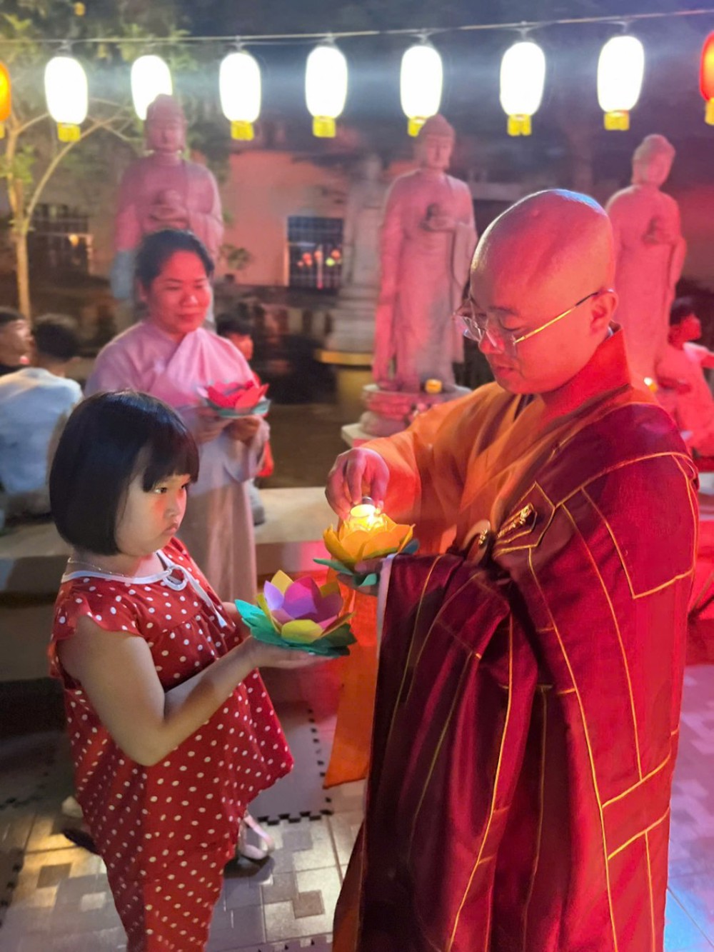 Điểm nhấn thiêng liêng của đêm hội là nghi thức Thắp đèn ước nguyện. Trong làn hương trầm thanh khiết, chư Tôn đức niêm hương bạch Phật, đại chúng đồng đảnh lễ Tam Bảo, nhất tâm hướng về ánh sáng giác ngộ. Từ ngọn nến được cung rước nơi Phật đài, ánh sáng được truyền trao đến từng người tham dự. Hàng trăm ngọn đèn đồng loạt thắp sáng, lan tỏa khắp đạo tràng, tạo nên khung cảnh lung linh, trang nghiêm và đầy xúc cảm.