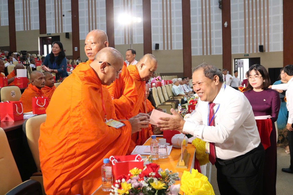 Dịp này, Bí thư Tỉnh ủy Vĩnh Long Trần Văn Lâu trao tặng phần quà đến toàn thể chư Tăng, quý đại biểu tham dự Đại hội.