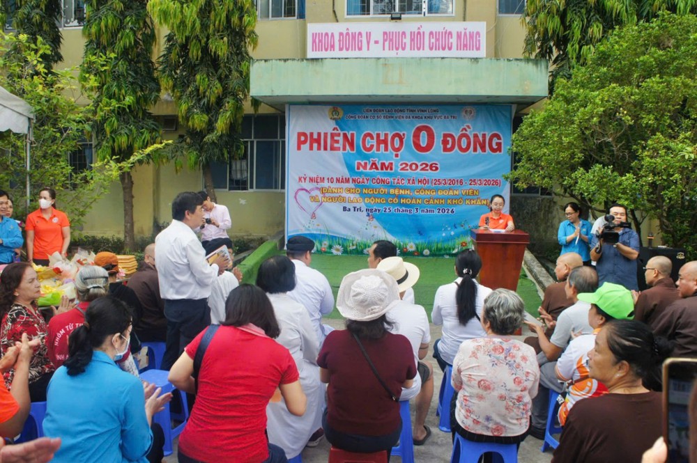 PSO - Với tinh thần nhập thế tích cực, phụng sự nhân sinh của Phật giáo. Ngày 25/03/2026 (nhằm ngày 09/02/năm Bính Ngọ), Chùa Long Khánh (xã Ba Tri, tỉnh Vĩnh Long) – Chùa Thắng Quang (xã An Ngãi Trung) – CLB Lục Hòa đã phối hợp với Bệnh viện Đa khoa khu vực Ba Tri tổ chức “Phiên chợ 0Đ” tại khuôn viên bệnh viện. Mang đến niềm vui và sự sẻ chia thiết thực cho những hoàn cảnh khó khăn, đặc biệt là các bệnh nhân nghèo đang điều trị tại bệnh viện.