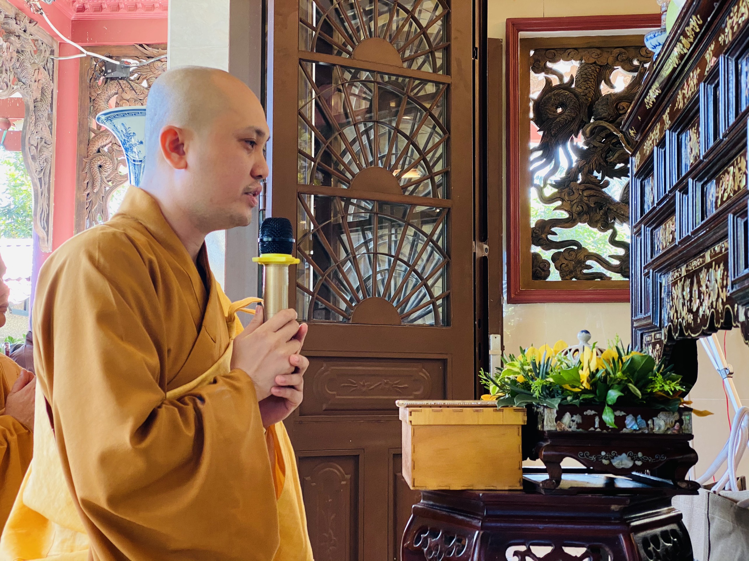 Tiếp sau lễ dâng hương tưởng niệm, cố HT.Thích Thiện Bình thay mặt tông môn đệ tử, ĐĐ. Thích Minh Tuấn trụ trì chùa Giác Long, Trưởng Ban Văn hoá GHPGVN tỉnh Vĩnh Long có đôi lời khai bạch về công hạnh cố Hòa thượng ân sư, đồng thời gửi lời tri ân chư tôn đức Tăng Ni và Phật tử thập phương đã vân tập về đạo tràng Giác Long.