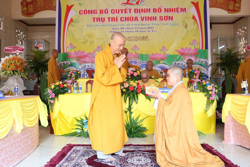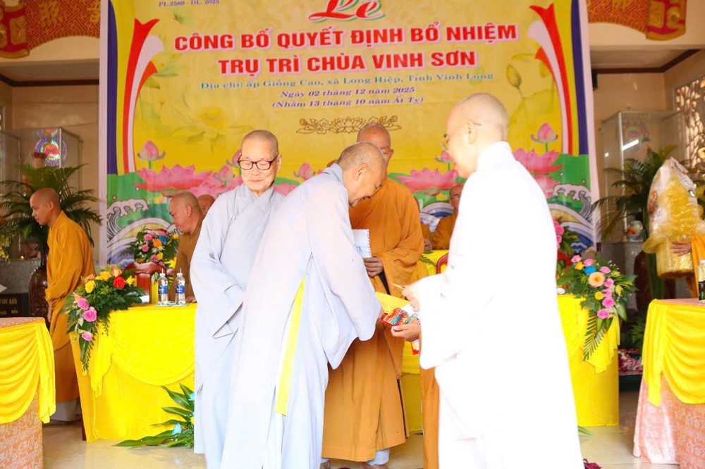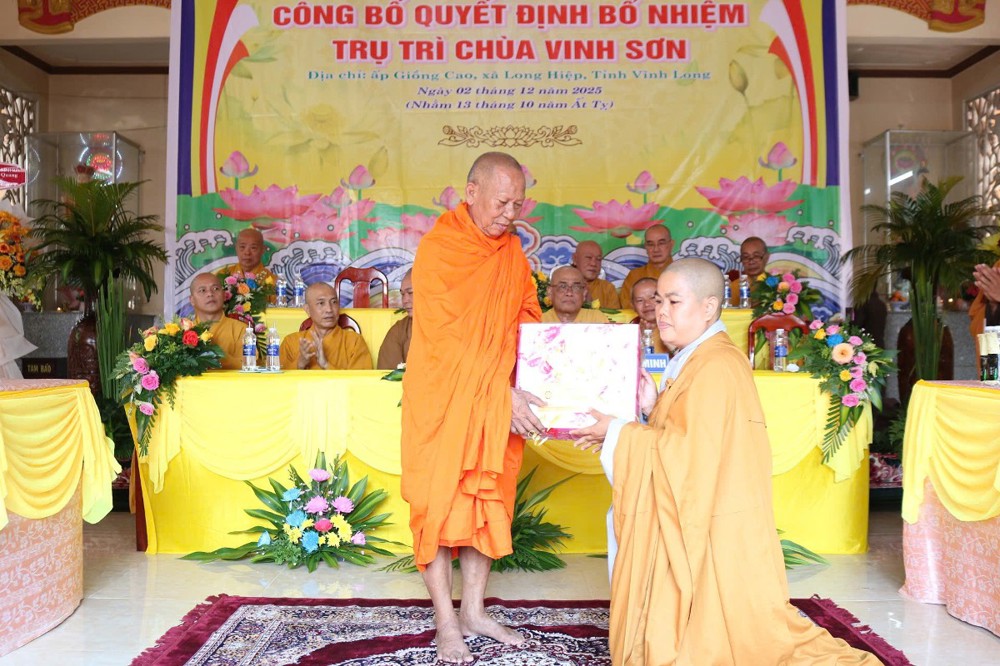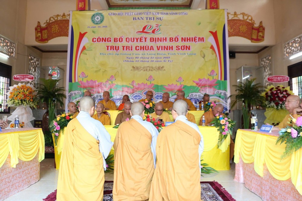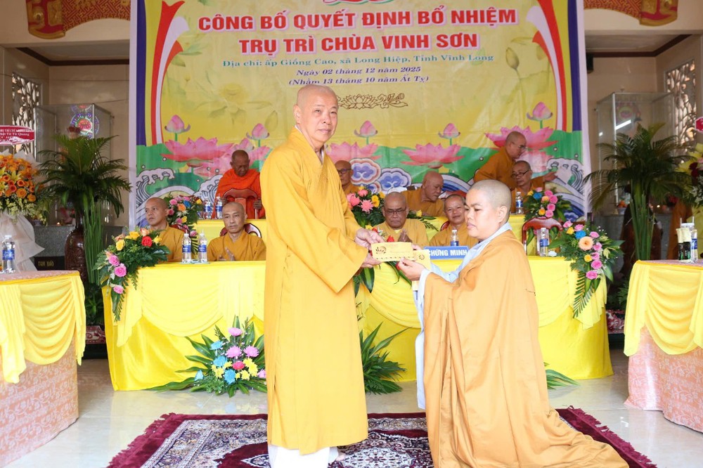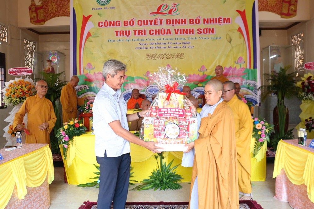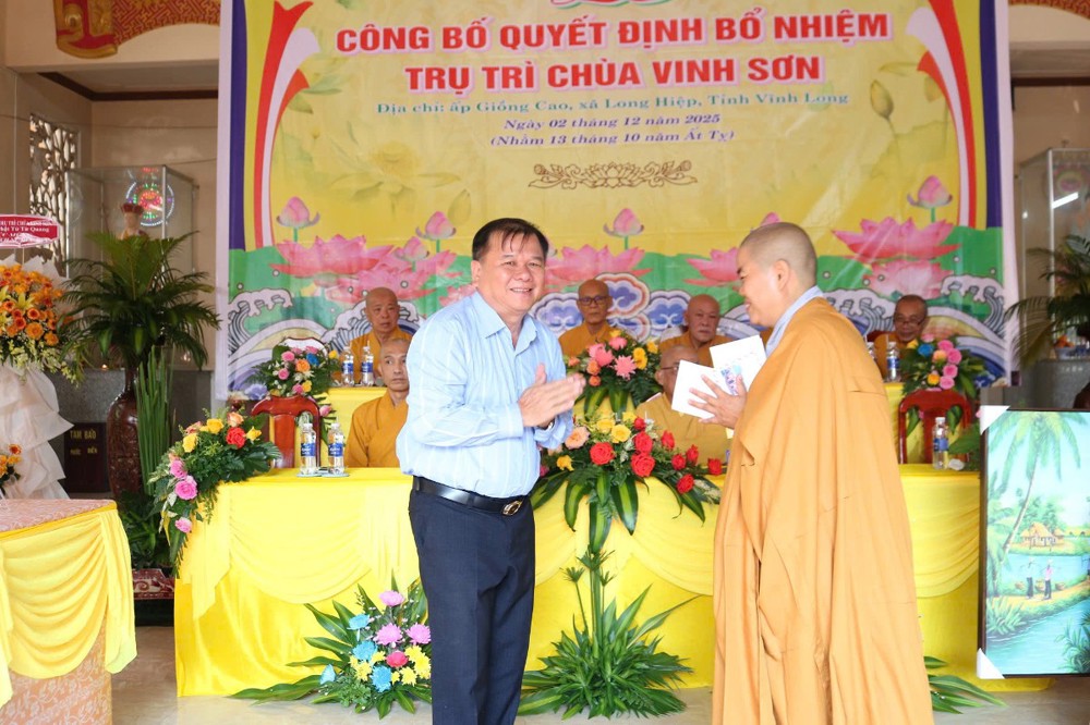 Tại buổi lễ, sau phần nghi thức, TT.Thích Tâm Khiết - Phó Trưởng ban kiêm Chánh Thư ký BTS GHPGVN tỉnh Vĩnh Long công bố Quyết định số 211/QĐ-BTS ngày 10/11/2025 về việc bổ nhiệm SC.Thích Nữ Đức Huy (thế danh Trương Thị Tuyết Liên), sinh năm 1982, làm Trụ trì chùa Vinh Sơn, ấp Giồng Cao, xã Long Hiệp, tỉnh Vĩnh Long.