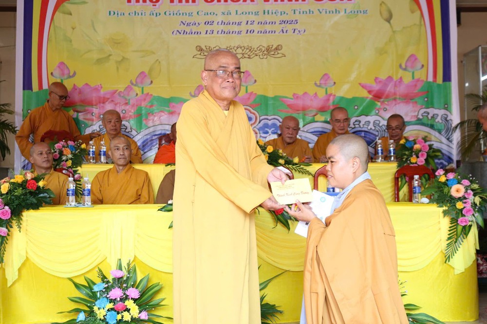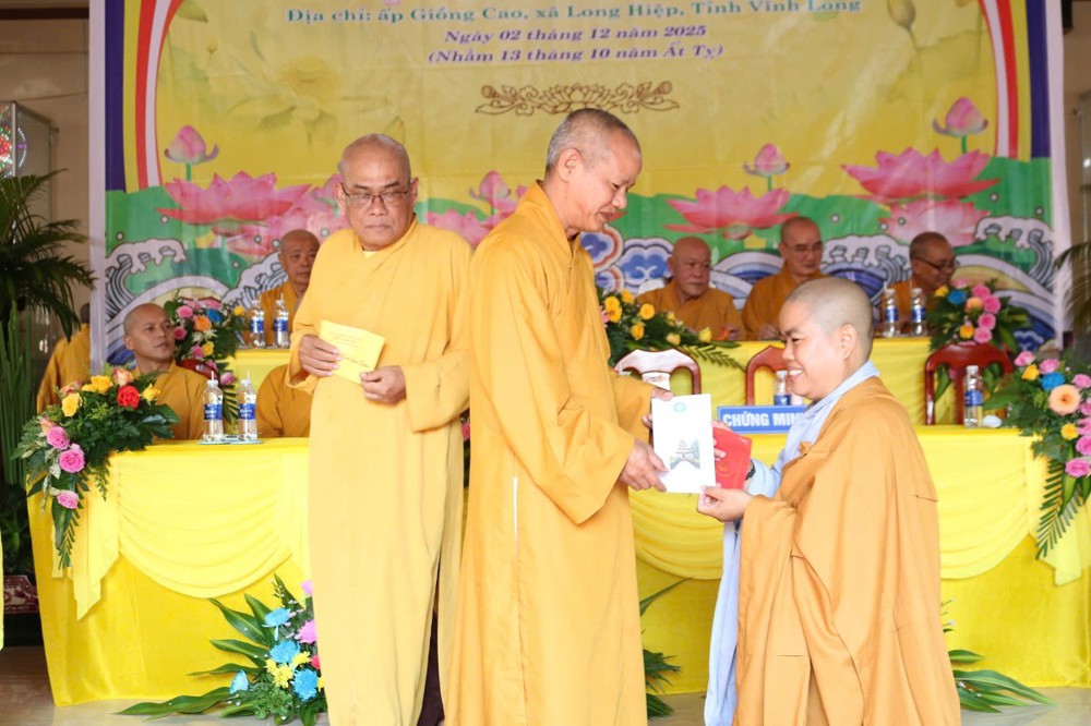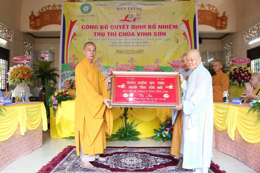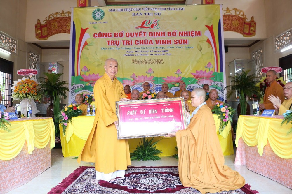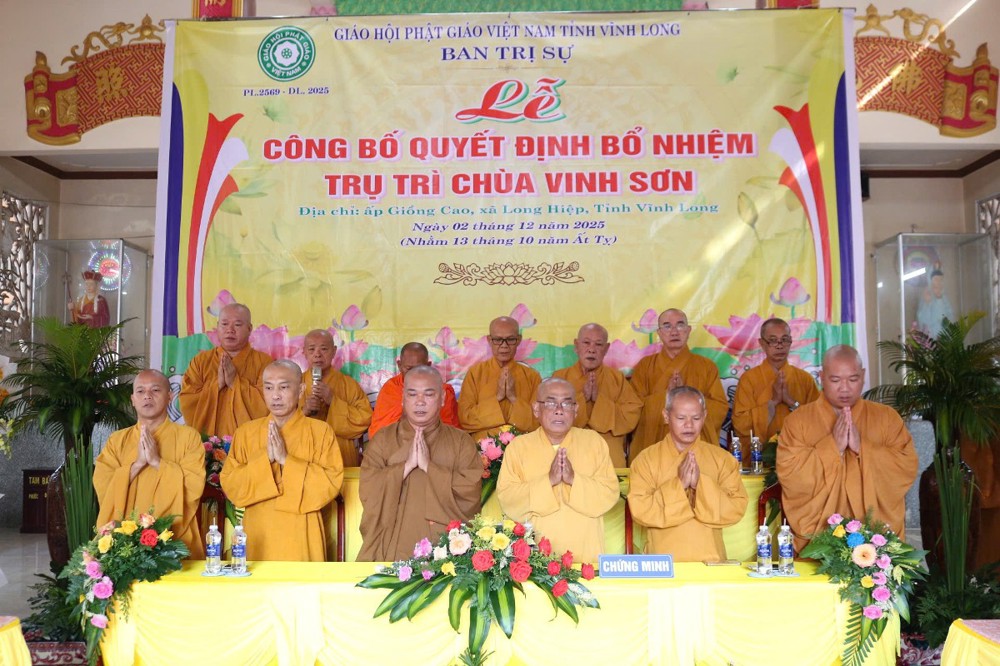 PSO - Sáng ngày 2/12/2025 (nhằm ngày 13/10 năm Ất Tỵ), Ban Thường trực BTS GHPGVN tỉnh Vĩnh Long đã trang nghiêm tổ chức Lễ công bố Quyết định Bổ nhiệm Sư cô Thích Nữ Đức Huy làm Trụ trì chùa Vinh Sơn tại ấp Giồng Cao, xã Long Hiệp, tỉnh Vĩnh Long.