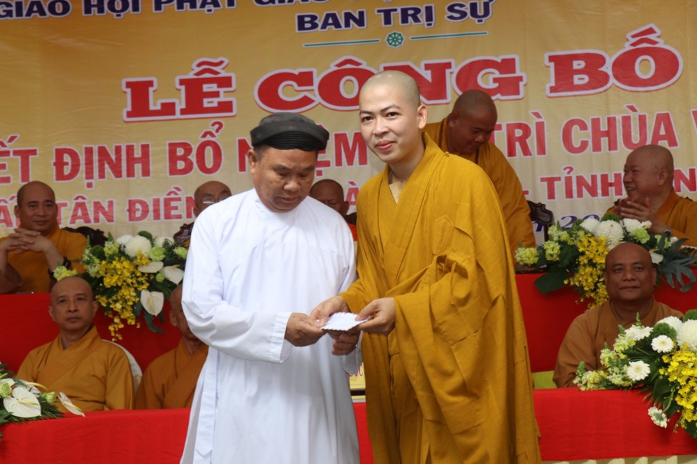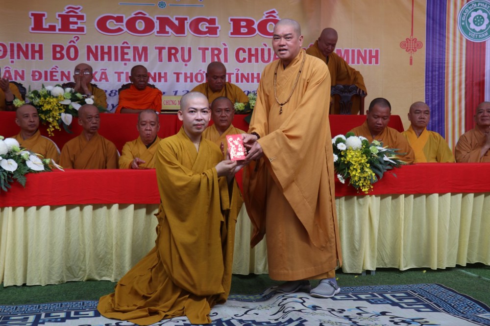 Đồng thời, TT. Thích Trí Thọ trao giấy Quyết định bổ nhiệm trụ trì và trao con dấu chùa Viên Minh cho Đại đức tân trụ trì lưu giữ.