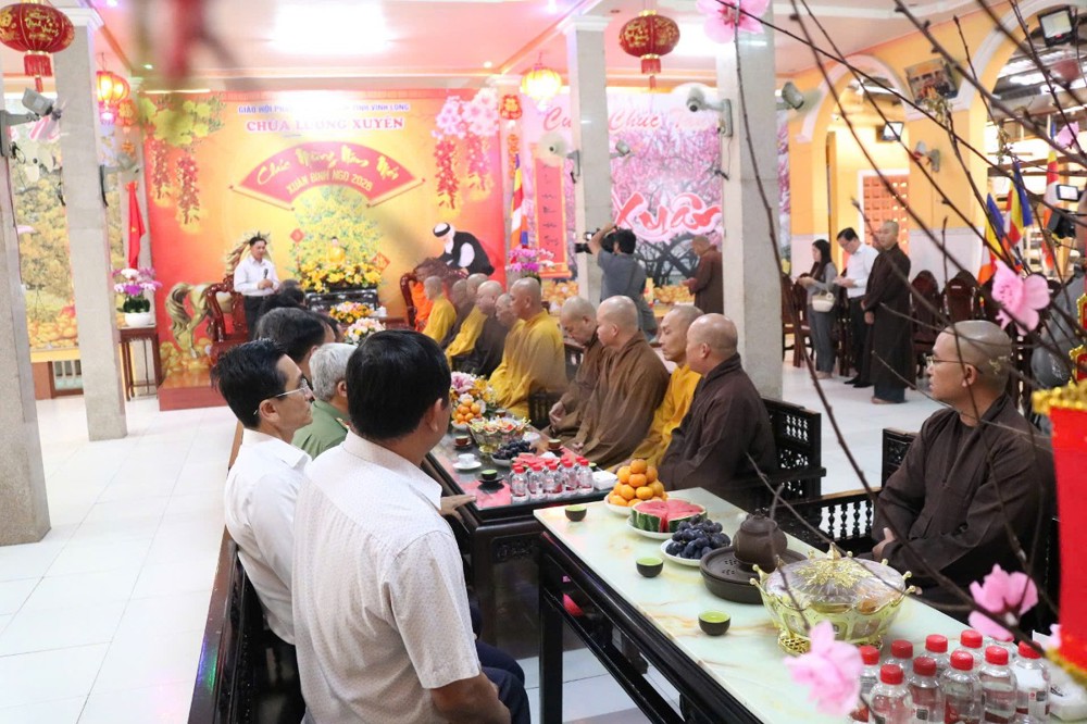 Qua đó, ngài Bí thư Tỉnh ủy thông tin cho biết đối với tỉnh Vĩnh Long sau khi hợp nhất đến nay, về mặt Kinh tế - Xã hội luôn có chiều hướng phát triển, an ninh trật tự, an toàn xã hội được giữ vững và ổn định. Kết quả đó, nhờ sự đóng góp tích cực từ các vị Hòa thượng, Thượng tọa, bà con Phật tử trong tỉnh, điển hình nhất sau cuộc bầu cử Đại biểu Quốc hội khóa XVI, Đại biểu HĐND các cấp nhiệm kỳ 2026 - 2031 thì vai trò của các vị rất lớn trong công tác tuyên truyền, vận động bà con Phật tử tham gia đi bầu cử đạt kết quả rất tốt.