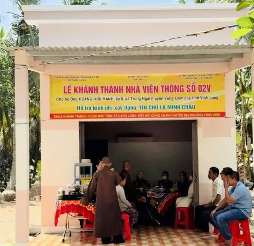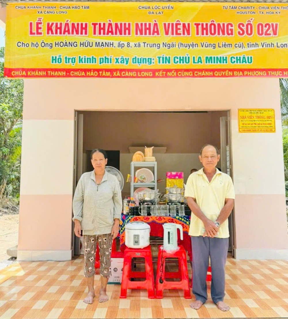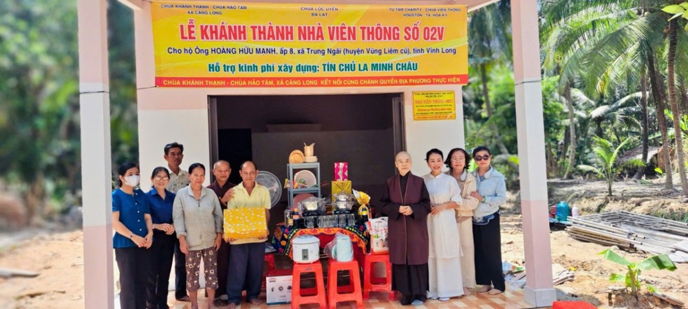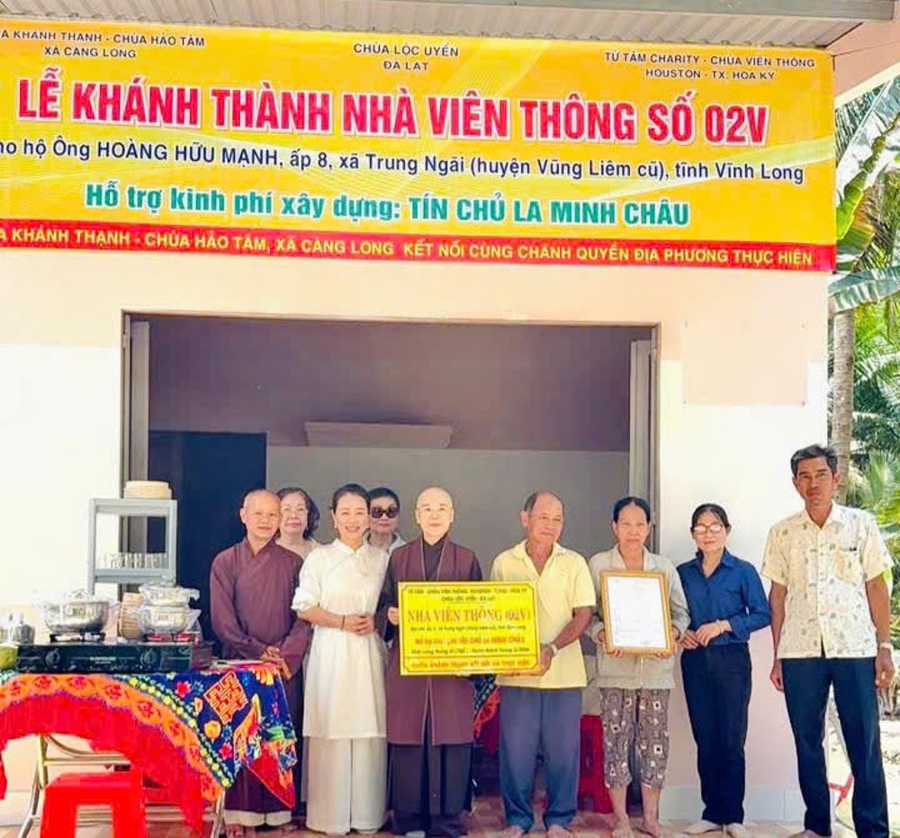 Đặc biệt, các công trình không chỉ được thực hiện bằng nguồn kinh phí vận động, mà còn mang đậm dấu ấn của sự chung tay trực tiếp từ Chư Tôn đức Tăng Ni, Phật tử và bà con địa phương. Từng viên gạch, từng ngày công lao động đều thấm đượm tâm huyết và lòng sẻ chia, thể hiện sinh động hạnh nguyện từ bi cứu khổ của người con Phật giữa cuộc đời. Mở đầu chương trình, vào buổi sáng cùng ngày, đoàn đã tổ chức lễ bàn giao Nhà Viên Thông 02V cho gia đình ông Hoàng Hữu Mạnh và bà Lê Hồng Sương, cư ngụ tại ấp 8, xã Trung Ngãi.