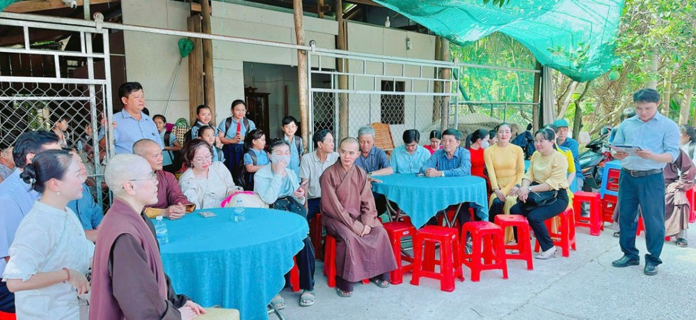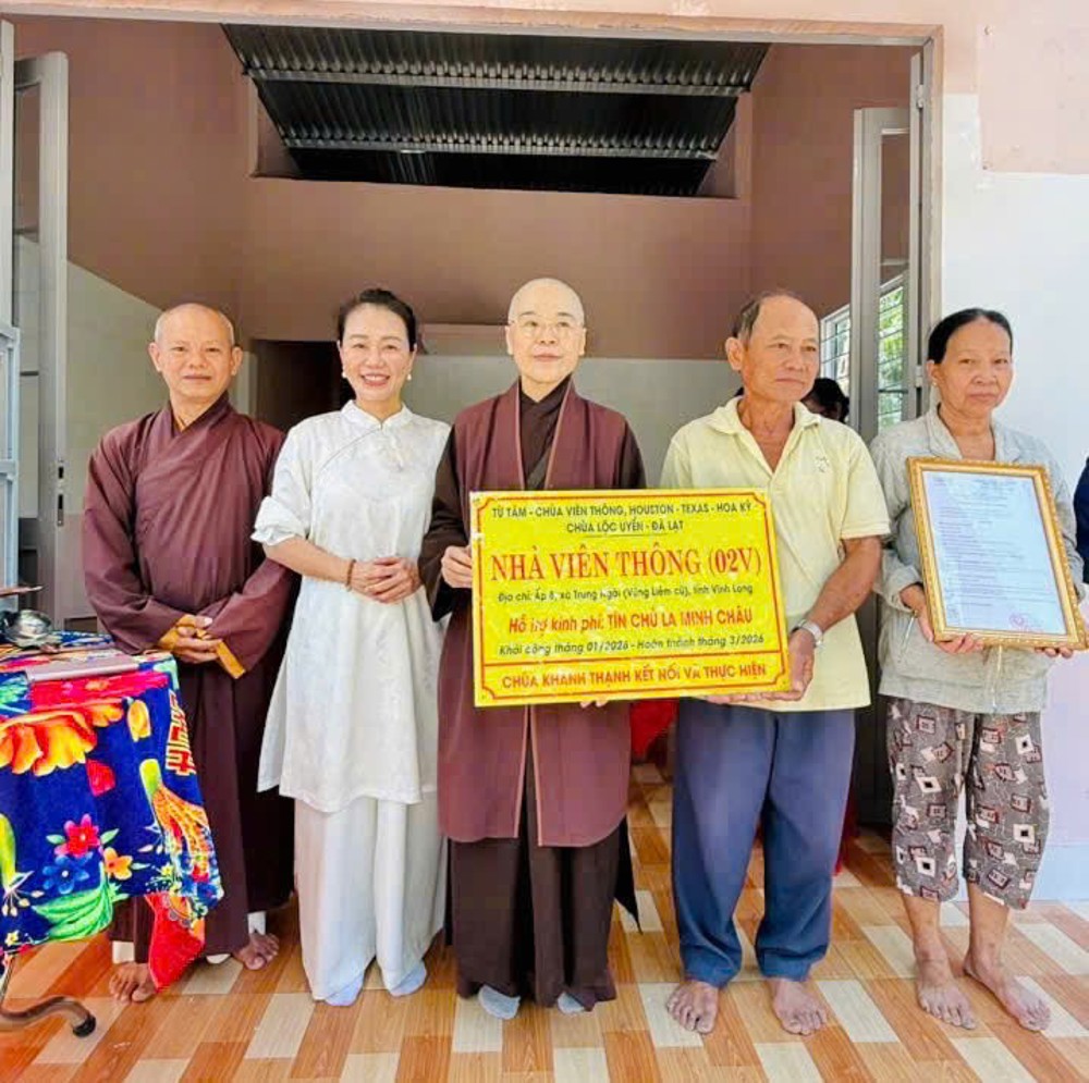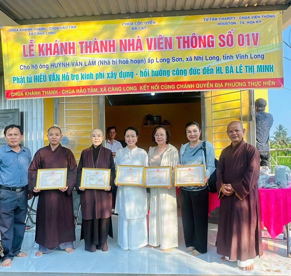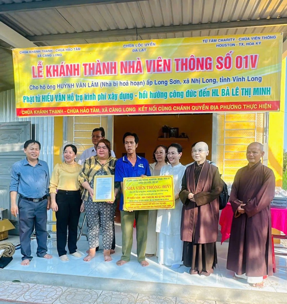 Đặc biệt, các công trình không chỉ được thực hiện bằng nguồn kinh phí vận động, mà còn mang đậm dấu ấn của sự chung tay trực tiếp từ Chư Tôn đức Tăng Ni, Phật tử và bà con địa phương. Từng viên gạch, từng ngày công lao động đều thấm đượm tâm huyết và lòng sẻ chia, thể hiện sinh động hạnh nguyện từ bi cứu khổ của người con Phật giữa cuộc đời. Mở đầu chương trình, vào buổi sáng cùng ngày, đoàn đã tổ chức lễ bàn giao Nhà Viên Thông 02V cho gia đình ông Hoàng Hữu Mạnh và bà Lê Hồng Sương, cư ngụ tại ấp 8, xã Trung Ngãi.