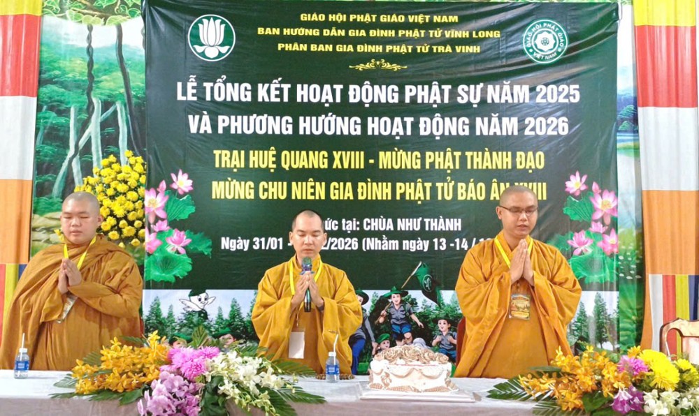 PSO - Ngày 26/01/2026 (nhằm ngày 08 tháng 12 năm Ất Tỵ), trong niềm hân hoan đón mừng Phật Thành Đạo, huynh trưởng và đoàn sinh Gia đình Phật tử Báo Ân, cùng các đơn vị trực thuộc Phân ban Gia đình Phật tử Trà Vinh (cũ) đã trang nghiêm tổ chức Trại Huệ Quang lần thứ 18, kết hợp tổng kết Phật sự năm 2025, triển khai phương hướng hoạt động năm 2026, đồng thời mừng Chu niên GĐPT Báo Ân.