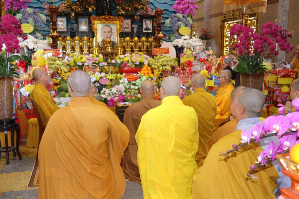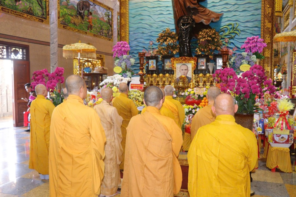 Trong không gian linh thiêng nơi chánh điện, trước Tam Bảo tôn nghiêm, Chư Tôn thiền đức Tăng Ni đã trang nghiêm cử hành nghi thức phúng tụng thời kinh cúng ngọ, nhất tâm cầu nguyện, hồi hướng công đức đến giác linh Quốc sư Phổ Bảo cùng chư vị Tổ sư tiền bối, chư vị Hòa thượng trụ trì tiền nhiệm được cao đăng Phật quốc. Tiếp đó, chư Tôn đức vân tập về Tổ đường, dâng nén tâm hương, thành kính đảnh lễ, tưởng niệm và tri ân công hạnh to lớn của chư vị tiền nhân đã dày công khai sơn tạo tự, truyền đăng tục diệm, giữ gìn và phát triển đạo mạch đến ngày nay.
