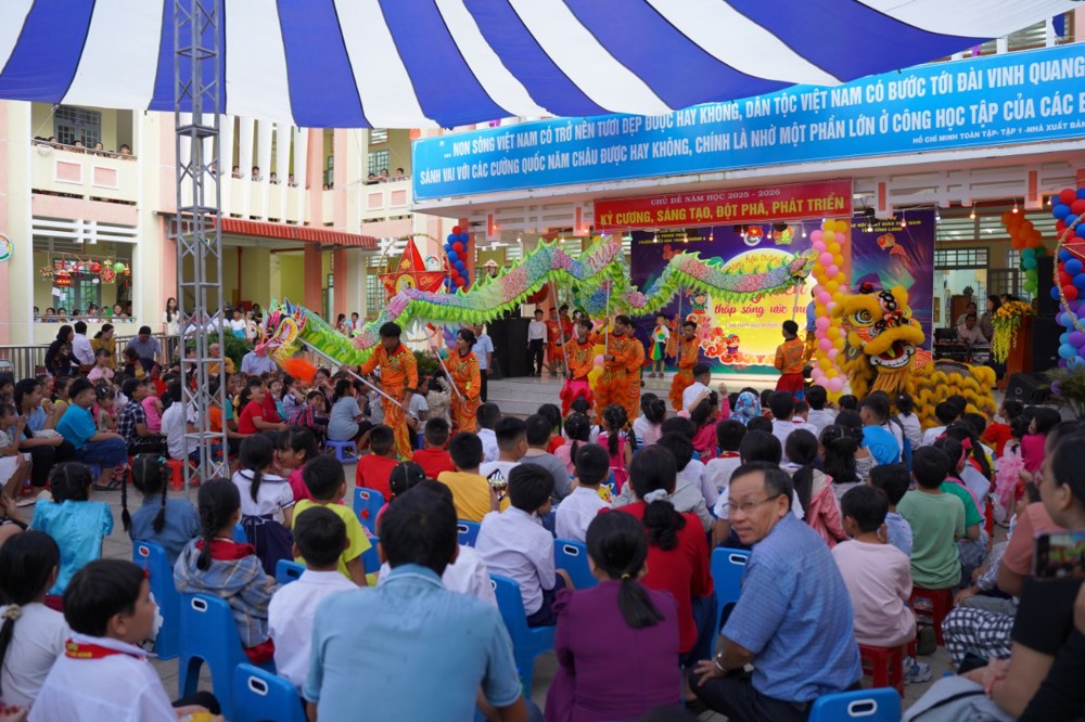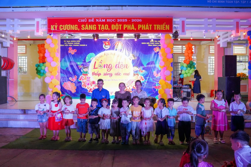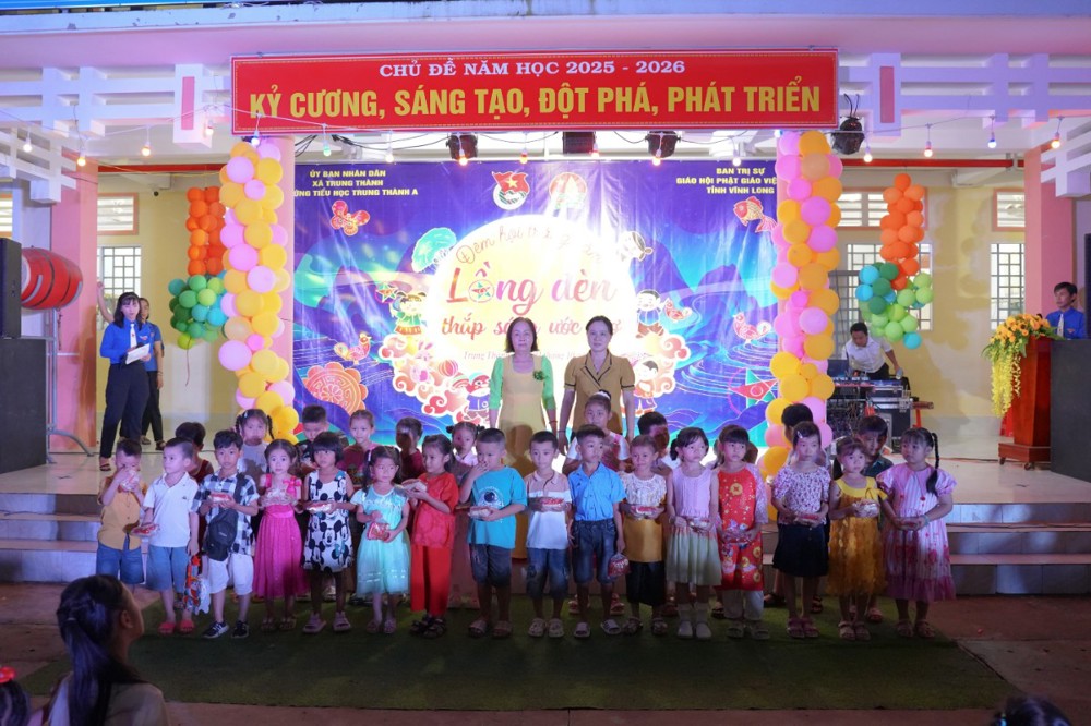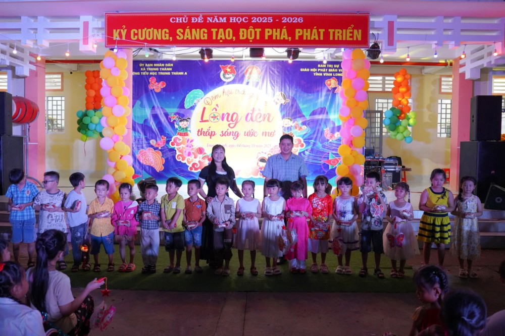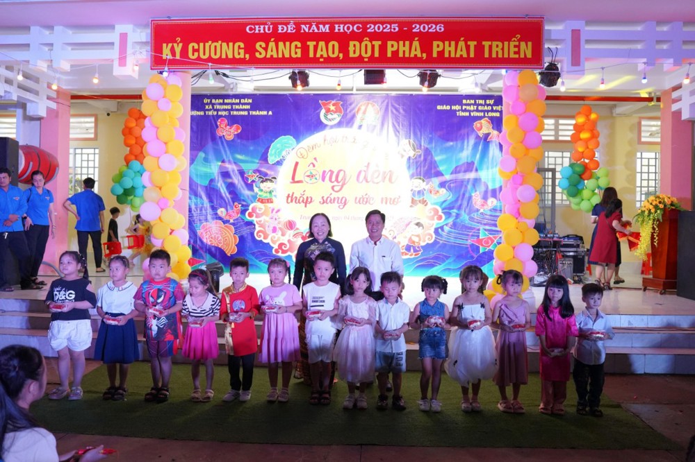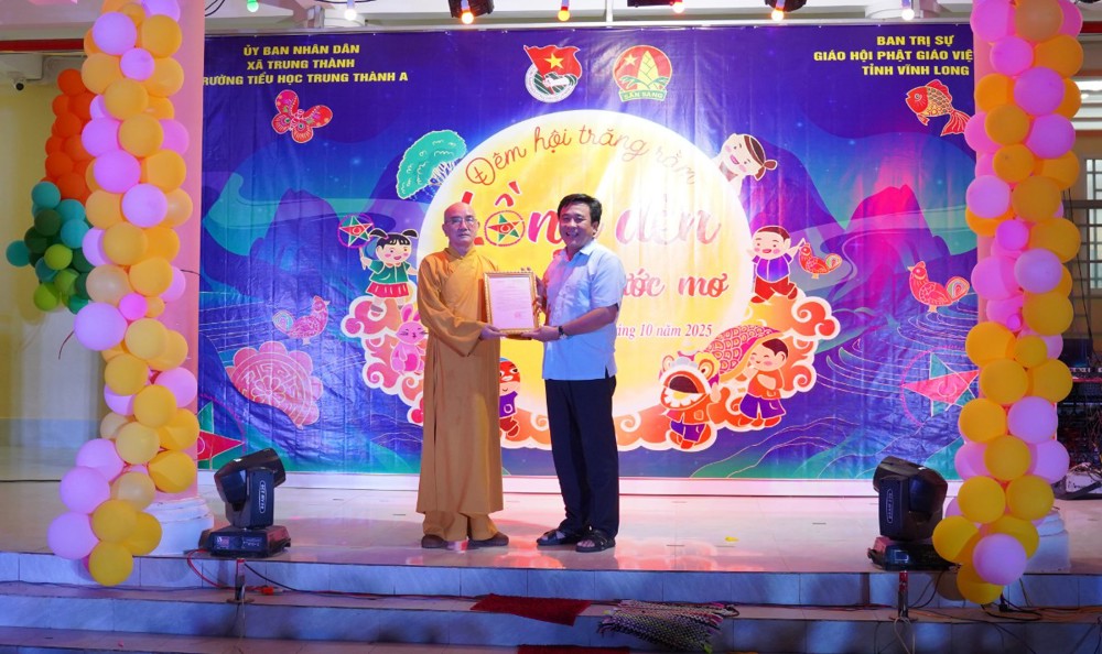PSO - Trong không khí rộn ràng của Tết Trung thu, tối ngày 4/10/2025 (nhằm ngày 13/8 Âm lịch), tại trường Tiểu học Trung Thành A, xã Trung Thành, tỉnh Vĩnh Long đã diễn ra chương trình “Đêm hội Trăng Rằm” với chủ đề “Lồng đèn thắp sáng ước mơ”. Nhân dịp này, Ban Trị sự GHPGVN tỉnh Vĩnh Long phối hợp cùng chính quyền địa phương, trường Tiểu học Trung Thành A và quý mạnh thường quân đã trao 3.200 phần quà Trung thu đến các em thiếu nhi.