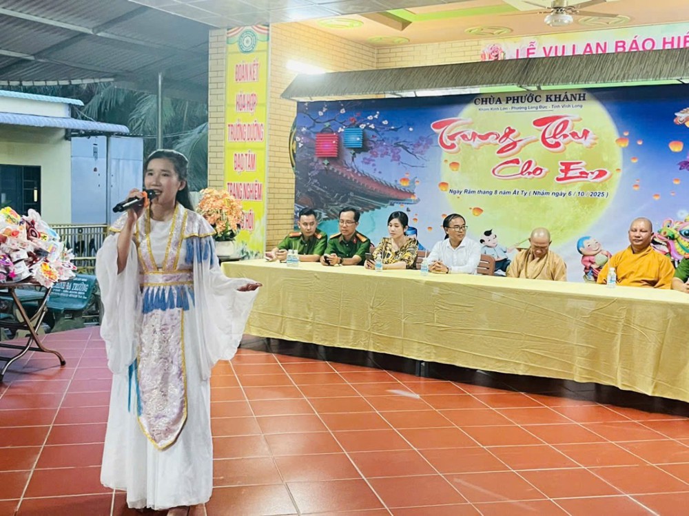 Mở đầu chương trình là các tiết mục văn nghệ chào mừng do các em Phật tử và thiếu nhi địa phương biểu diễn. Những giai điệu vui tươi, trong sáng vang lên giữa sân chùa rực rỡ ánh đèn lồng, mang đến không khí hân hoan, ấm áp của đêm hội trăng rằm. Các em hóa thân thành chú Cuội, chị Hằng cùng những nhân vật cổ tích thân quen, khiến khung cảnh trở nên rộn ràng, tươi mới. Ánh mắt rạng rỡ và nụ cười hồn nhiên của các em như phản chiếu ánh trăng trên cao, làm cho buổi lễ thêm phần sinh động và đầy ý nghĩa.
