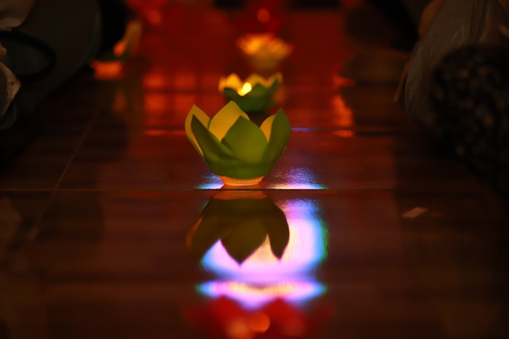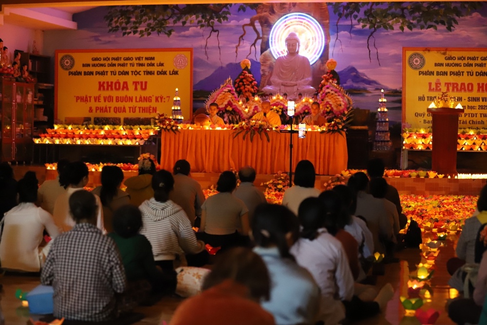 Tối 10/01, Phân ban tổ chức Lễ thắp nến cầu siêu cho đồng bào tử nạn trong các đợt bão lũ, do Đại đức Thích Tâm Lượng - Phó Phân ban Phật tử Dân tộc tỉnh chủ trì, cùng chư Tôn đức Tăng Ni tham dự. Hàng trăm ngọn nến lung linh hòa cùng tiếng kinh trầm mặc, gửi lời cầu nguyện cho những hương linh được nhẹ nhàng buông xả sợ hãi, nương theo ánh sáng Phật pháp về cõi an lành.