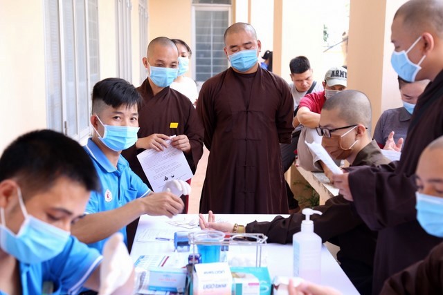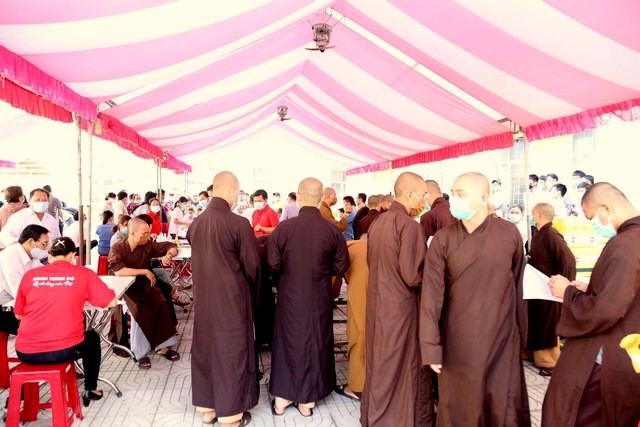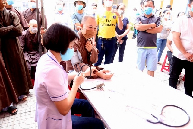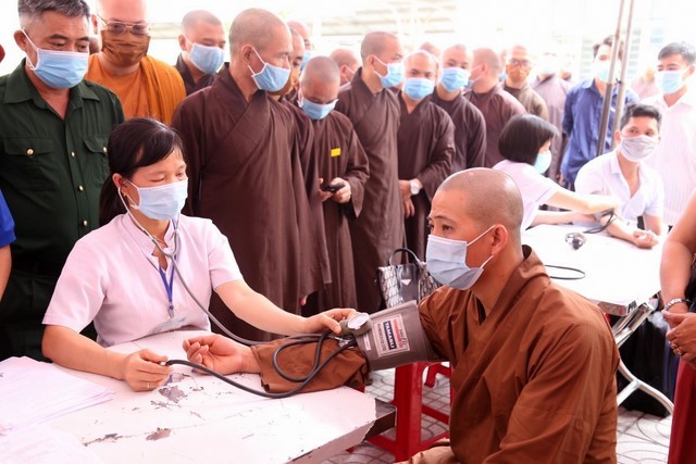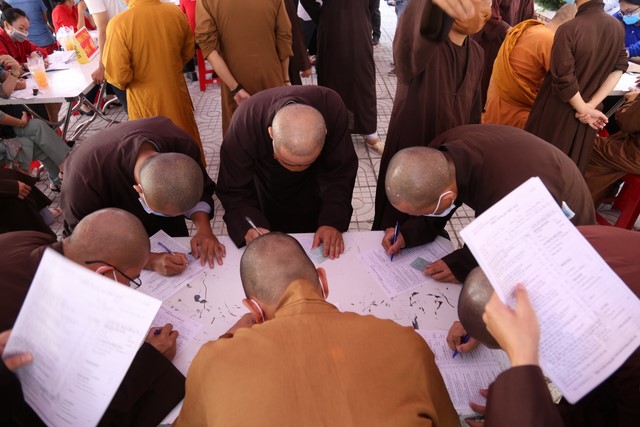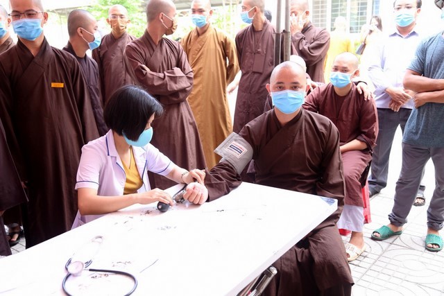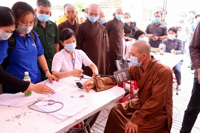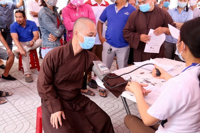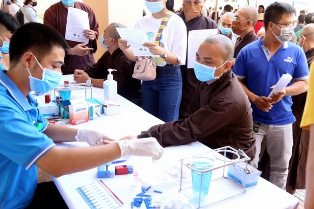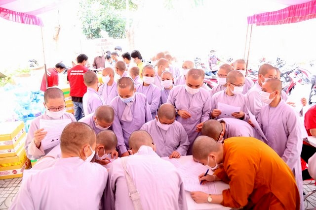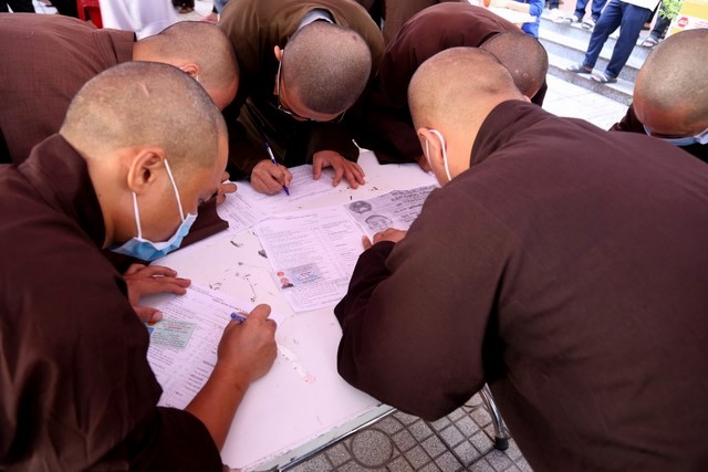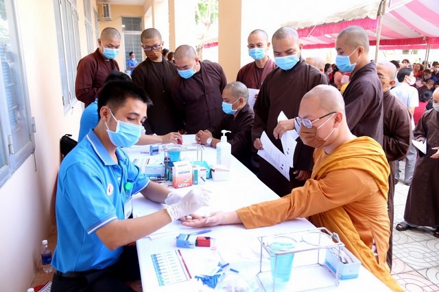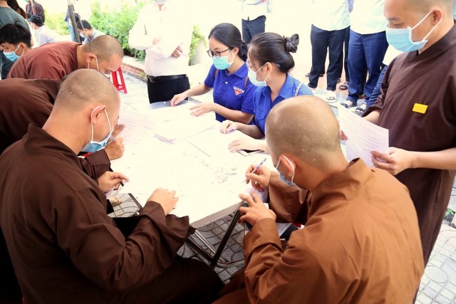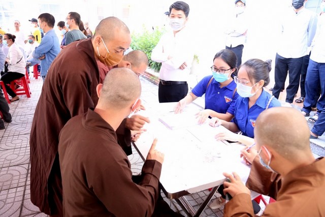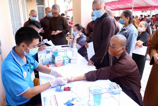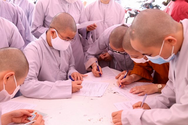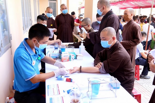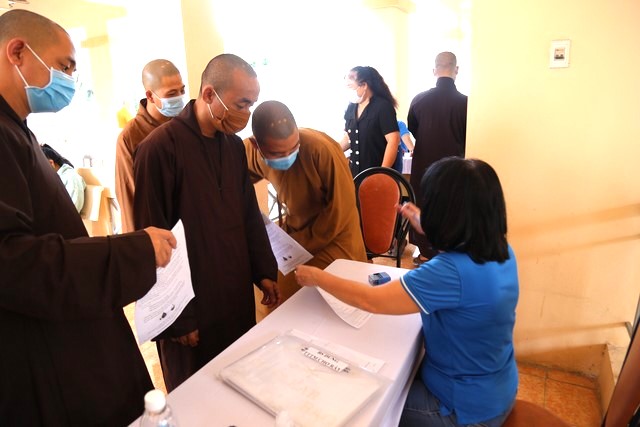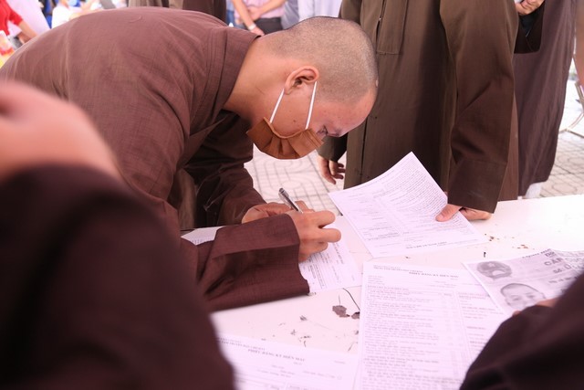 Sau khi thực hiện việc kiểm tra thân nhiệt và Khai báo ý tế, các Tăng Ni sinh đã khai báo thông tin cá nhân cho Ban Tổ chức và được lấy số lượng máu tùy theo thể trạng mỗi người.