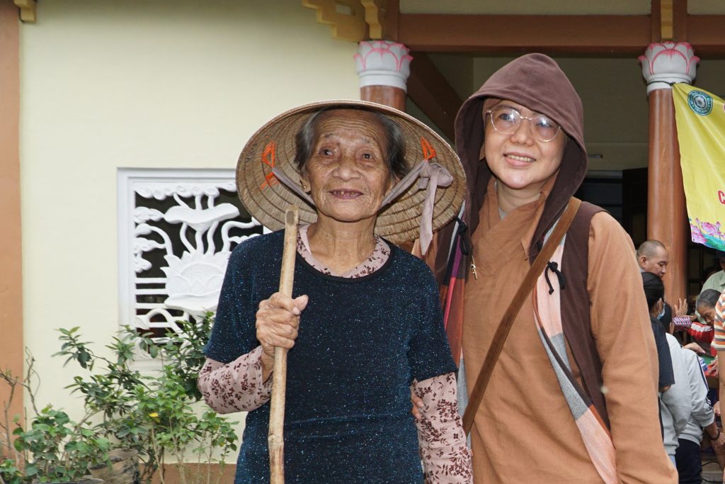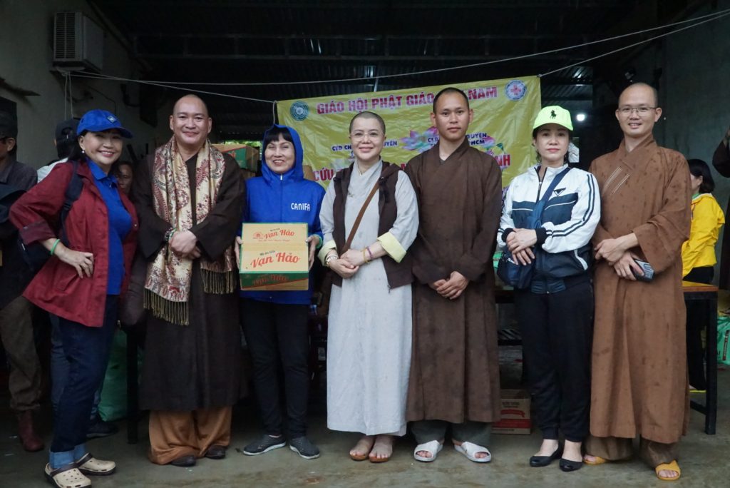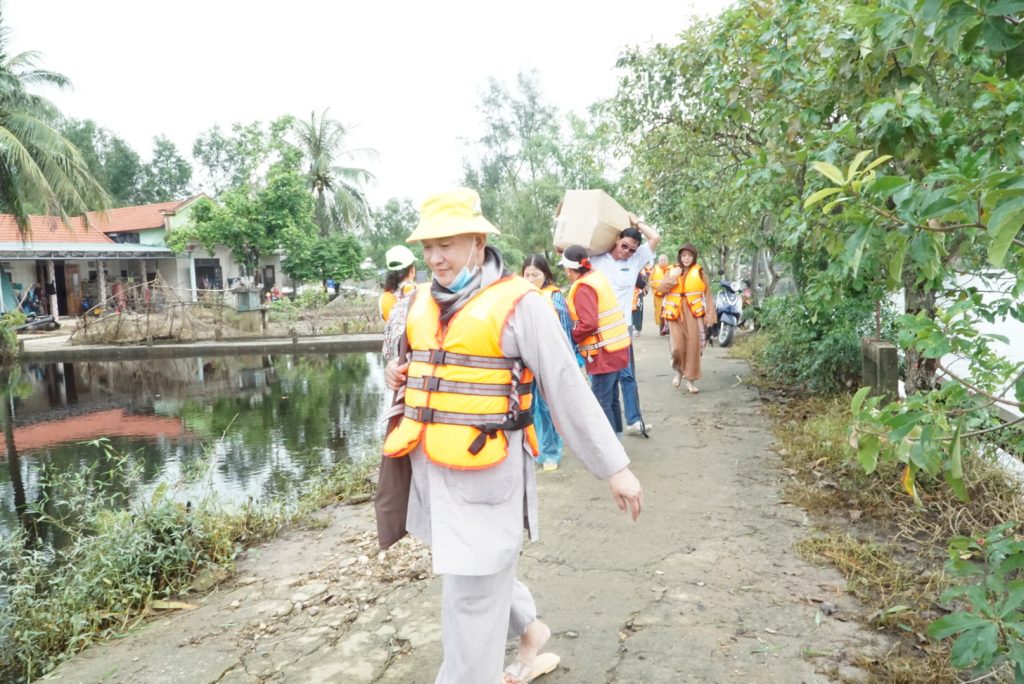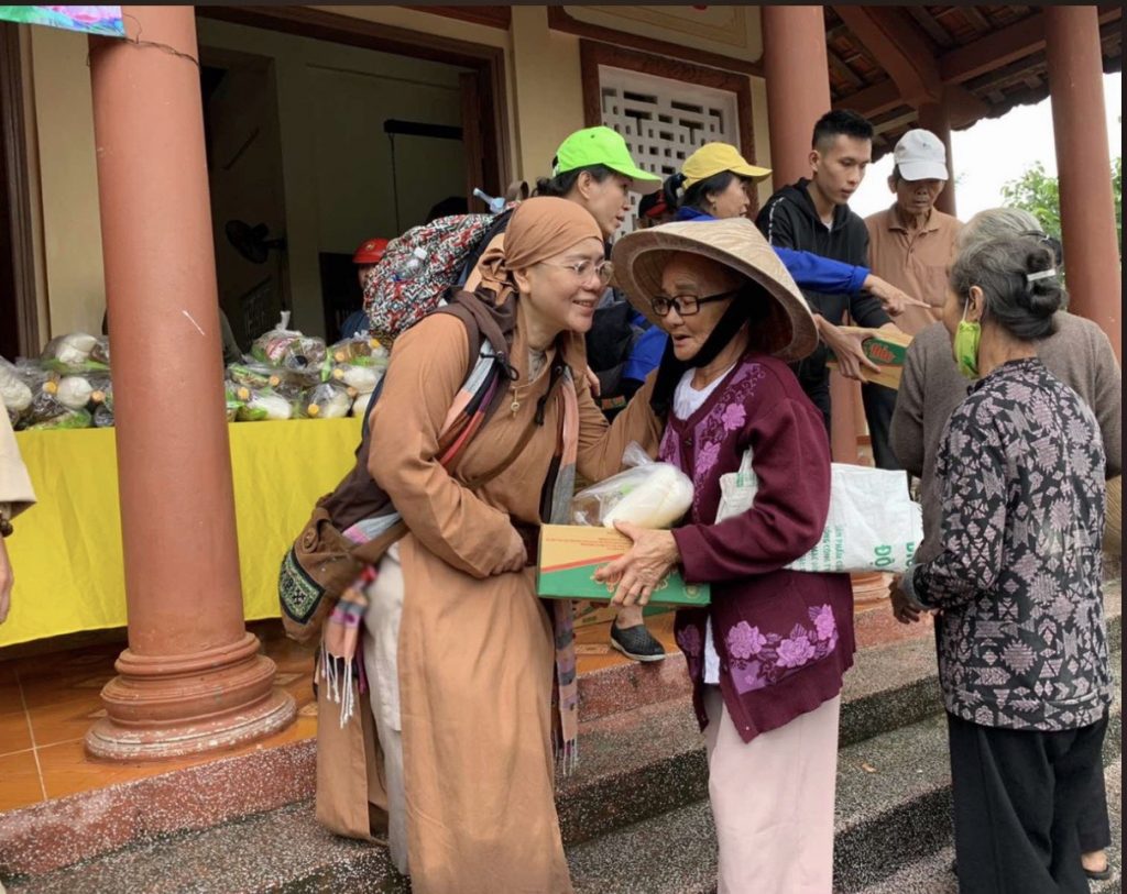 Tại các điểm trao quà, SC. Thích Nữ Huệ Thiện có lời hỏi thăm sức khỏe, động viên bà con cố gắng vượt qua khó khăn, sớm khôi phục sản xuất để phát triển đời sống ngày càng tốt hơn. Đồng thời, Sư cô cũng gửi lời tri ân đến quý Phật tử các nhà hảo tâm đã cùng chung tay chia sẻ mang những phần quà thiết thực này trao tận tay bà con.