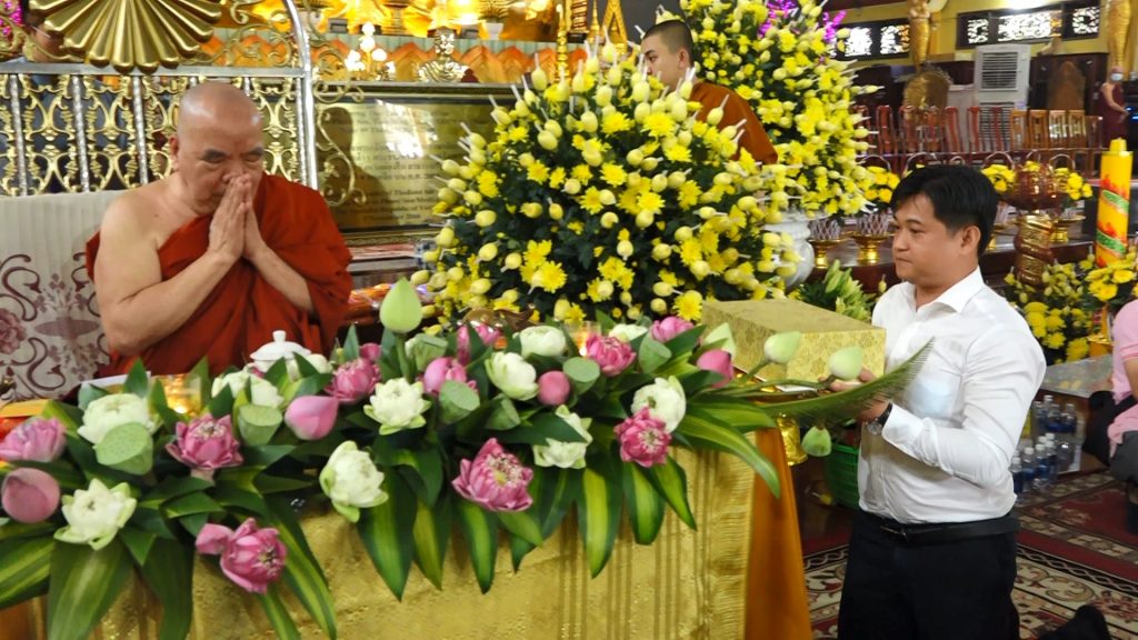 Đại lễ dâng y năm nay do đại thí chủ Lê Thị Giàu - Công ty Bình Tây mì chay Lá Bồ Đề phát tâm cúng dường theo nghi thức truyền thống hệ phái Phật giáo Nam tông Khmer dưới sự chứng minh của đông đảo chư Tăng.