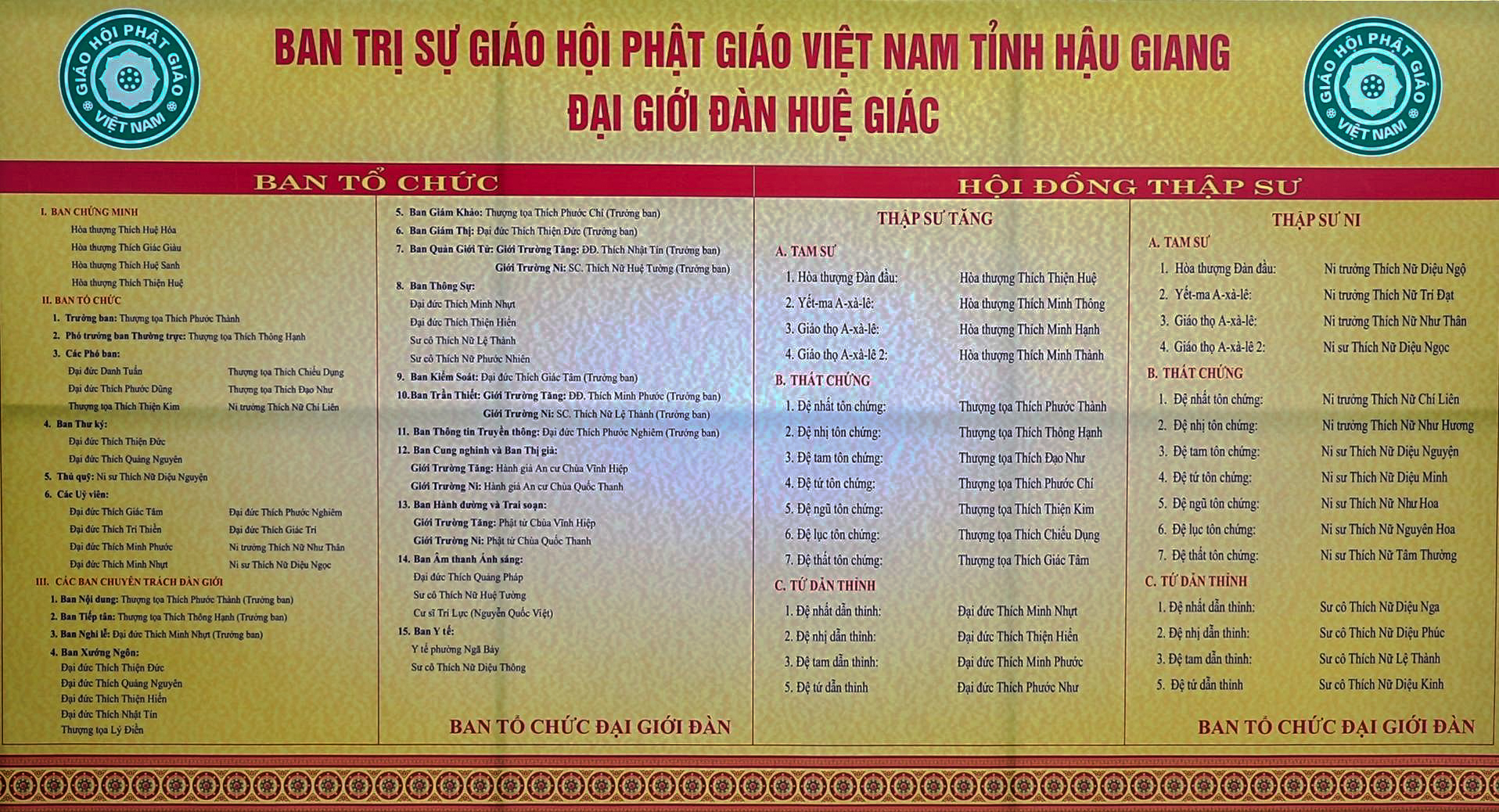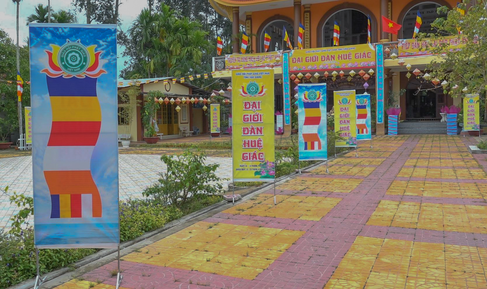Ghi nhận tại 2 điểm truyền giới, cờ hoa, băng rôn, biểu ngữ đã được bố trí đầy đủ, các bảng thông tin về Đại giới đàn Huệ Giác như: Tiểu sử HT. Thích Huệ Giác, chương trình; Ban Tổ chức; Hội đồng giới sư; Ban khảo hạch, Ban quản giới tử cả Tăng lẫn Ni. Một khung cảnh nhiều màu sắc hiện ra trước mắt nhưng không kém phần trang nghiêm. Nổi bật lên tất cả là màu vàng giải thoát.