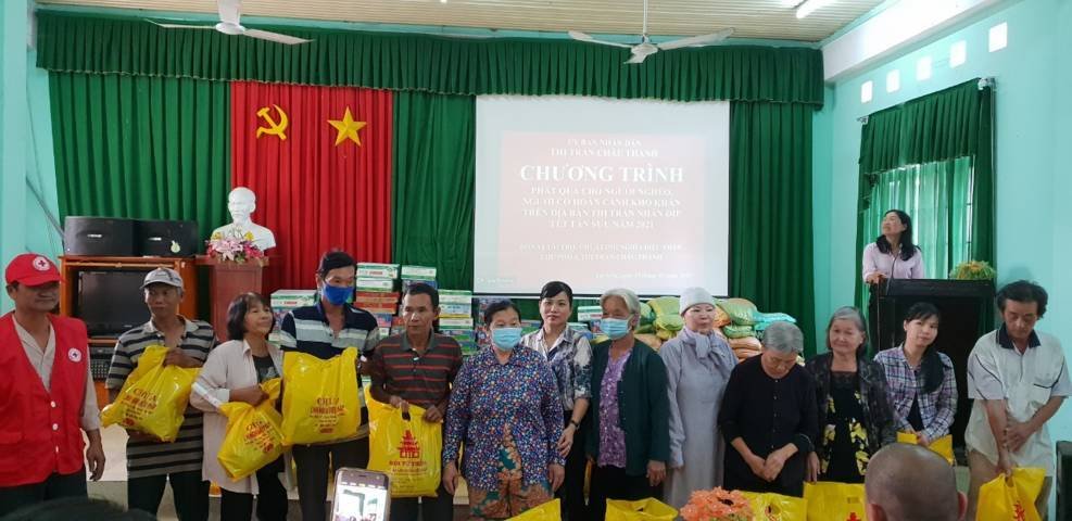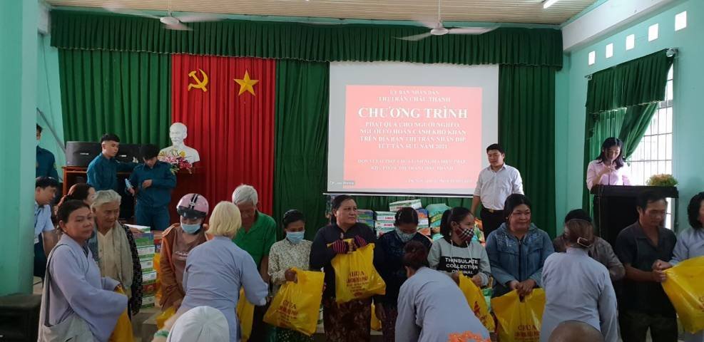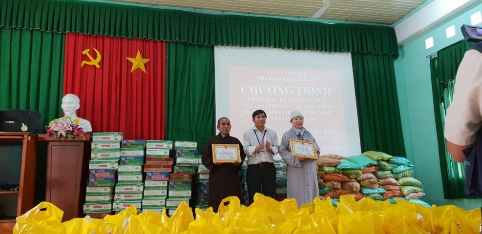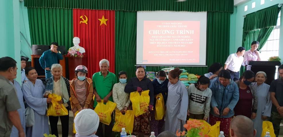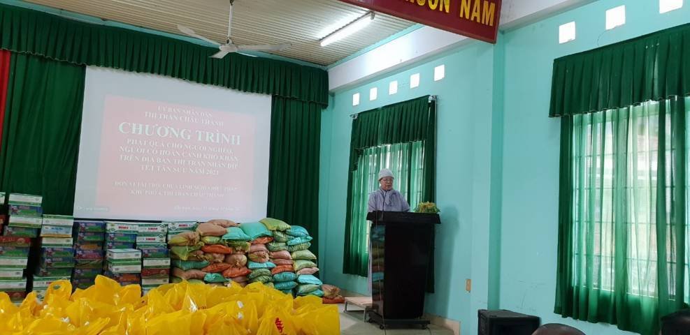 SC.Thích Nữ Hạnh Linh thay mặt các Mạnh thường quân cùng quý Phật tử phát biểu: "nhân dịp xuân Tân Sửu nhằm chia sẻ sự khó khăn của nhân dân tại địa phương, SC.Hạnh Linh cùng chư Tôn đức kêu gọi sự ủng hộ của các Mạnh thường quân, quý Phật tử để giúp đỡ cho đồng bào khó khăn, người già neo đơn, diện chính sách 100 phần quà nghĩa tình gồm mì, gạo, nhu yếu phẩm…. mỗi phần trị giá 350.000 đồng. SC.Hạnh Linh trao tặng UBND thị trấn Châu Thành 20 phần quà, mỗi phần 500 nghìn đồng. Tổng số tiền phát quà là 45 triệu đồng.