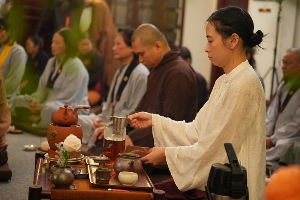 Trong tiếng chuông nhẹ vang, Ban Nghi lễ cung rước chư tôn đức quang lâm chứng minh, mở ra không gian thưởng thức nghệ thuật Trà Đạo – nơi chén trà không chỉ là thức uống, mà là phương tiện quán chiếu nội tâm, kết nối con người với chính mình và với nhau.