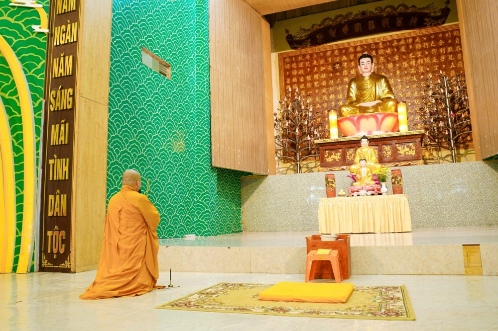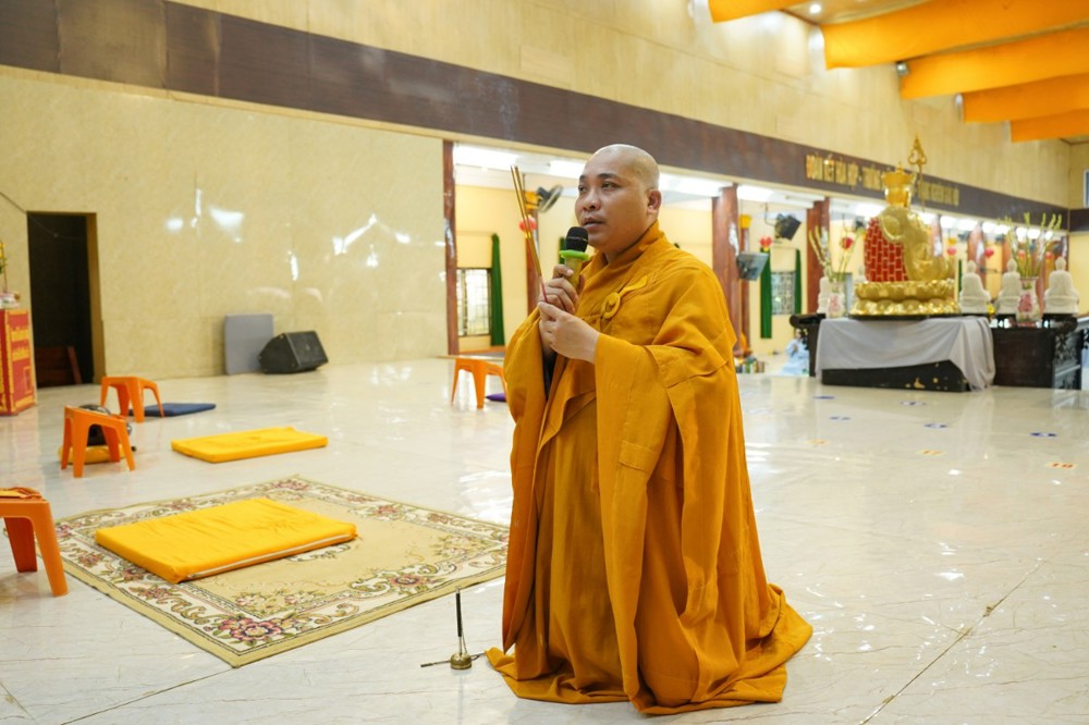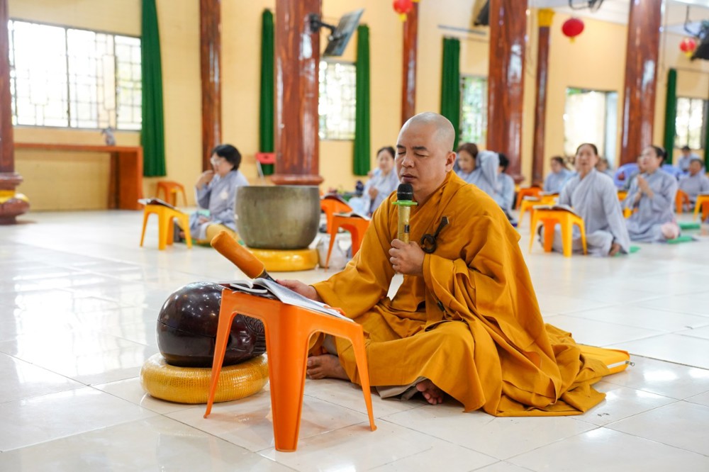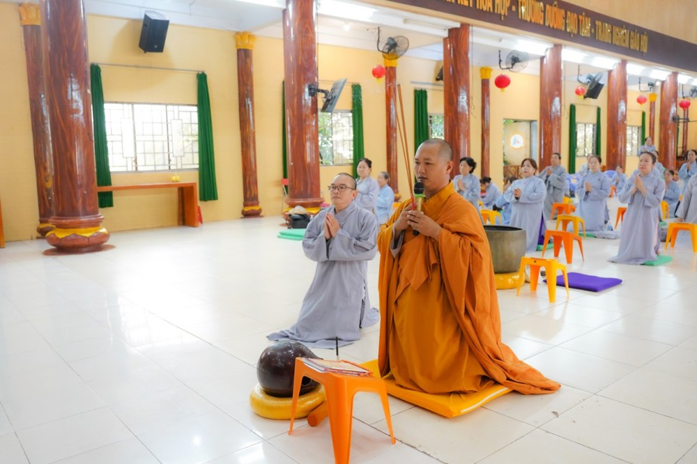 Tiếp đó, đại chúng đồng tụng kinh Sám hối và lạy Phật hồng danh dưới sự hướng dẫn của Đại đức Thích Định Tín, nhằm gột rửa phiền não và nuôi lớn niềm tin thanh tịnh nơi Tam bảo. Những lời kinh hòa cùng tiếng chuông, tiếng mõ vang vọng đã trở thành nguồn năng lượng an lành lan tỏa khắp đạo tràng.