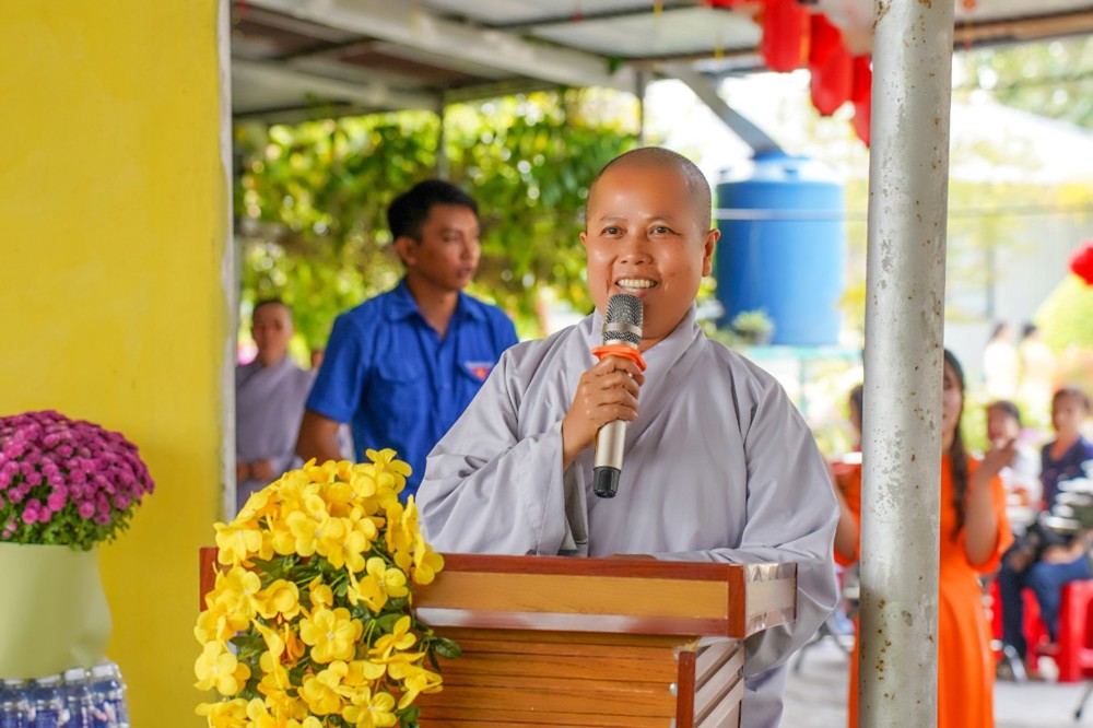 Phát biểu tại buổi lễ, Sư cô Thích Nữ Diệu Mỹ, thay mặt Điểm SHTGTT Pháp Vân, bày tỏ lòng tri ân sâu sắc đến các cấp chính quyền địa phương đã tạo điều kiện thuận lợi để chương trình được tổ chức thành công. Đồng thời gửi lời cảm ơn đến quý mạnh thường quân, quý Phật tử, đội ngũ y bác sĩ thiện nguyện và lực lượng thanh niên tình nguyện đã chung tay góp sức, góp phần mang đến không khí vui tươi, ấm áp nghĩa tình cho phiên chợ. Nhân dịp năm mới, Sư cô kính chúc quý vị đại biểu và toàn thể bà con một năm mới an vui, hạnh phúc, vạn sự hanh thông.