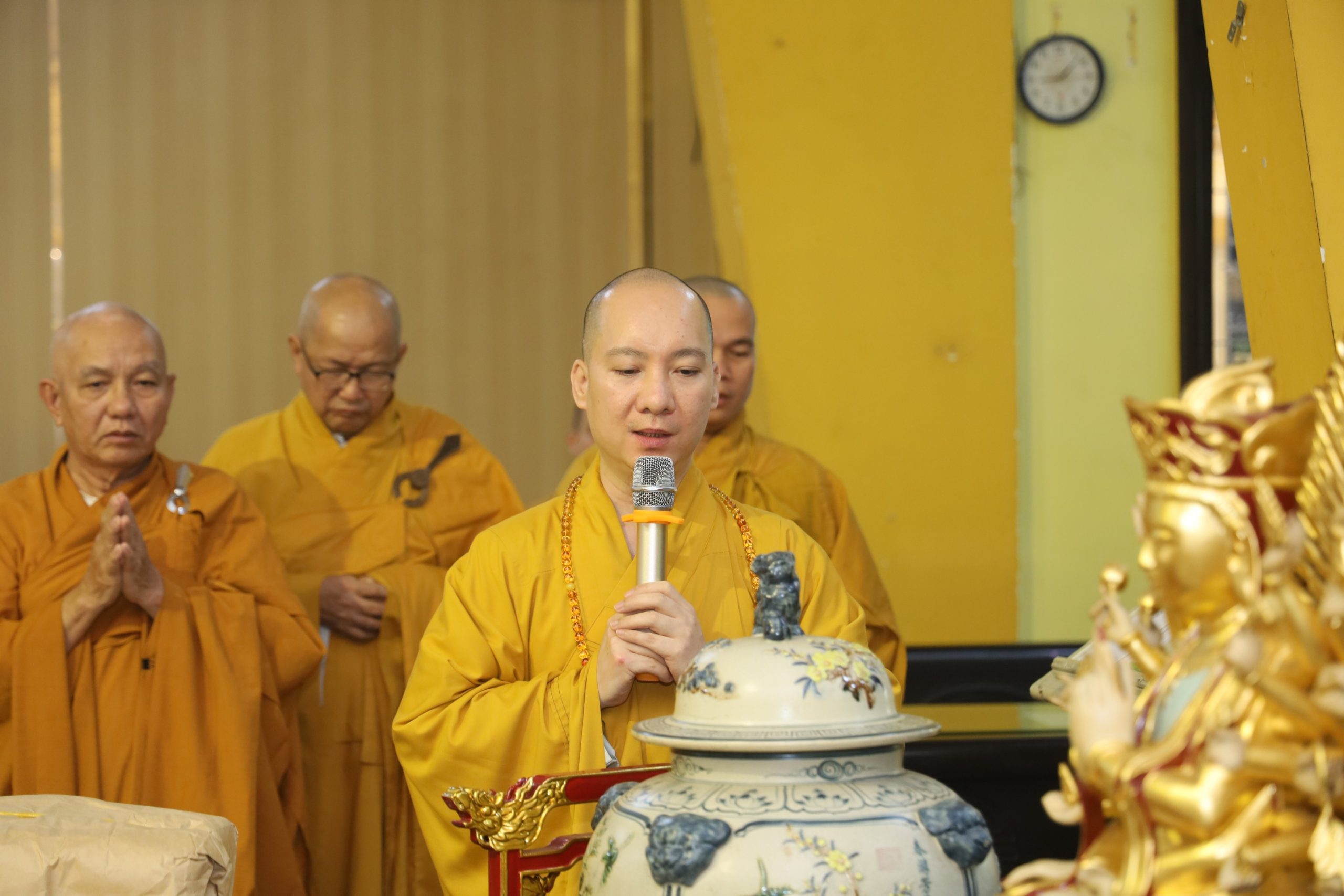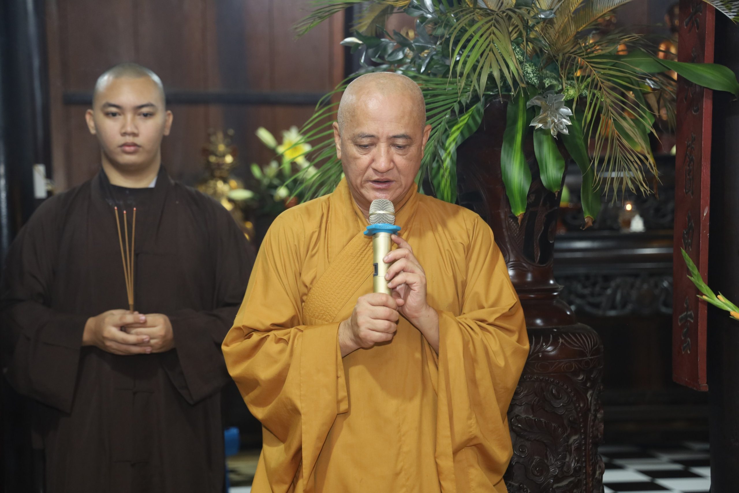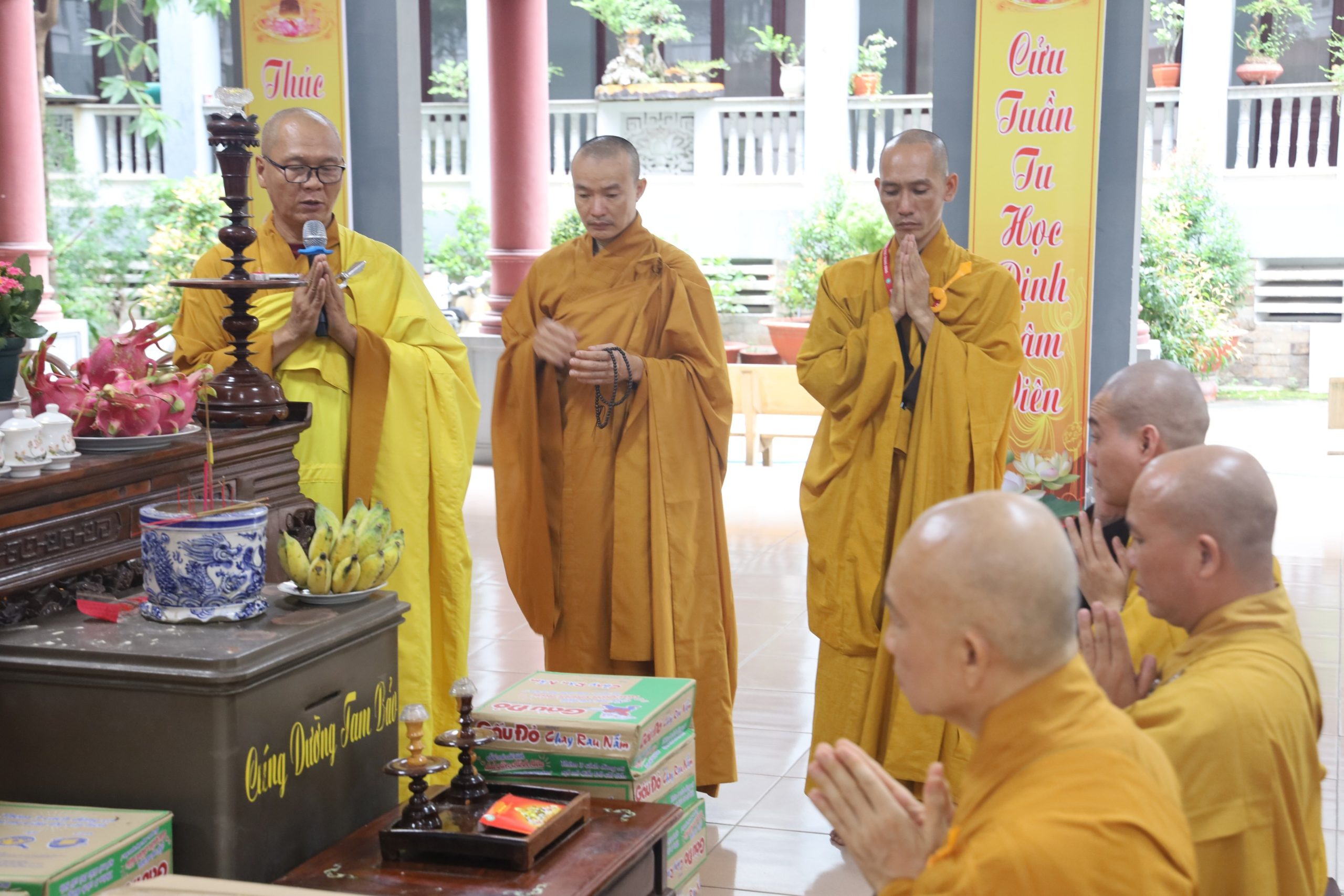 Tháp tùng có TT. Thích Giác Quang - Thành viên tổ Công nghệ thông tin VP2 TƯGH, Trưởng Ban Nghi lễ Phật giáo huyện Bình Chánh, trụ trì chùa Từ Quang; ĐĐ. Thích Như Phát - Thành viên tổ Công nghệ thông tin VP2 TƯGH, Chánh Thư ký Ban TT-XH PG huyện, Phó trụ trì Tu viện Kim Cang; NS. Thích Nữ Huệ Bảo - UVTT Ban TT-XH PG huyện, Trụ trì chùa Liên Nghiêm; CTY TNHH TM-SX Tàu Hủ Tươi Nắng Mai Phát, cùng chư Tôn đức Tăng Ni, thành viên Ban TT-XH, Ban Nghi lễ, quý Phật tử đi cùng.
