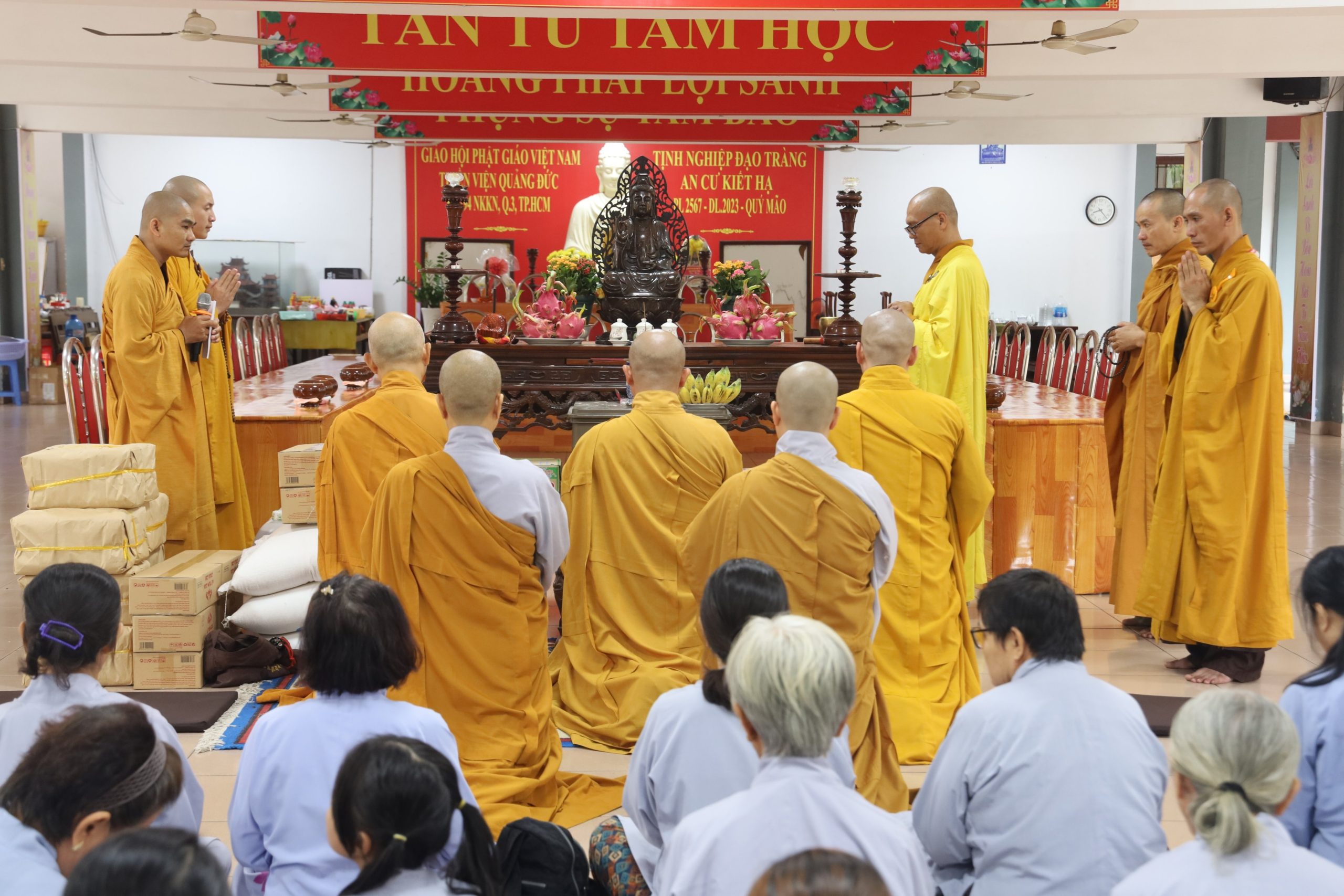 Đặc biệt tại trường hạ Tổ đình chùa Vĩnh Nghiêm đại diện Ban TT-XH Phật giáo TP.HCM -TT. Thích Nguyên Chiếu, NT.Thích Nữ Từ Nhẫn, NS. Thích Nữ Huệ Tuyến đã tác pháp cúng dường trai tăng lên chư Tôn đức hành giả an cư tại hạ trường.