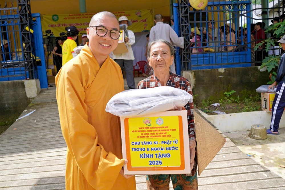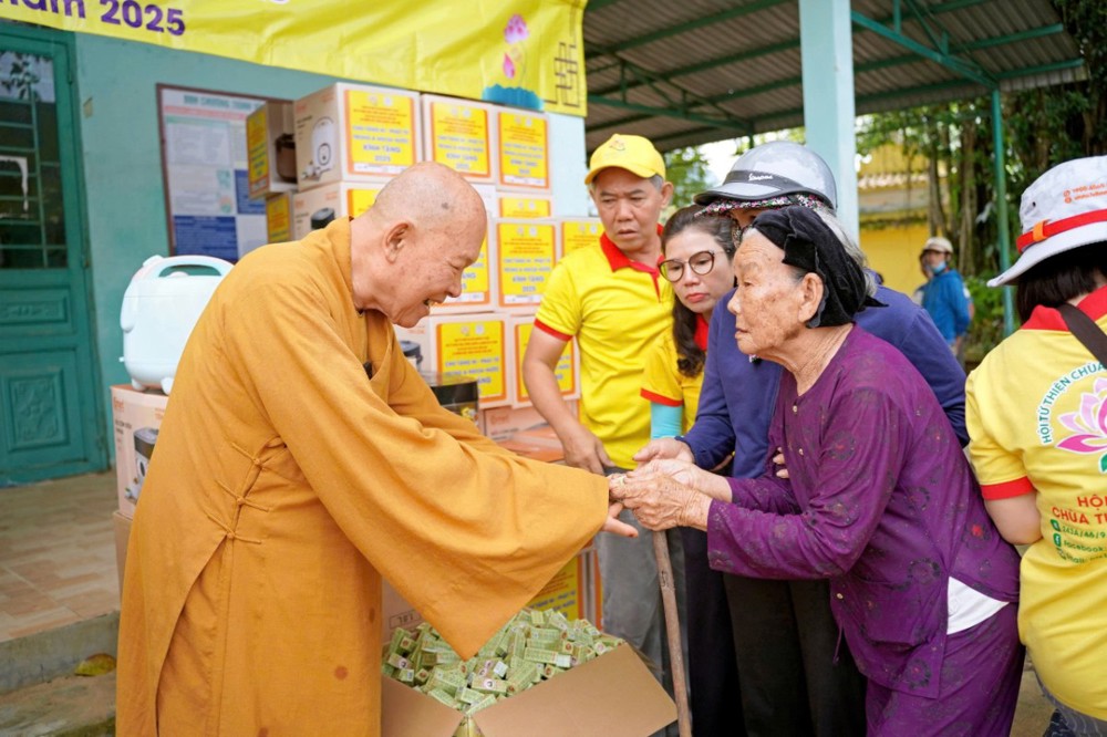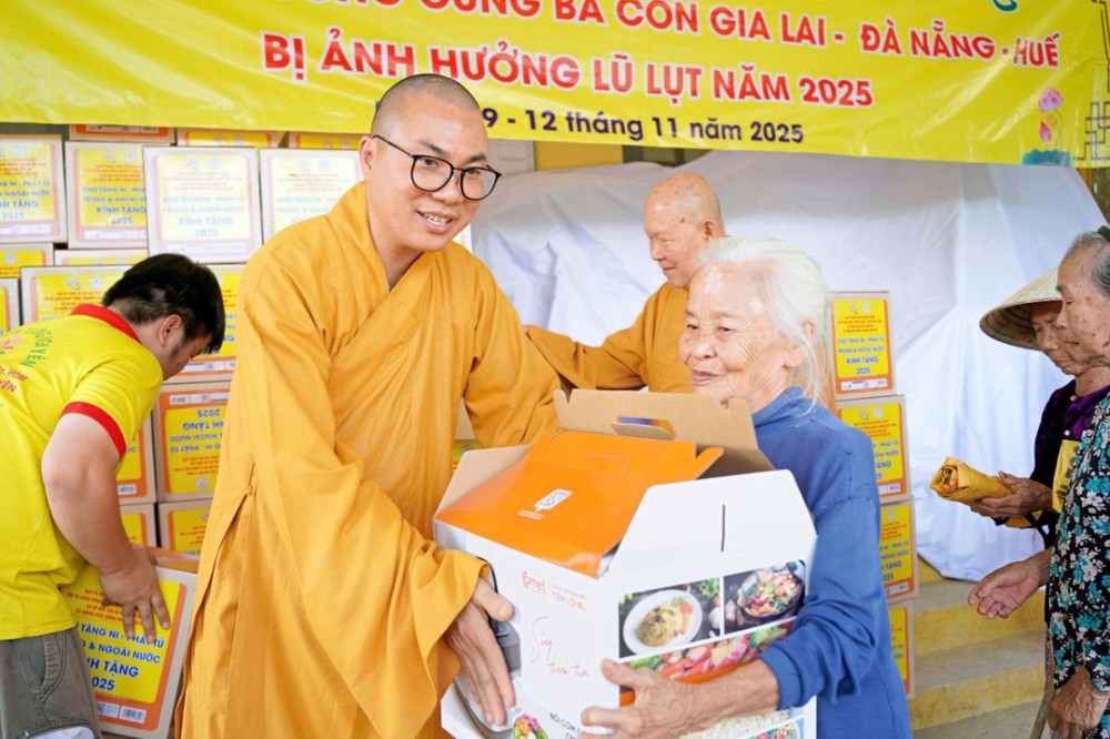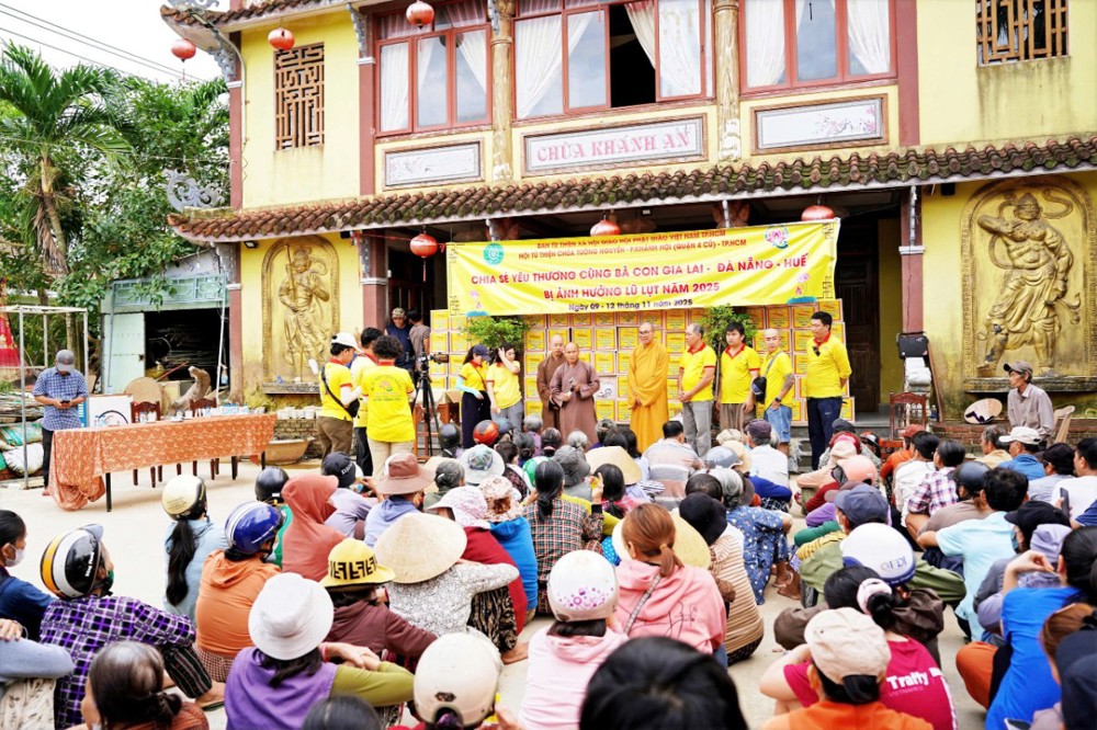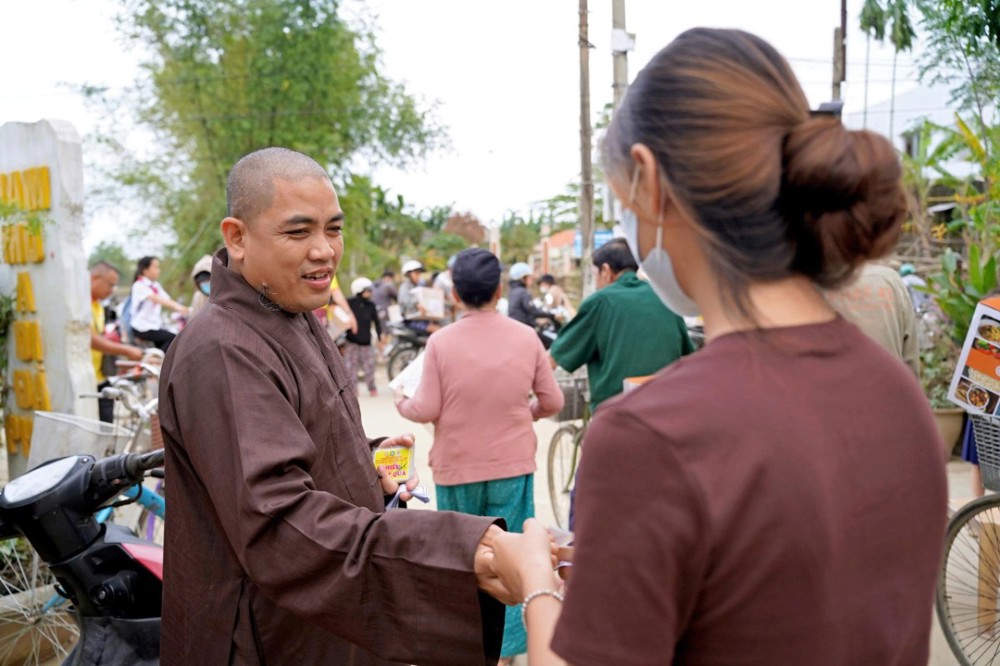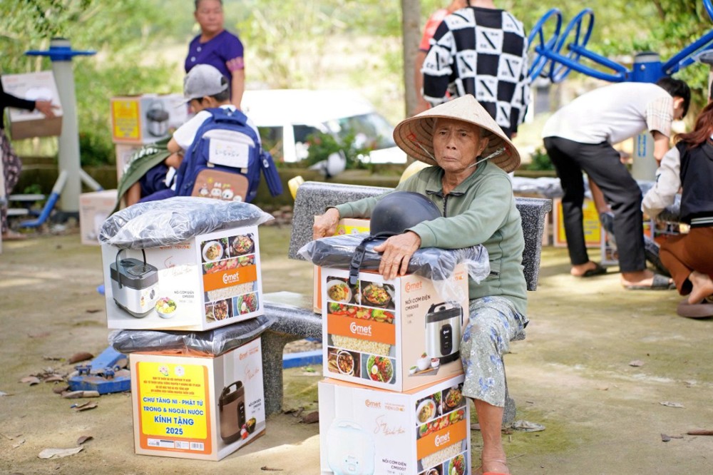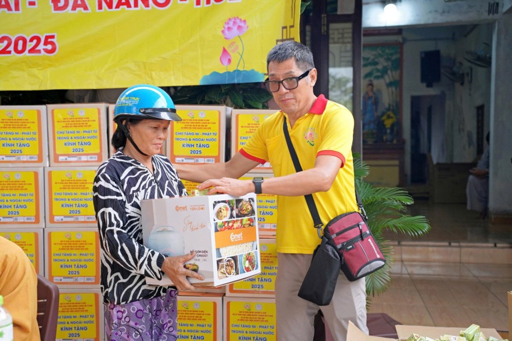 Tại Đà Nẵng và các xã lân cận, đoàn đã trao 1.500 phần quà tại xã Quế Phước, chùa Liên Hương (xã Quế Xuân 1), chùa Thạnh Bình (xã An Hương) và chùa Khánh An (xã Duy Xuyên). Mỗi phần quà gồm một nồi cơm điện, chăn đắp và dầu xoa, tổng kinh phí thực hiện hơn 1,5 tỷ đồng – tất cả được đóng góp từ tấm lòng từ bi của Tăng Ni, Phật tử, mạnh thường quân trong và ngoài nước.