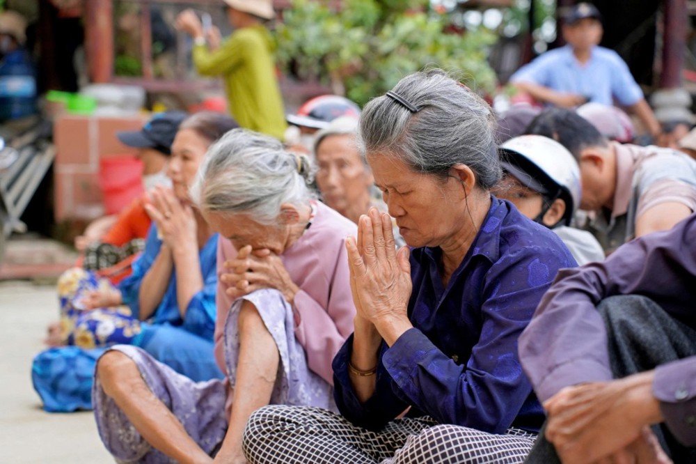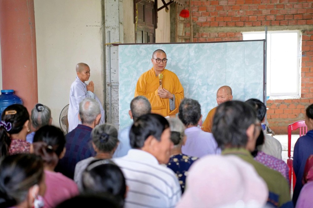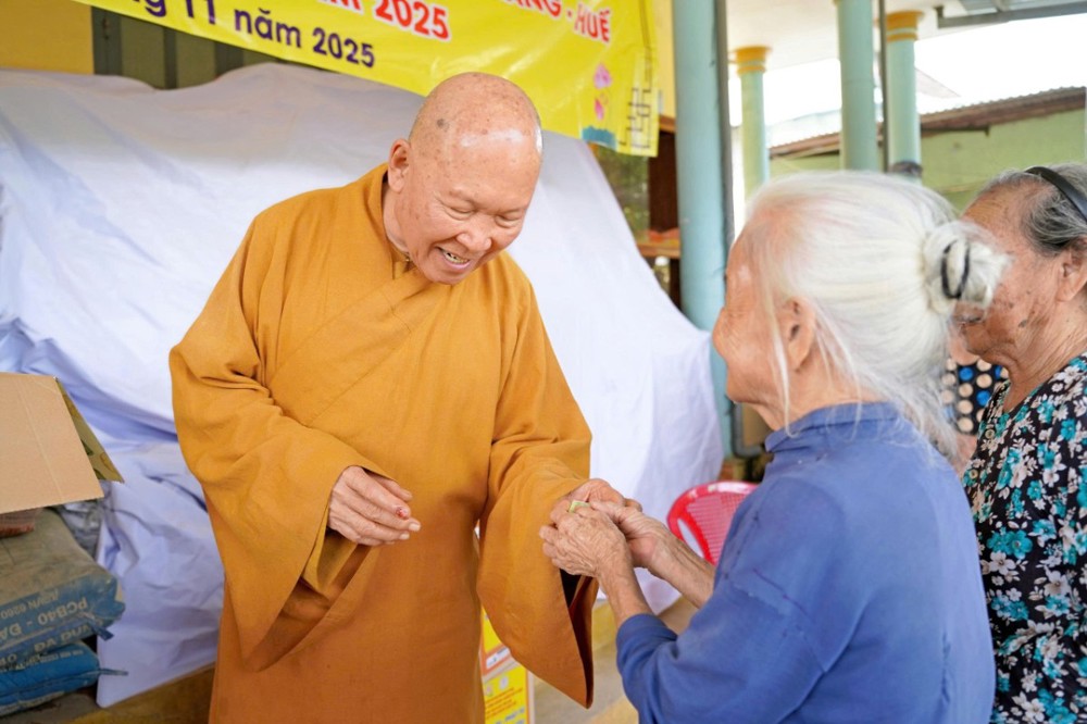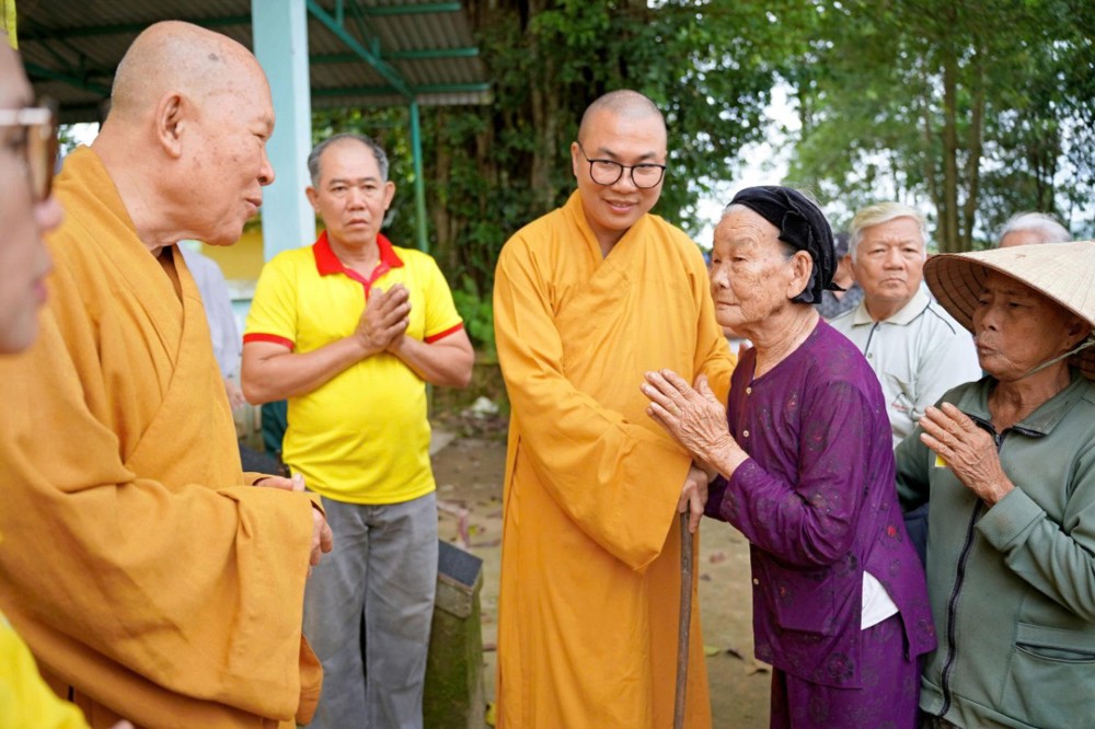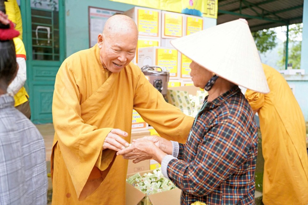 Tại mỗi điểm trao quà, Trưởng lão Hòa thượng đã ân cần thăm hỏi, chia sẻ, động viên bà con sớm vượt qua mất mát, ổn định cuộc sống. Ngài khuyên người dân giữ vững niềm tin, thường xuyên niệm Phật để tâm an, thân an, được chư Phật gia hộ trong những lúc hoạn nạn.