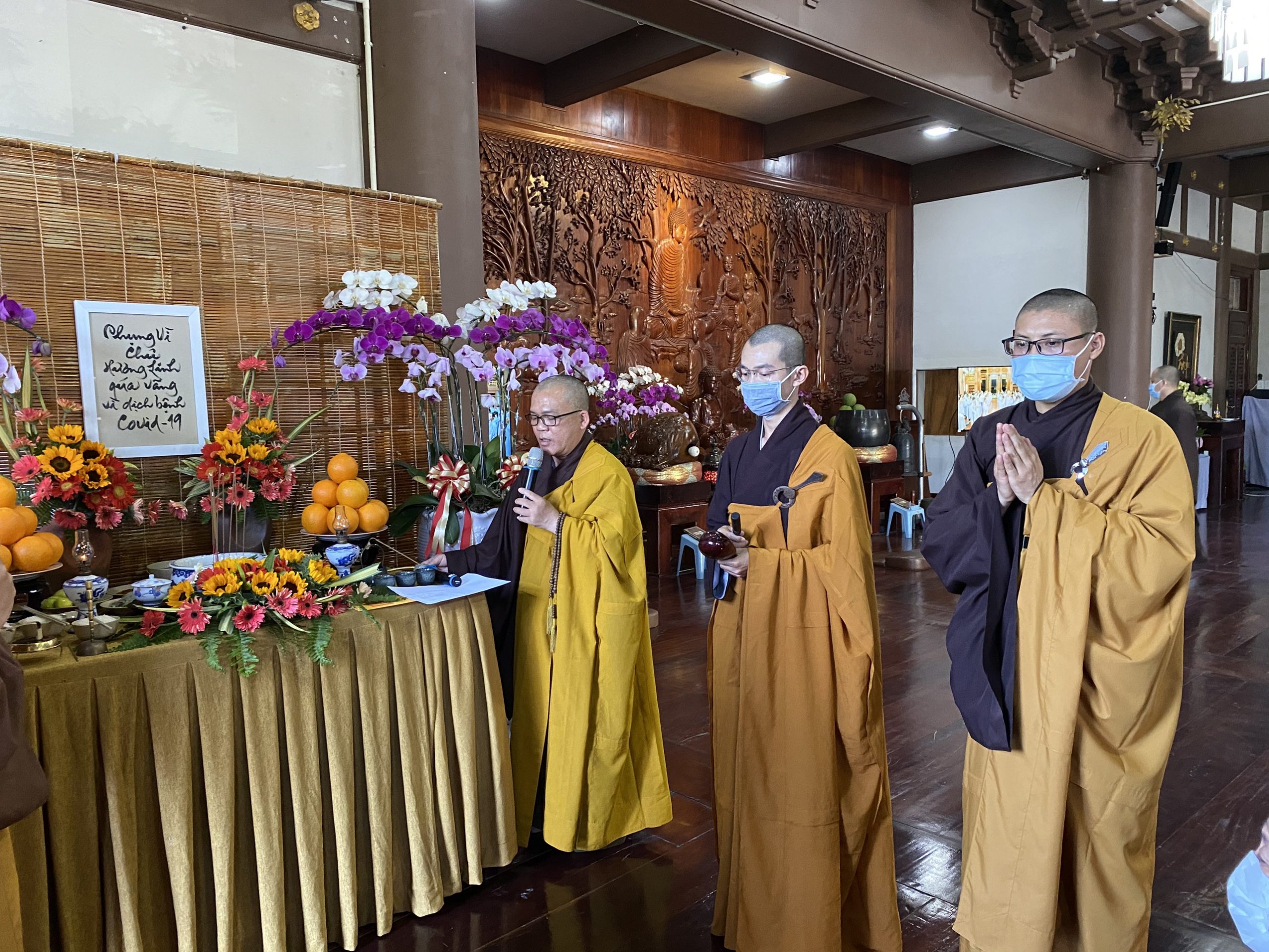 Trước điện Phật, Thượng tọa Viện chủ Tu viện Khánh An đã dâng hương lễ Phật, khai kinh cầu an, cầu siêu cho đồng bào người Việt tại Châu Âu. Trong giây phút thiêng liêng hội chúng lòng thành kính đồng hướng về Tam Bảo, nhất tâm cầu nguyện cho cộng đồng người Việt trên thế giới và Châu Âu được nhanh chóng vượt qua nạn dịch.