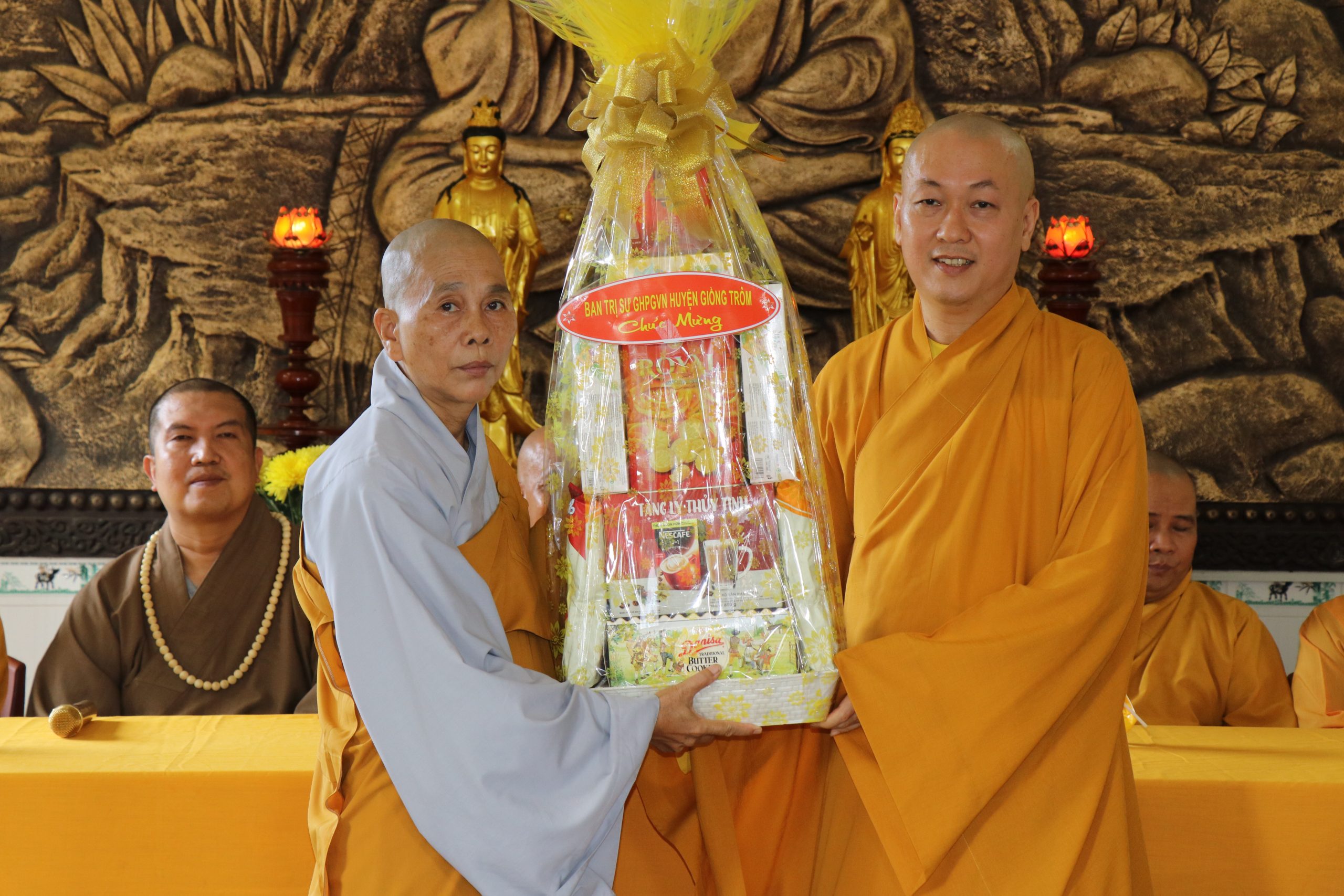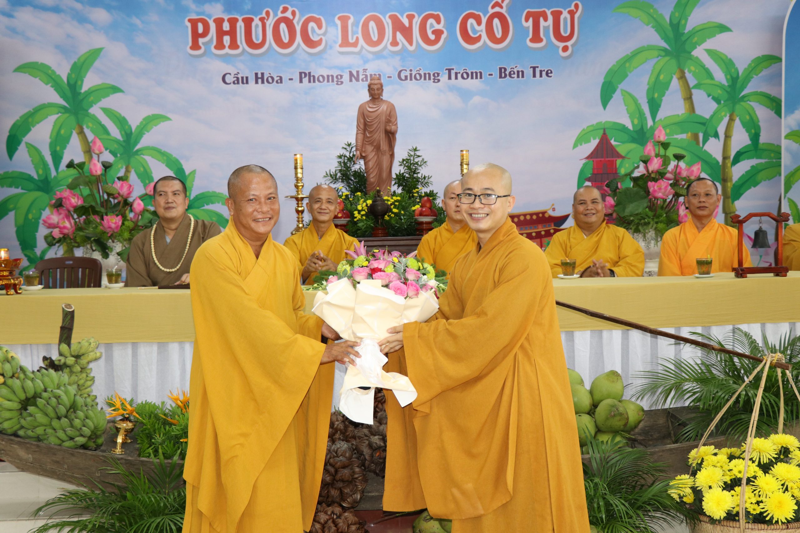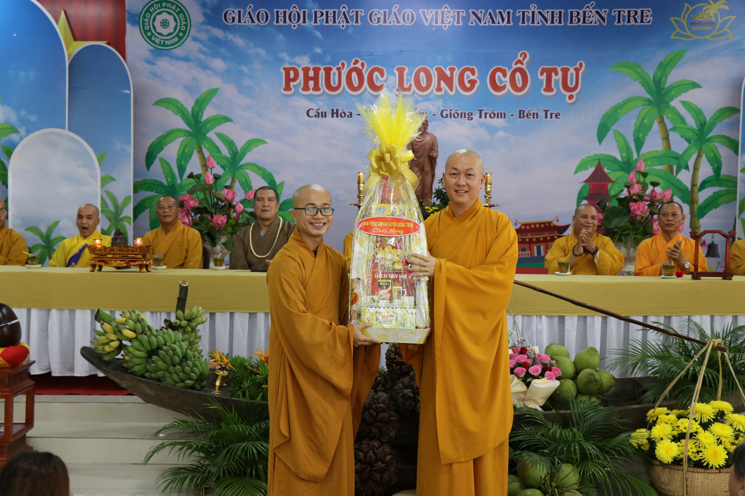 Ban Trị sự huyện tiếp đoàn có: TT. Thích Huệ Định – UV TT BTS, Trưởng Ban Hoằng pháp BTS PG tỉnh Bến Tre, Trưởng BTS PG huyện Giồng Trôm; ĐĐ. Thích Minh Tâm, ĐĐ. Thích Minh Phùng - đồng Phó BTS PG huyện; SC. TN Long Tiến - Trưởng Ban Hướng dẫn Phật tử BTS PG huyện; cùng Chư Tôn đức Ban thường trực BTS GHPGVN huyện Giồng Trôm huyện đồng tham dự.