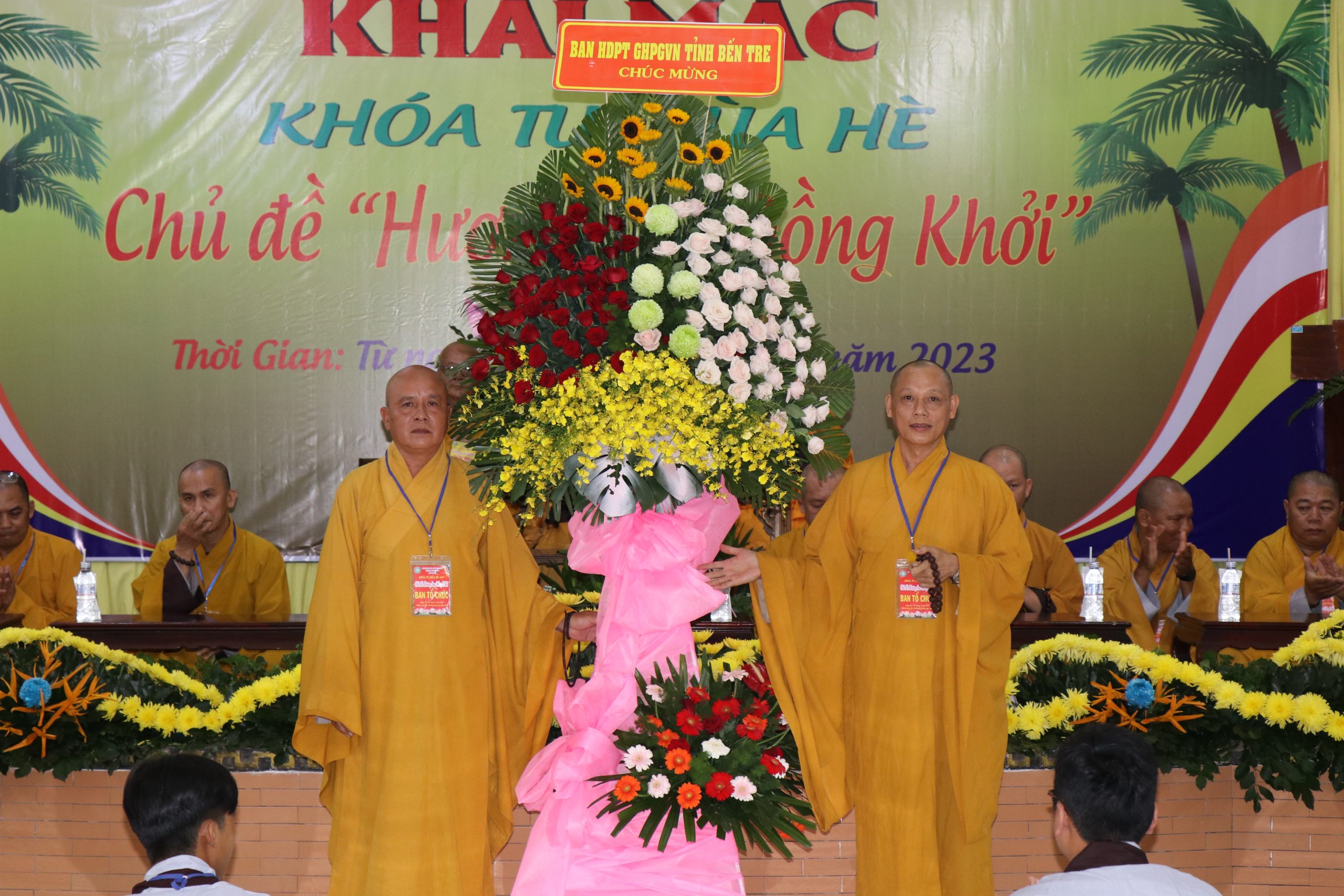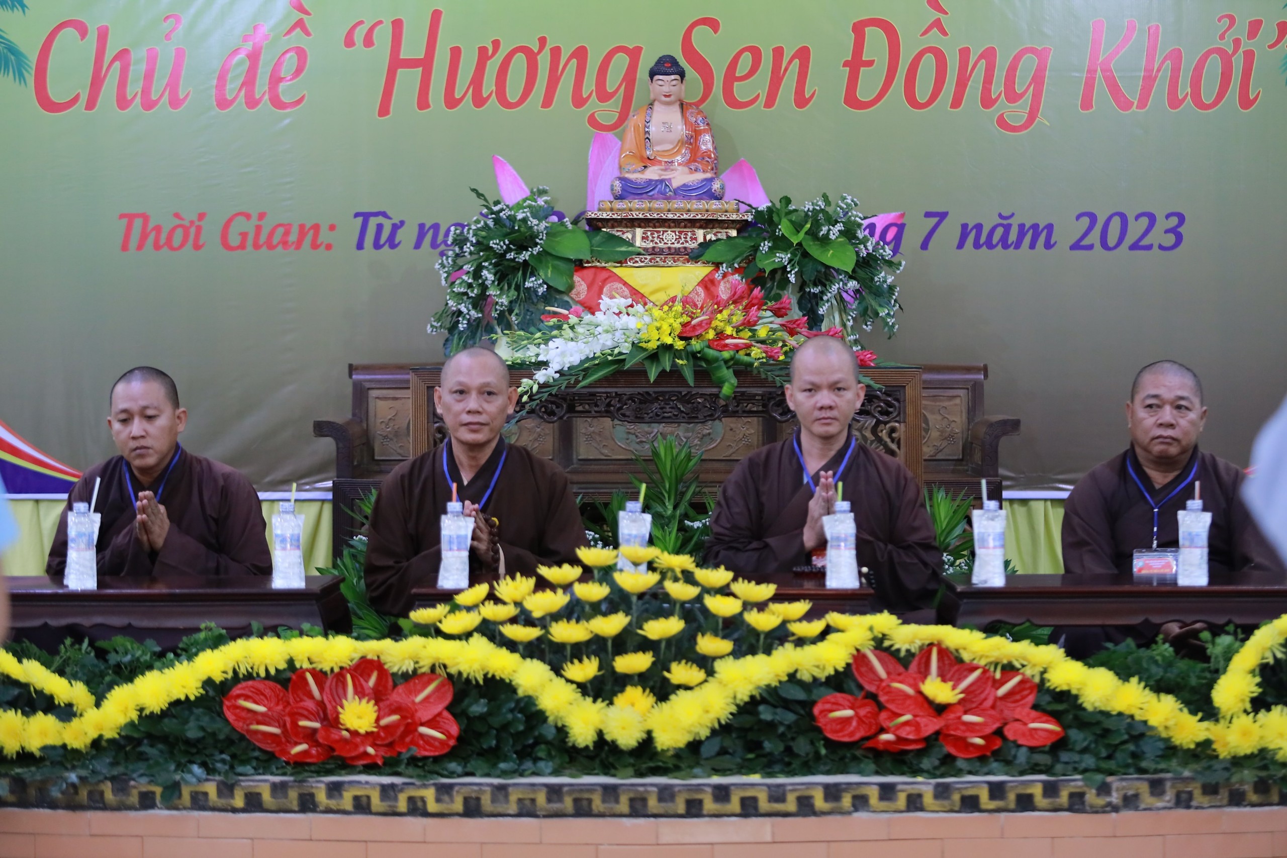 Tại buổi lễ TT.Thích Thanh Mẫn – trưởng ban tổ chức tuyên đọc khai mạc khóa tu mùa hè chủ đề “Hương Sen Đồng Khởi” Thượng tọa đã khẳng định “Thế hệ trẻ là tương lai, mầm xanh của Đạo pháp và đất nước. Việc giáo dục nhân cách và định hướng lý tưởng sống đã trở thành mục tiêu quan trọng không chỉ của Phật giáo mà là của toàn xã hội. Khoá tu mùa hè mở ra là cơ hội cho các bạn trẻ được trở về, được sống trong ánh đạo nhiệm mầu”. ĐĐ. Thích Minh Hải thay mặt Ban HDPT tỉnh tặng lẵng hoa chúc mừng buổi lễ.