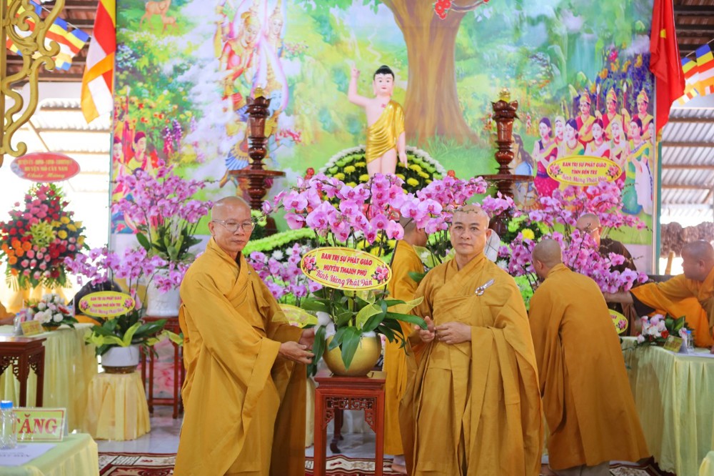 Sau phần văn nghệ chào mừng ngày Phật đản, đại diện BTS GHPGVN huyện đã trang trọng đón nhận những lẵng hoa chúc mừng từ các cấp chính quyền và tổ chức đoàn thể, HT. Thích Lệ Đức - Thành viên Hội đồng chứng minh TƯ, Chứng minh BTS PG tỉnh Bến Tre tuyên đọc Thông điệp Phật đản của Đức Pháp chủ GHPGVN gửi Tăng Ni và Phật tử nhân dịp Đại lễ Phật Đản Vesak PL.2569 – DL.2025.