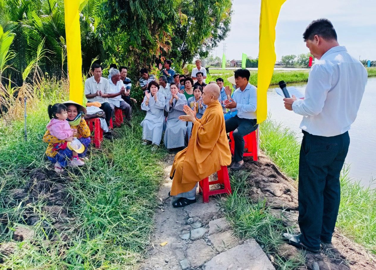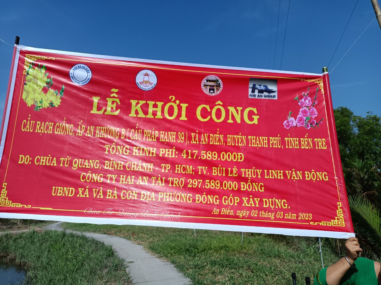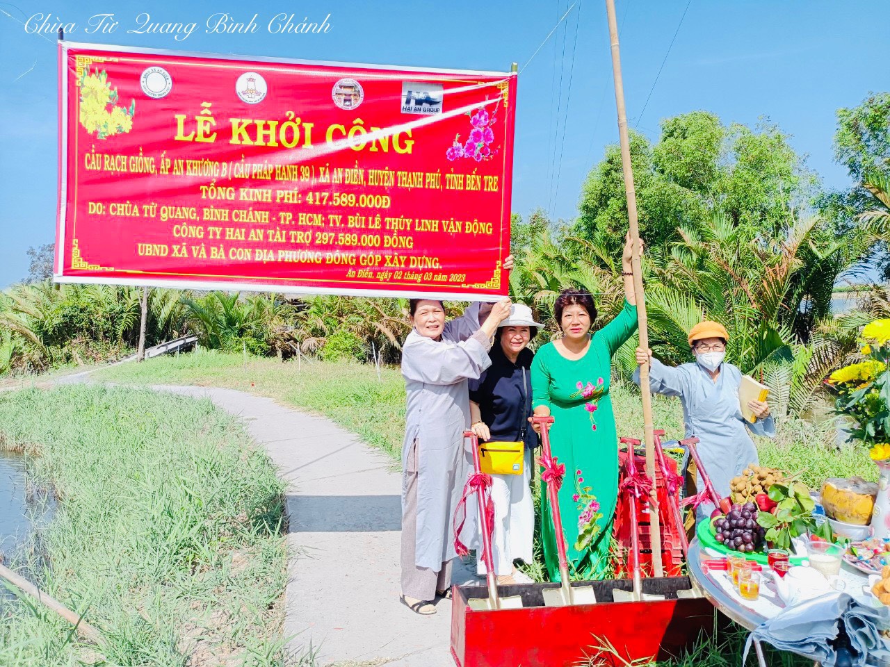 PSO - Sáng này 02/03/2023, Hội Bảo trợ Bệnh nhân nghèo TP.HCM, Chi hội Bảo trợ Bệnh nhân nghèo Liên Hoa Kim Cang, Ban TT-XH PG huyện Bình Chánh đã khởi công xây dựng cầu Rạch Giồng qui mô cầu dài 30m, rộng 3,3m, tải trọng 2,5 tấn, tại ấp An Khương B, xã An Điền, huyện Thạnh Phú, tỉnh Bến Tre. Tổng kinh phí xây dựng khoảng là 417.589.000 VNĐ (bốn trăm mười bảy triệu năm trăm tám mươi chín nghìn đồng). Đoàn do TT. Thích Giác Quang - Trưởng Ban Nghi lễ GHPGVN huyện Bình Chánh, Uỷ viên TT Ban Từ thiện Xã hội, trụ trì Chùa Từ Quang (huyện Bình Chánh, TP.HCM) làm trưởng đoàn. Tại buỗi lễ khởi công TT. Thích Giác Quang cho biết, sau thời gian khảo sát thấy được sự xuống cấp của cây cầu cũ, gây khó khăn cho người dân khi lưu thông đặc biệt là nguy hiểm cho các em nhỏ. Trước tình hình đó Ban TT-XH PG huyện Bình Chánh đã chung tay cùng chính quyền xây dựng cây cầu nông thôn mới, chăm lo đời sống nhân dân. Đồng thời cảm ơn các cấp lãnh đạo chính quyền, quý mạnh thường quân, đơn vị thi công, bà con nhân dân đã đồng lòng đóng góp cùng nhau thực hiện công trình hết sức ý nghĩa này và mong rằng cây cầu mới được xây dựng kiên cố đảm bảo để người dân được lưu thông thuận tiện, các em học sinh đi lại dễ dàng trong thời gian tới, nâng cao vị thế kinh tế xã hội địa phương.