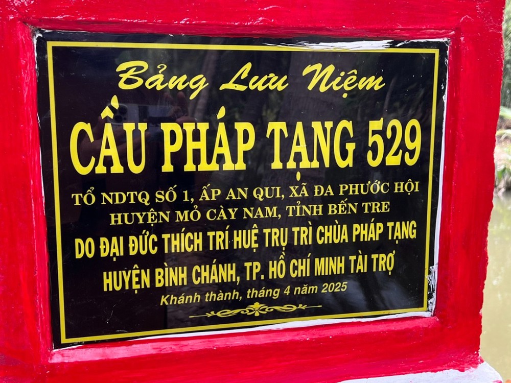Cụ thể, đoàn do Đại đức Thích Trí Huệ hướng dẫn đã bàn giao: 02 cây cầu giao thông nông thôn (10m x 3m) tại huyện Mỏ Cày Nam và huyện Châu Thành, trị giá 220 triệu đồng/cầu; 01 tuyến đường GTNT DA06 – Giai đoạn 2, dài 400m, rộng 3m tại ấp Đại Đình, xã Hữu Định, tổng kinh phí 1,4 tỷ đồng, trong đó Quỹ tài trợ 200 triệu đồng; 02 mái ấm tình thương cho các hộ nghèo có hoàn cảnh khó khăn, kinh phí xây dựng 60 triệu đồng/căn. Các buổi lễ khánh thành và bàn giao có sự tham dự của đại diện chính quyền tỉnh Bến Tre và địa phương, trong đó có bà Đặng Thị Phượng – Phó Chủ tịch UBMTTQVN tỉnh Bến Tre, cùng lãnh đạo các ban ngành và đông đảo bà con nhân dân.