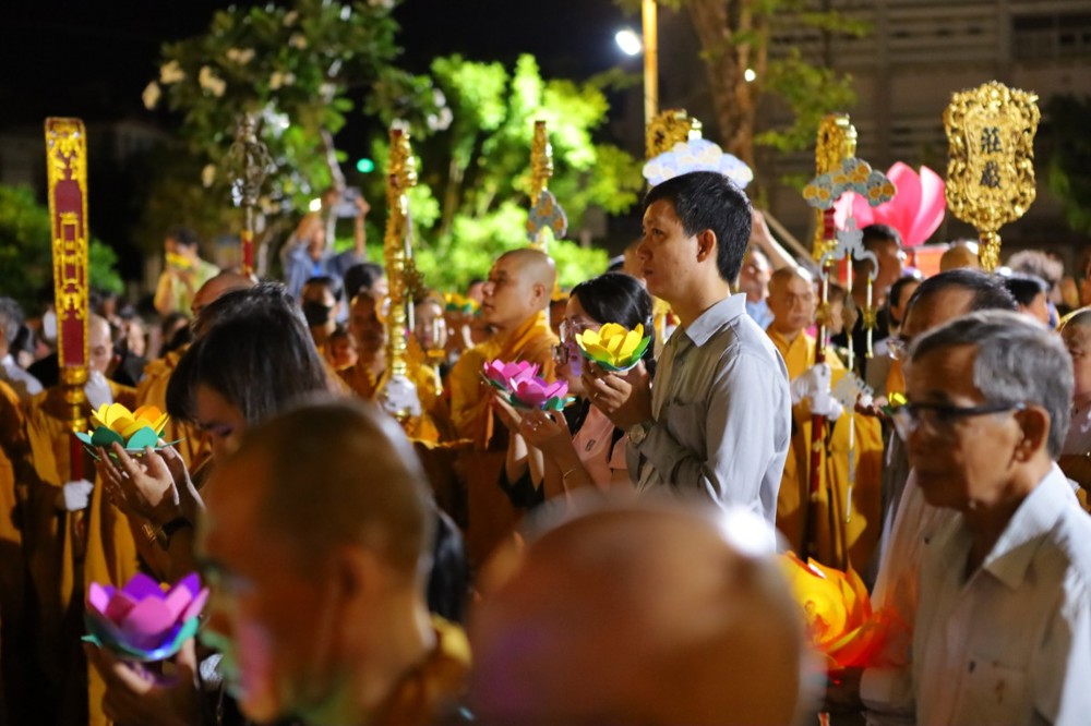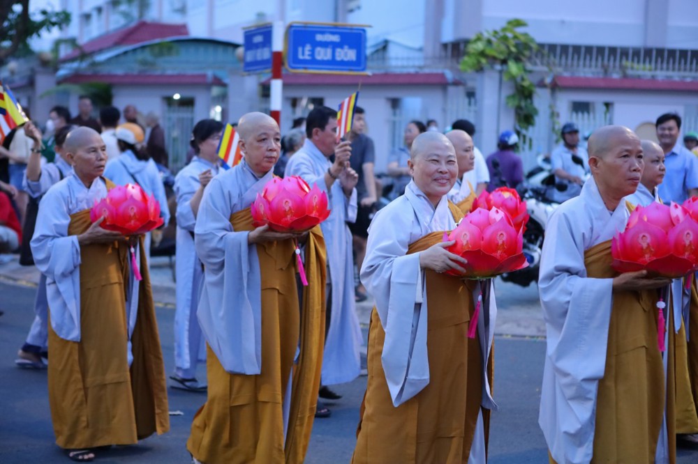 Trước đó, không khí đêm hoa đăng rộn ràng với nhiều màu sắc rực rỡ; Tăng Ni, Phật tử diễu hành với những đóa sen tỏa sáng trên tay như ánh sáng hào quang của đức Từ Phụ Bổn sư Thích Ca Mâu Ni sáng soi trong đêm tối đến niềm an vui và bình yên cho từng chúng sinh. Đoàn diễn hành trở nên rộn ràng, ấm áp, hân hoan hơn cùng với sự hòa nhập và cổ vũ nghiêm trang của đông đảo người dân hai bên đường. Nhiều người mang theo hoa, cờ Phật giáo để chào đón đoàn xe, tạo nên một khung cảnh trang nghiêm nhưng cũng đầy sức sống; Cờ Đạo, cờ Tổ quốc tung bay phất phới hai bên bờ hồ Trúc Giang lung linh, rực sáng, trong ngày kỷ niệm đức Phật Thích Ca Mâu Ni giáng trần.