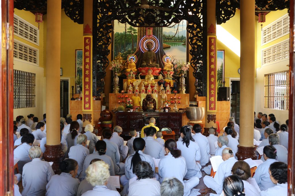 Sau buổi giao lưu, đạo tràng Phật tử được chư Tôn đức: ĐĐ. Thích Đức Niệm hướng dẫn thực hành nghi thức cúng ngọ, thọ trai buffer trong chánh niệm thiền định thật nhẹ nhàng thanh thoát.