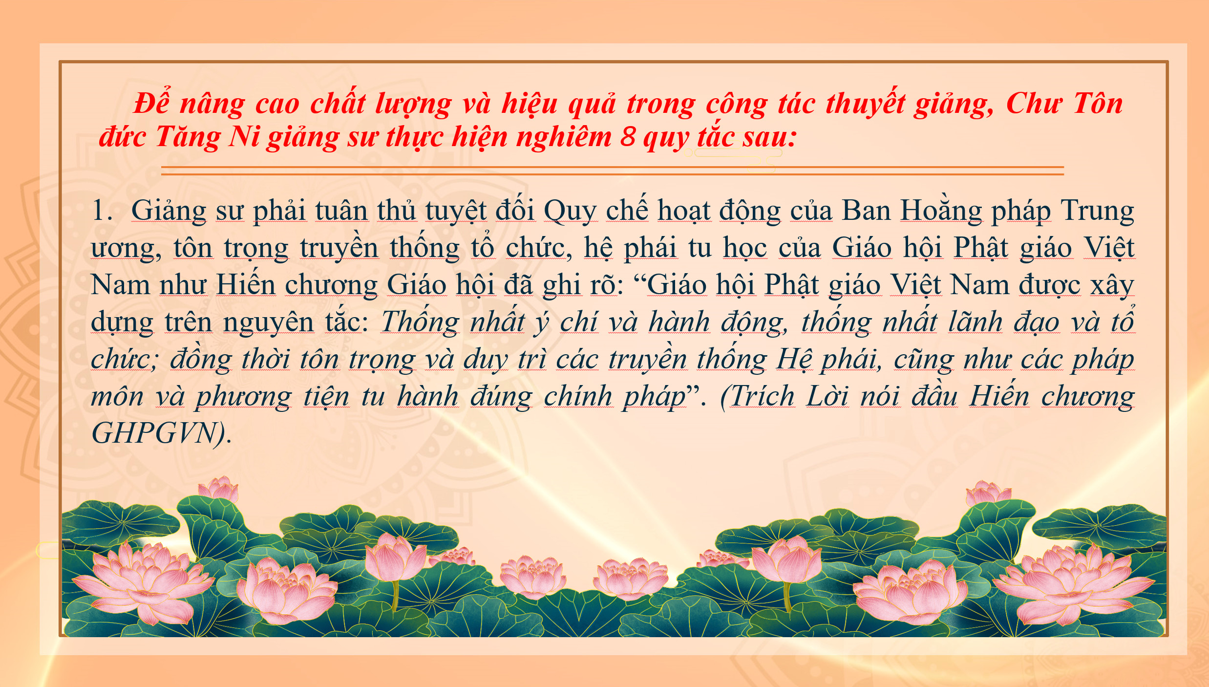 1. Giảng sư phải tuân thủ tuyệt đối Quy chế hoạt động của Ban Hoằng pháp Trung ương, tôn trọng truyền thống tổ chức, hệ phái tu học của Giáo hội Phật giáo Việt Nam như Hiến chương Giáo hội đã ghi rõ: “Giáo hội Phật giáo Việt Nam được xây dựng trên nguyên tắc: Thống nhất ý chí và hành động, thống nhất lãnh đạo và tổ chức; đồng thời tôn trọng và duy trì các truyền thống Hệ phái, cũng như các pháp môn và phương tiện tu hành đúng chính pháp”. (Trích Lời nói đầu Hiến chương GHPGVN).