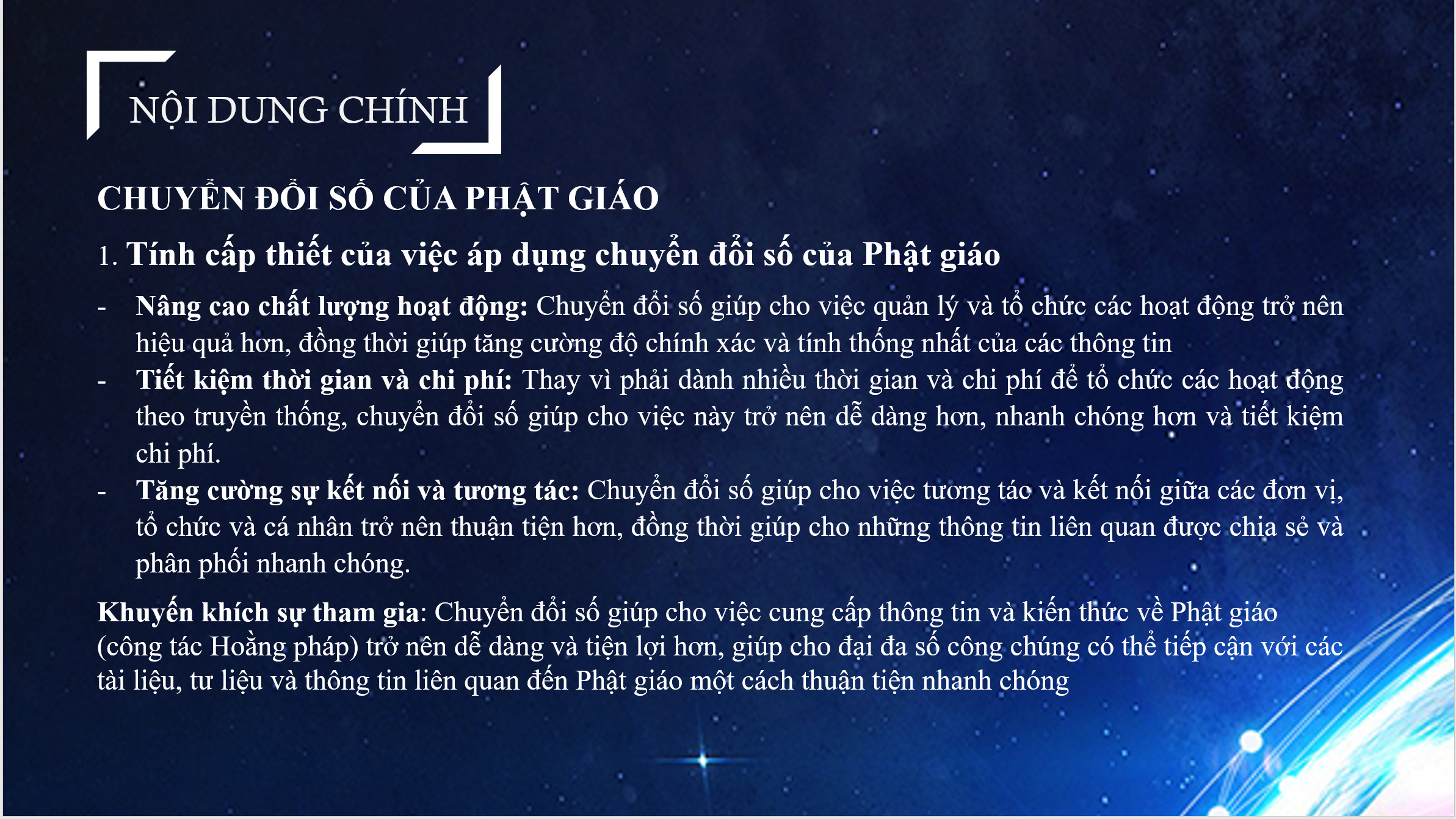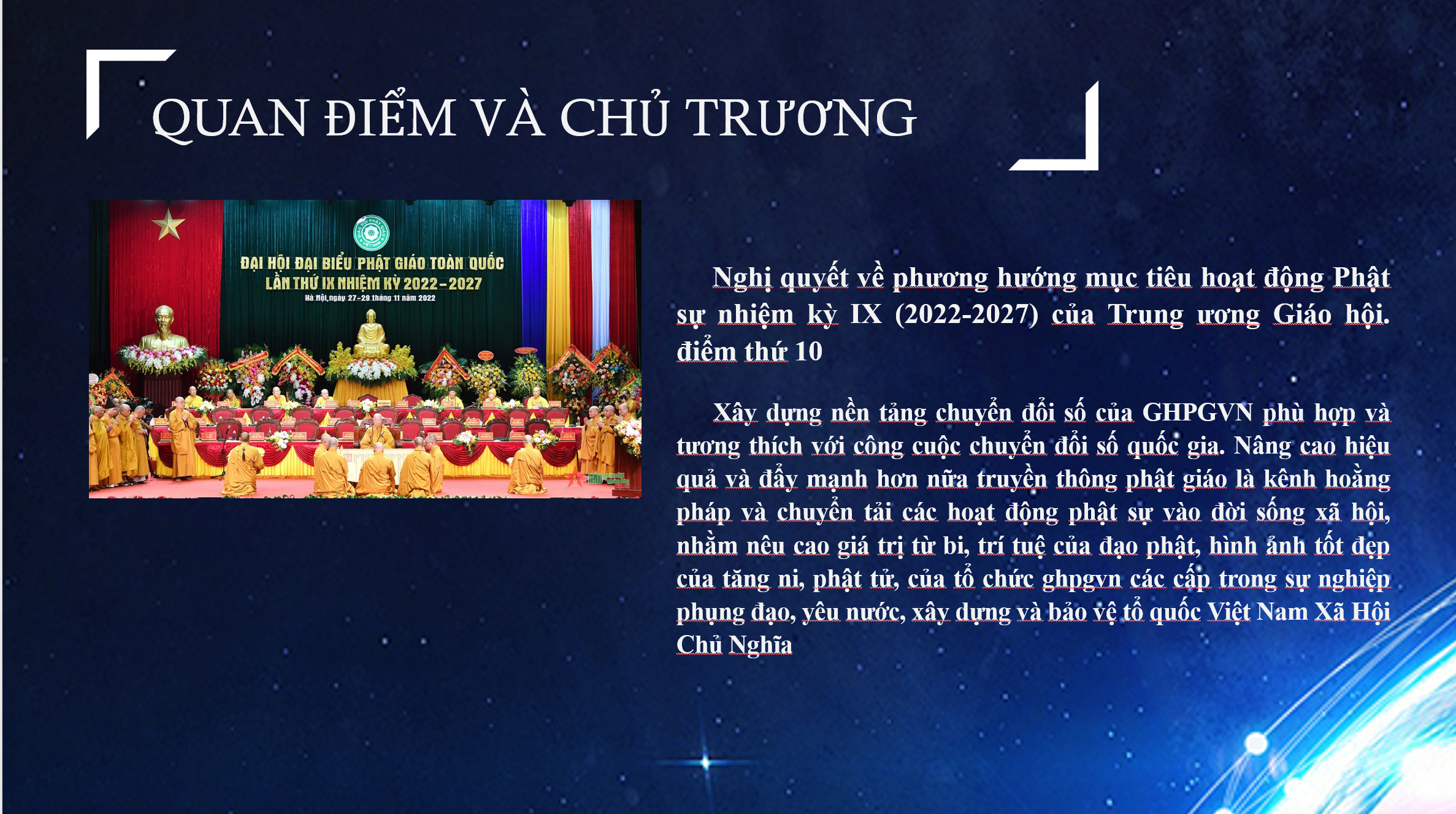 Tại buổi chia sẻ, Thượng tọa Thích Minh Nhẫn đã nêu lại điểm thứ 10 của Nghị quyết về phương hướng, mục tiêu hoạt động Phật sự nhiệm kỳ IX (2022-2027) của Trung ương Giáo hội là “Xây dựng nền tảng chuyển đổi số của GHPGVN phù hợp và tương thích với công cuộc chuyển đổi số quốc gia. Nâng cao hiệu quả và đẩy mạnh hơn nữa truyền thông Phật giáo là kênh hoằng pháp và chuyển tải các hoạt động Phật sự vào đời sống xã hội, nhằm nêu cao giá trị từ bi, trí tuệ của đạo Phật, hình ảnh tốt đẹp của Tăng Ni, Phật tử, của tổ chức GHPGVN các cấp trong sự nghiệp phụng đạo, yêu nước, xây dựng và bảo vệ tổ quốc Việt Nam XHCN”.