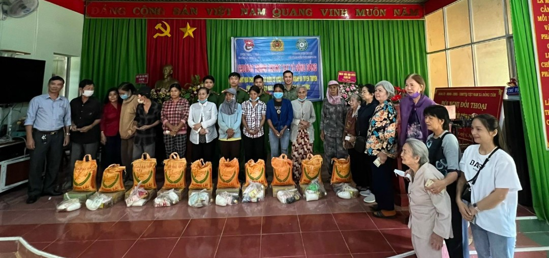 Đoàn còn trao tặng 100 phần quà cho gia đình khó khăn, trong đó 50 phần cho người dân ấp Lam Sơn xã Tân Phước và 50 phần cho người dân xã Đồng Tâm, mỗi phần quà bao gồm các nhu yếu phẩm, như: Gạo, mì tôm, nước tương, dầu ăn… và tiền mặt tổng trị giá 500 ngàn đồng/phần.