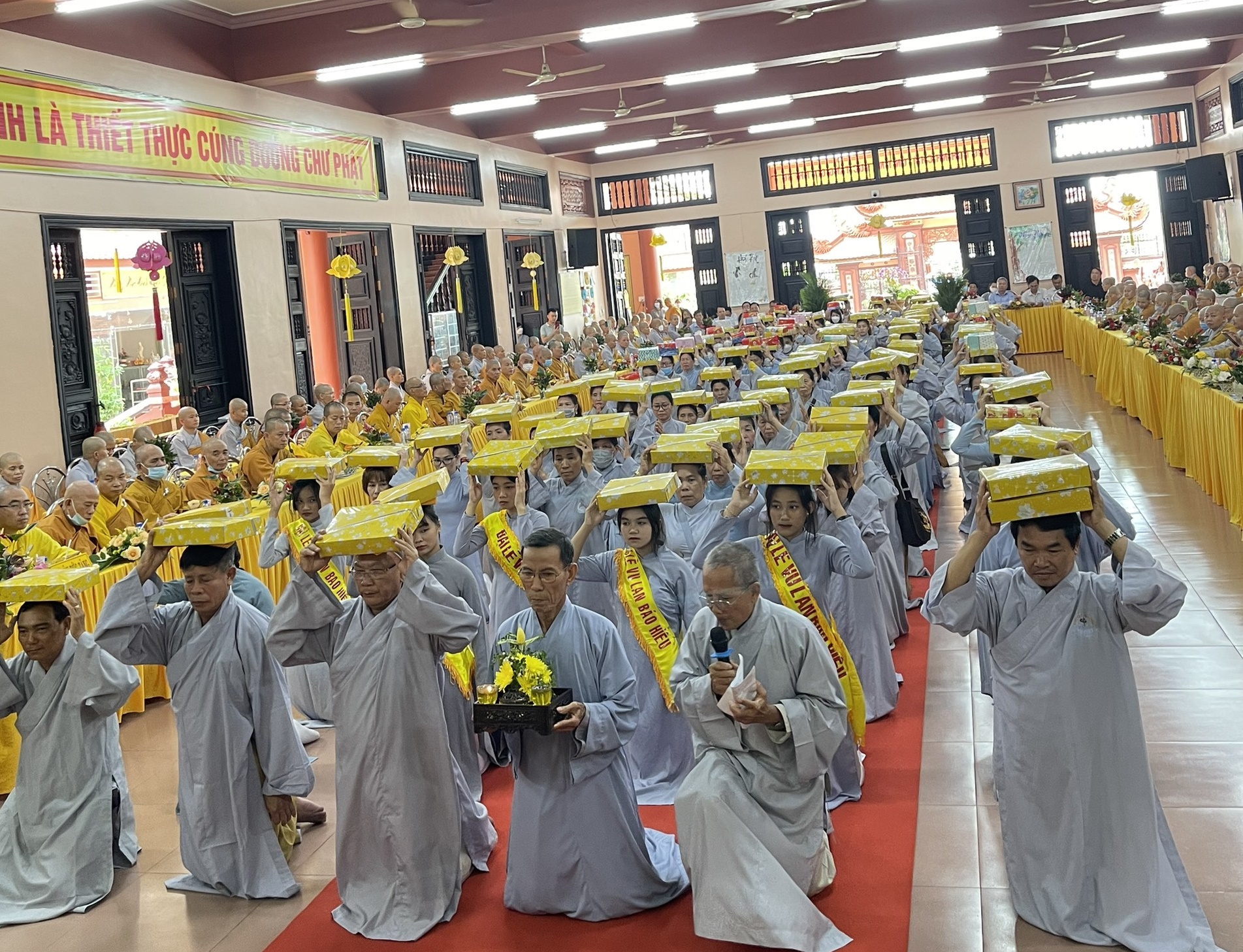 Có lời phát biểu chúc mừng và những lãng hoa, những phần quà ý nghĩa chúc mừng cho Đại lễ. Dịp này, quý Phật tử chùa Quang Minh, trong ngày tự tứ cũng dâng pháp y lên chư Tôn tịnh đức Tăng già nhị bộ.