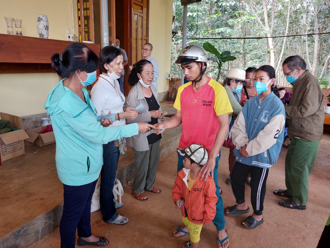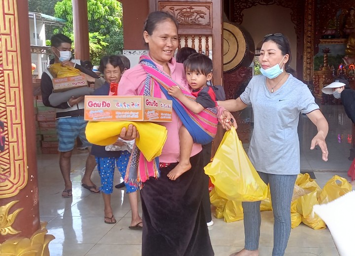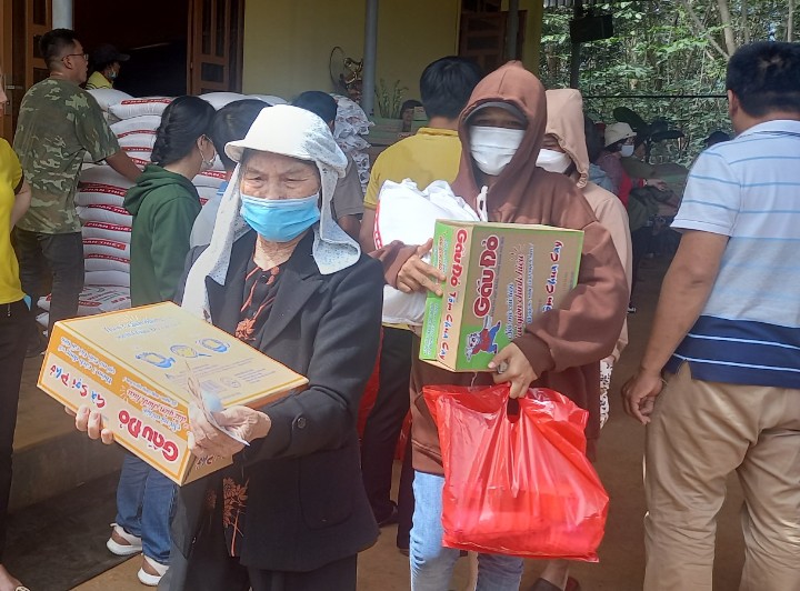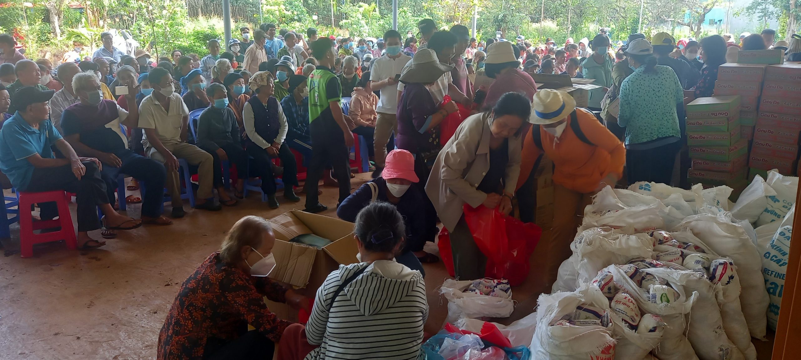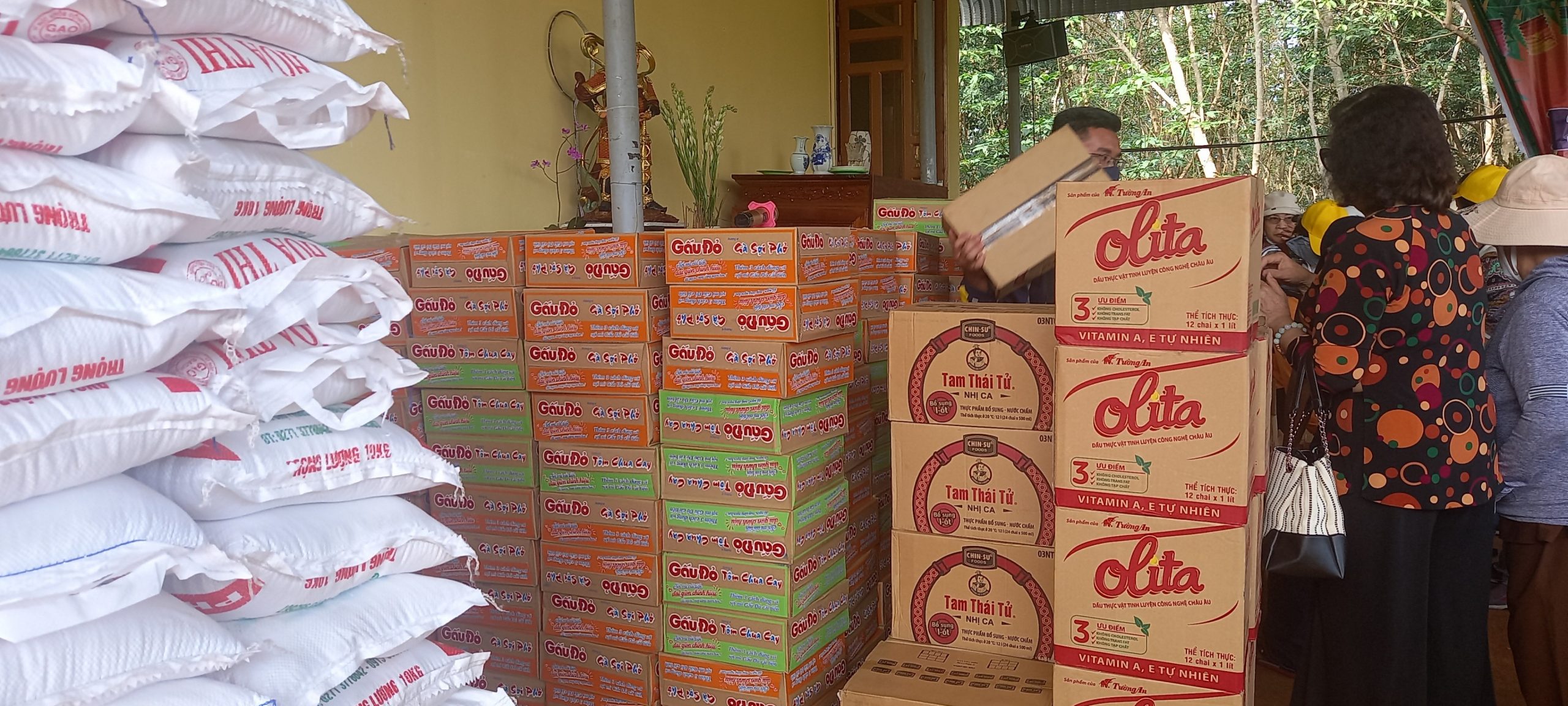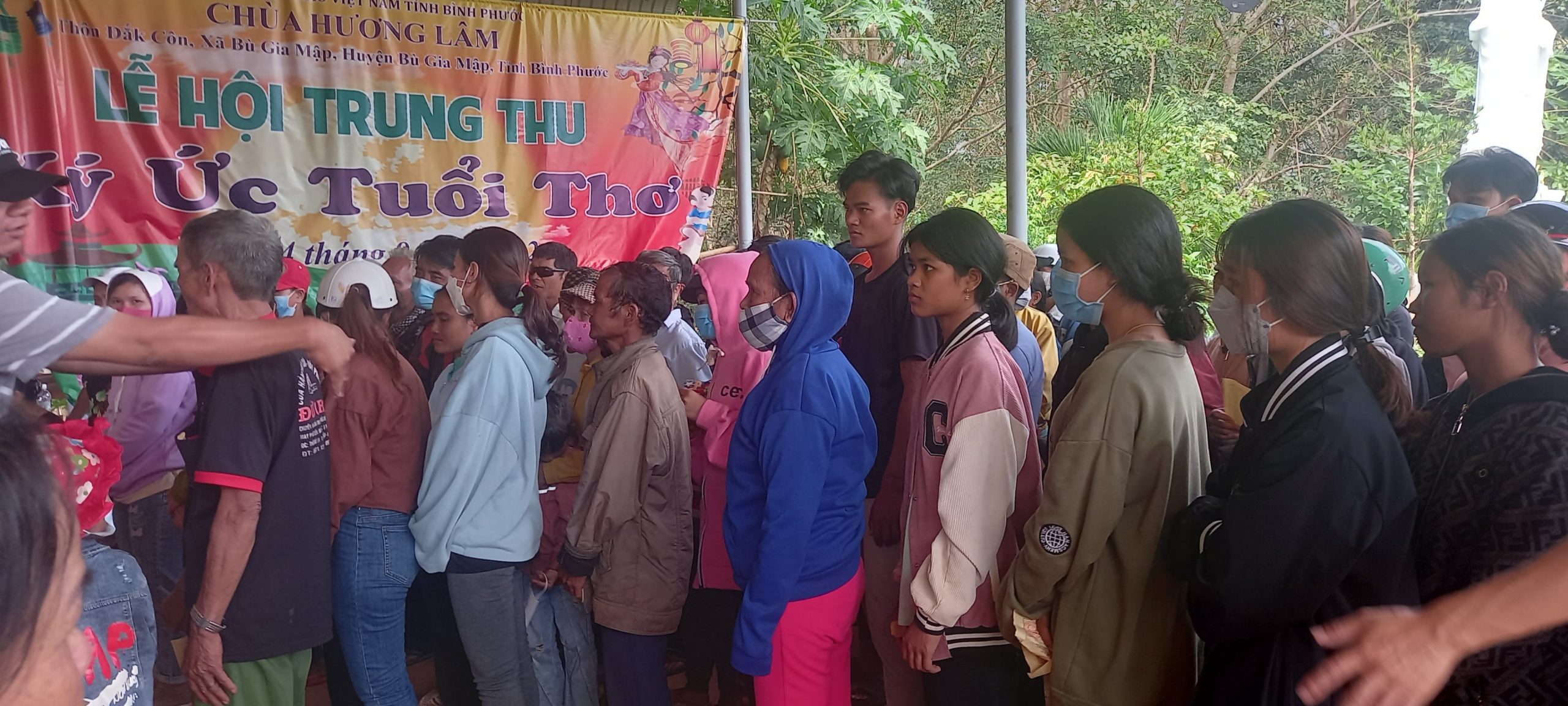 - Tại chùa Hương Lâm, thôn Đắk Côn, xã Bù Gia Mập đoàn đã trao tặng 300 phần quà cho bà con dân tộc khó khăn ở các thôn trong xã. Tổng mỗi phần quà được trao tặng cho bà con nơi đây là 350.000 đồng gồm: 10 kg gạo, 1 thùng mì, 1 kg đường, 1 kg muối, 1 chai dầu ăn, 2 chai nước tương, 10 cái khẩu trang và 50.000 đồng tiền mặt.