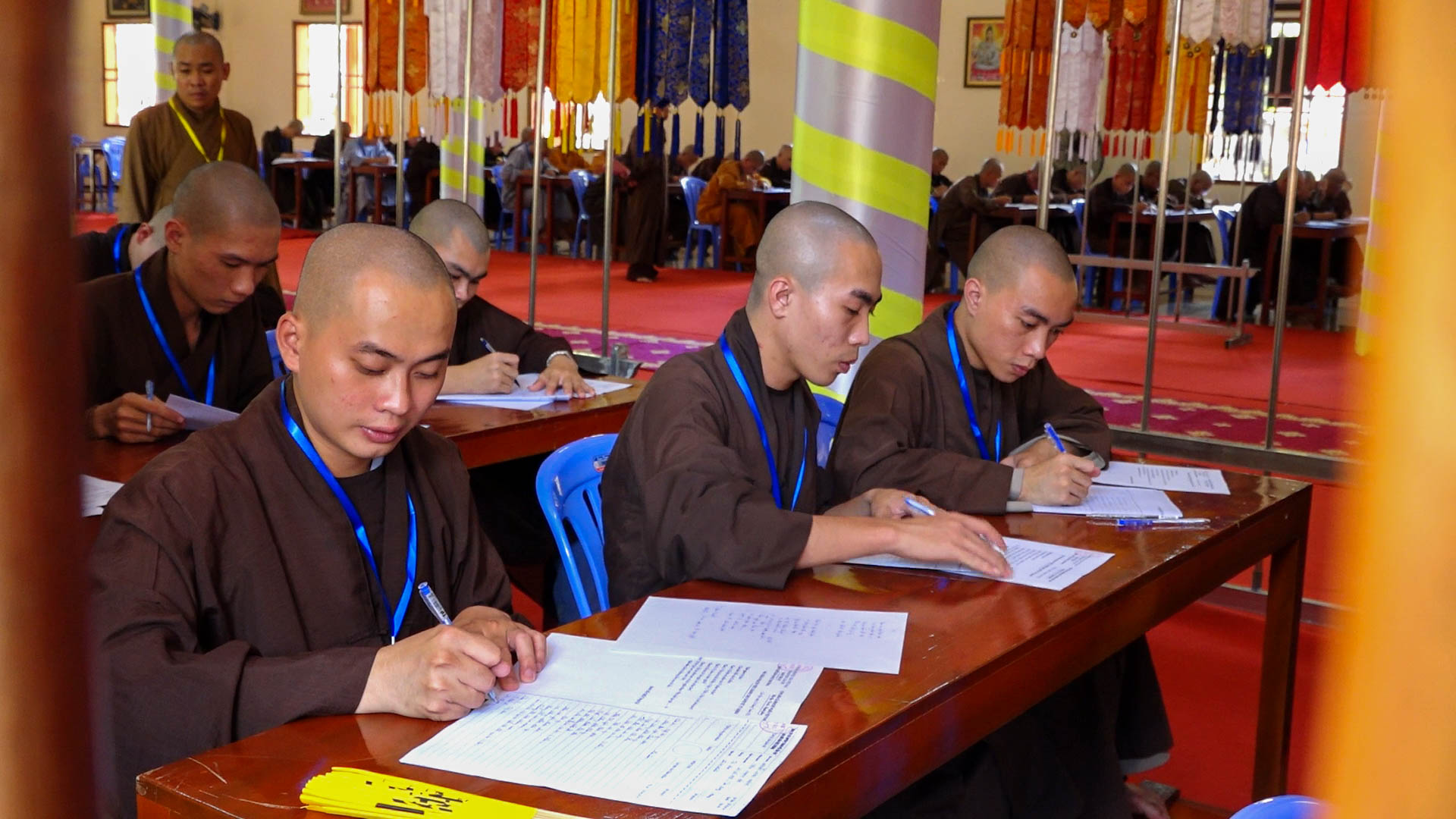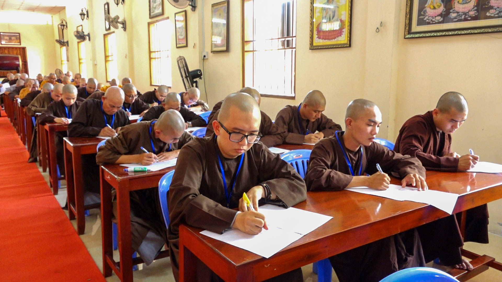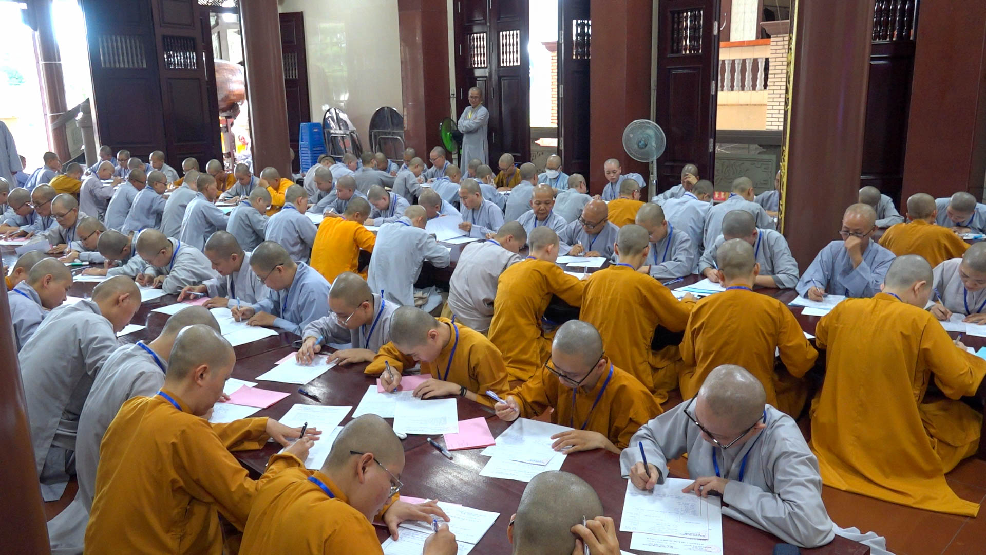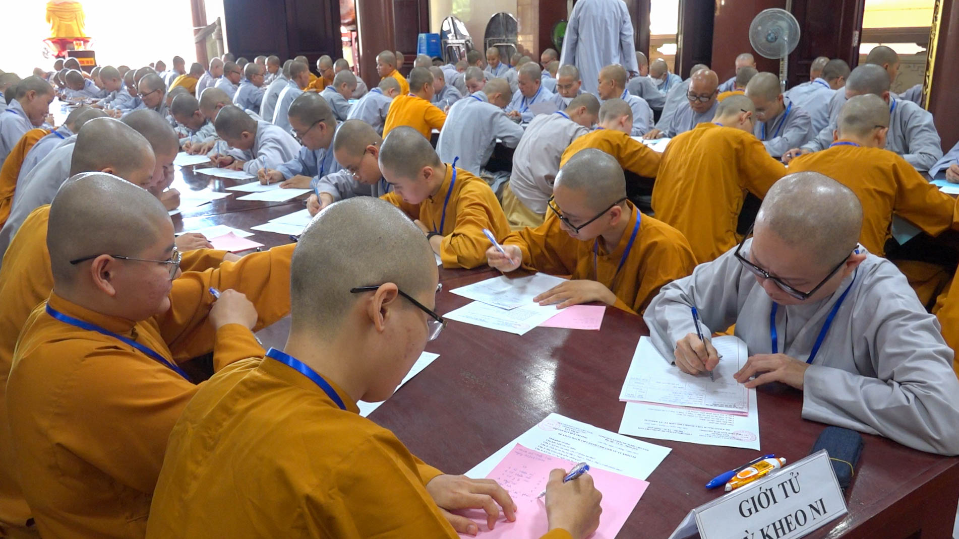 Sau đó, chư Tôn đức Ban Tổ chức Đại giới đàn đã chính thức mở đề thi và trao cho Ban Giám khảo, các giới tử bắt đầu làm bài thi trong sự giám sát chặt chẽ của Ban Giám thị. Các Giới tử đã nghiêm túc làm bài, thể hiện rõ tinh thần cần cầu giới pháp thanh tịnh.