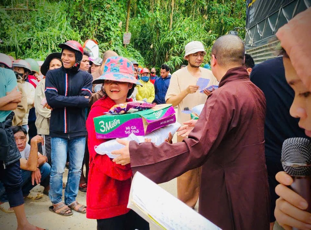 Tại điểm trao quà, Đại đức Thích Giác Tâm – trụ trì chùa Phúc Lâm, đã ân cần thăm hỏi, lắng nghe tâm tư và những khó khăn bà con đang đối mặt. Những bước chân lấm bùn, những lời động viên giản dị mà chân thành đã mang lại cảm giác ấm áp và được sẻ chia trong thời điểm đầy thử thách.