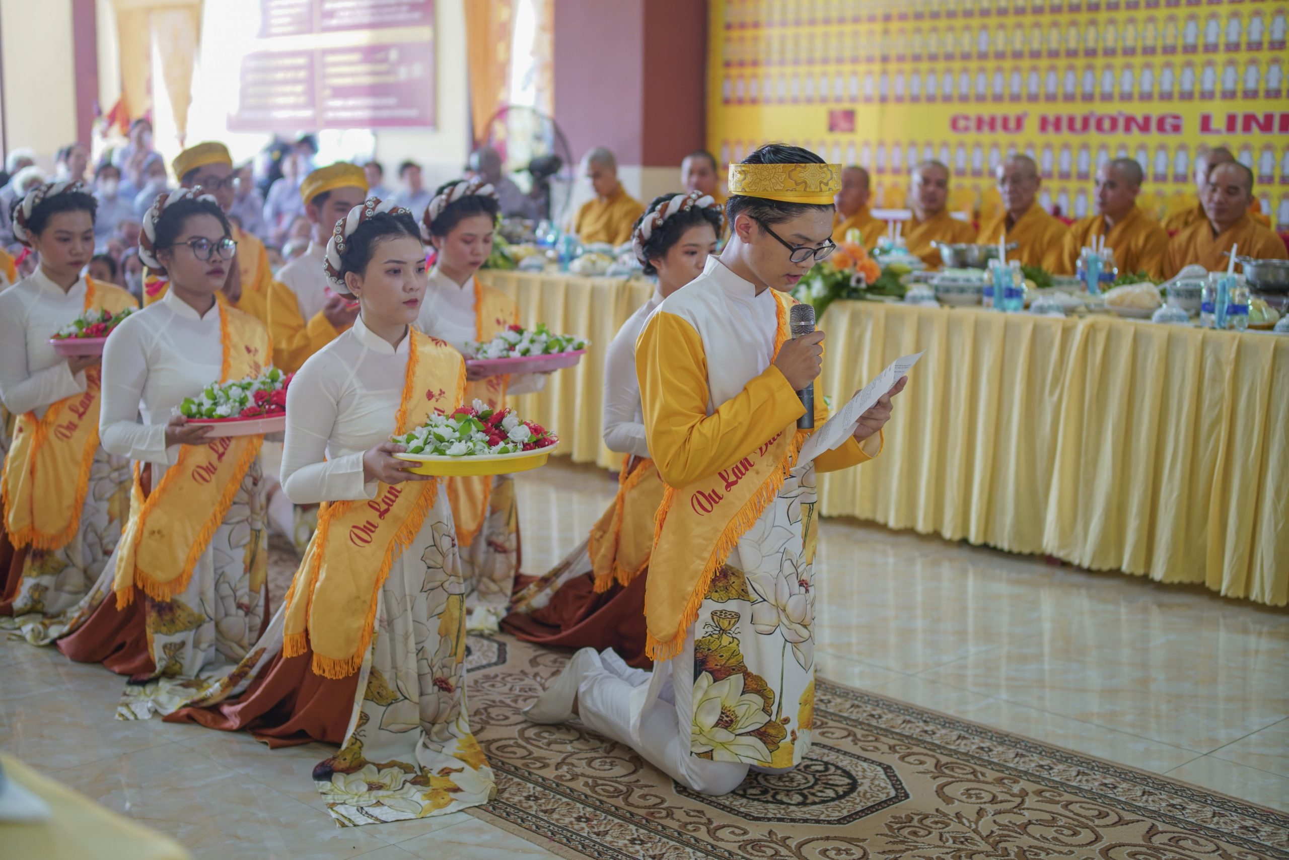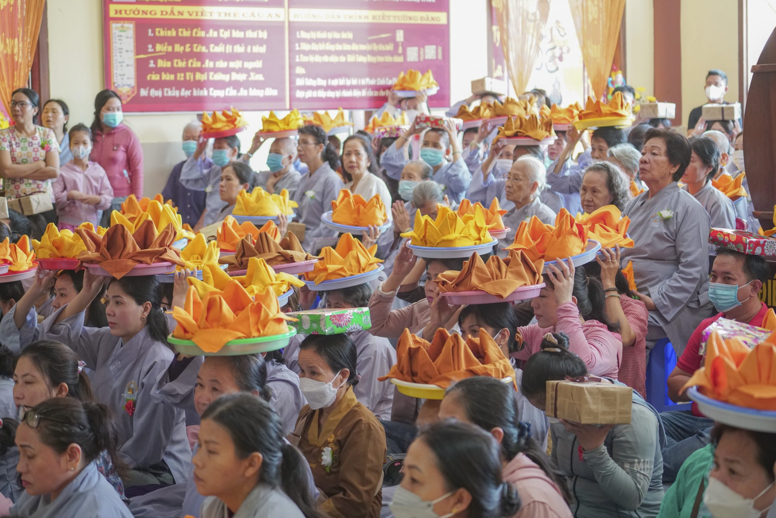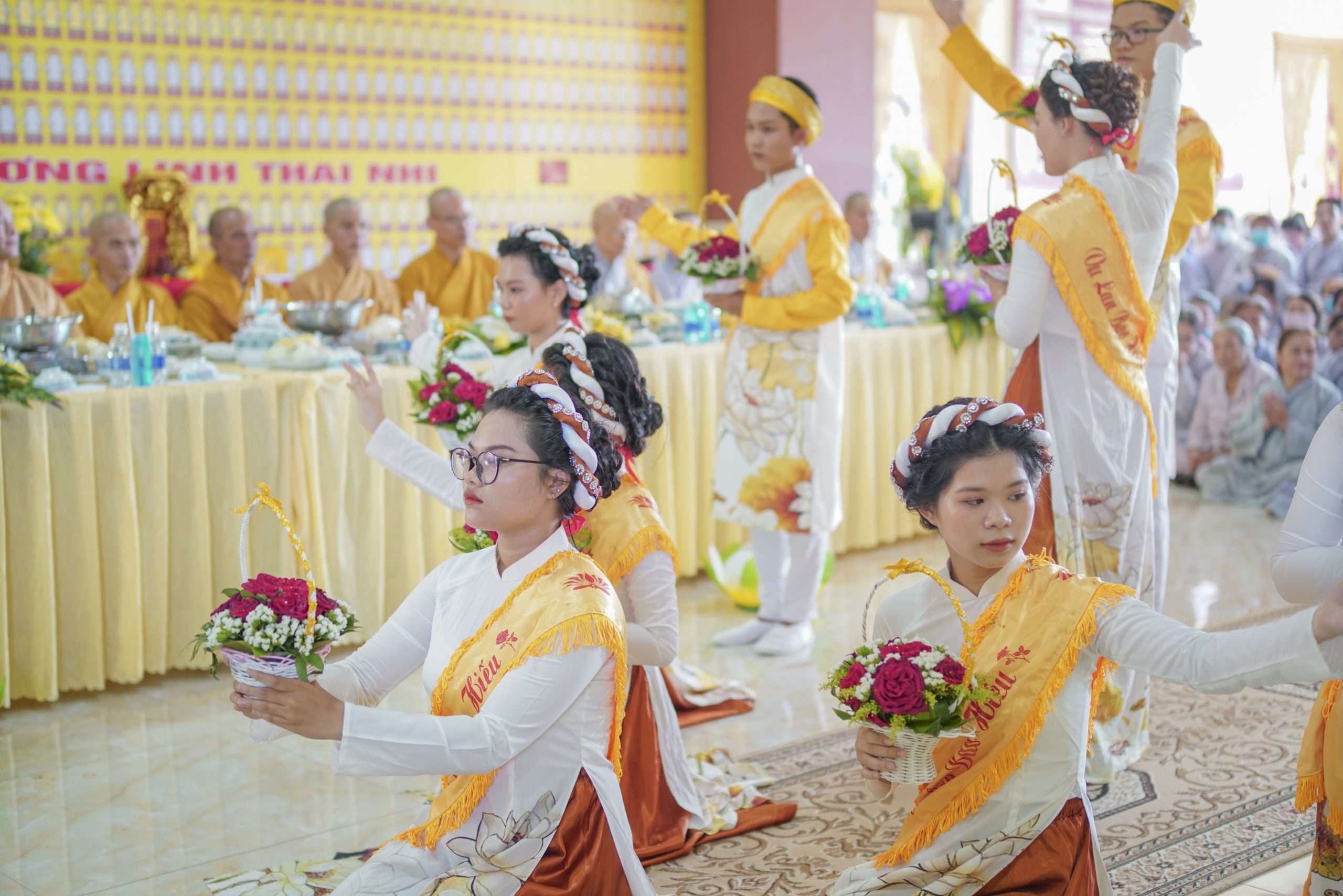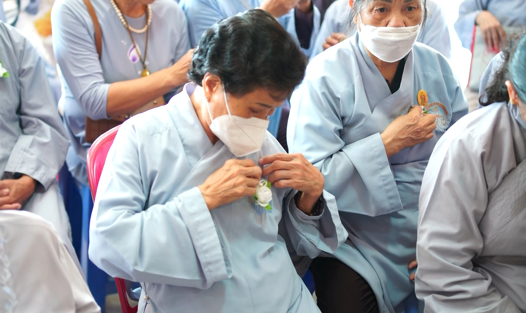Sau khi trì tụng kinh, chư Tăng, Ni, Phật tử đã vân tập về chánh điện để chính thức diễn ra lễ cài hoa hồng vô cùng thiêng liêng. Nghi thức cài hoa hồng nhắc nhở mỗi người nhớ nghĩ về ân đức sinh thành, dưỡng dục sâu dày của hai đấng song thân. Trên những chiếc y vàng giải thoát của chư Tôn đức Tăng Ni, từng đóa hồng được Phật tử cung kính cài lên nơi ngực áo. Những đóa hồng màu đỏ được cài lên áo cho những ai còn cha, còn mẹ buồn hơn khi những ai cài lên mình chiếc hoa hồng màu trắng khi không còn cha, mẹ nữa. Cũng hoa hồng ấy cài lên ngực áo là nỗi niềm thương nhớ đến 2 đấng sinh thành. Các em Phật tử đã dâng bài tác bạch cảm niệm công đức nhân ngày Vu Lan trong niềm vui, buồn khó tả