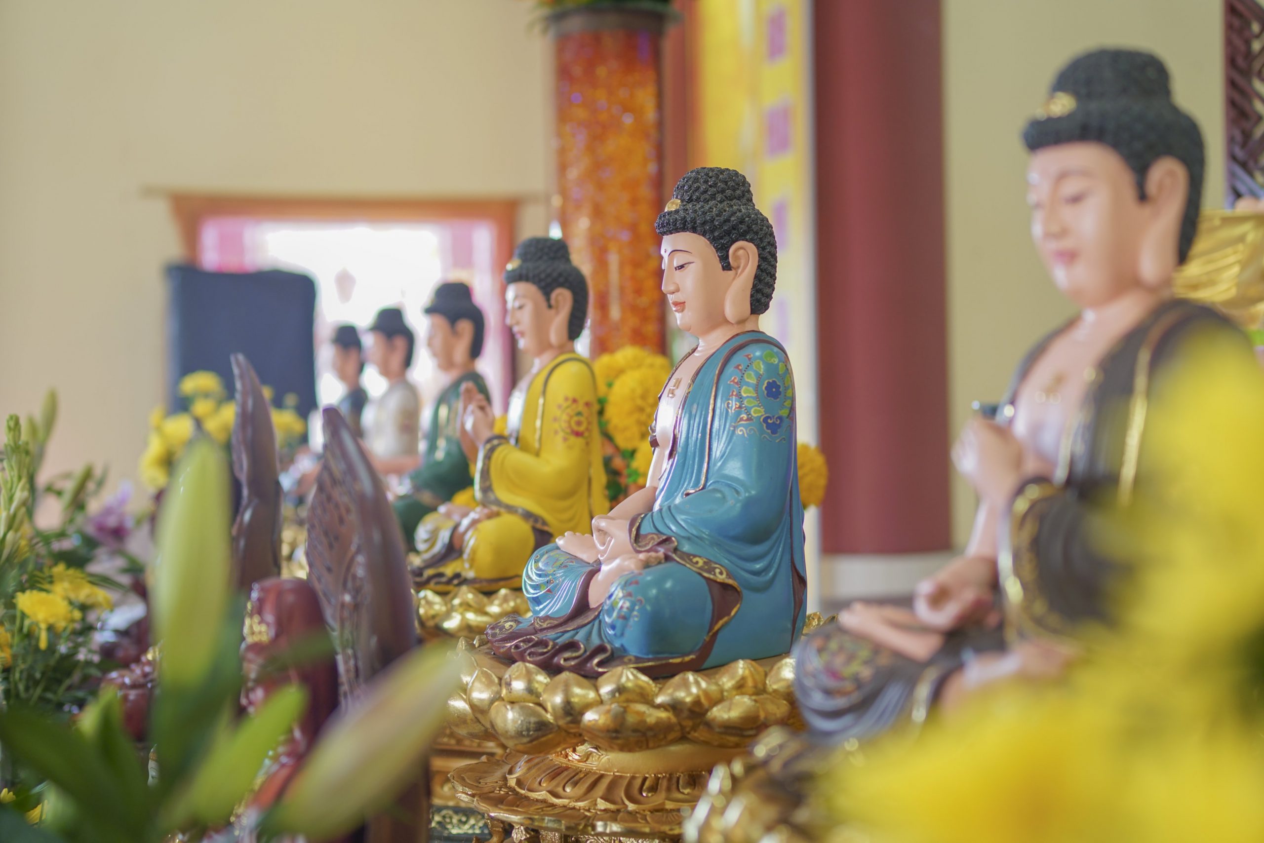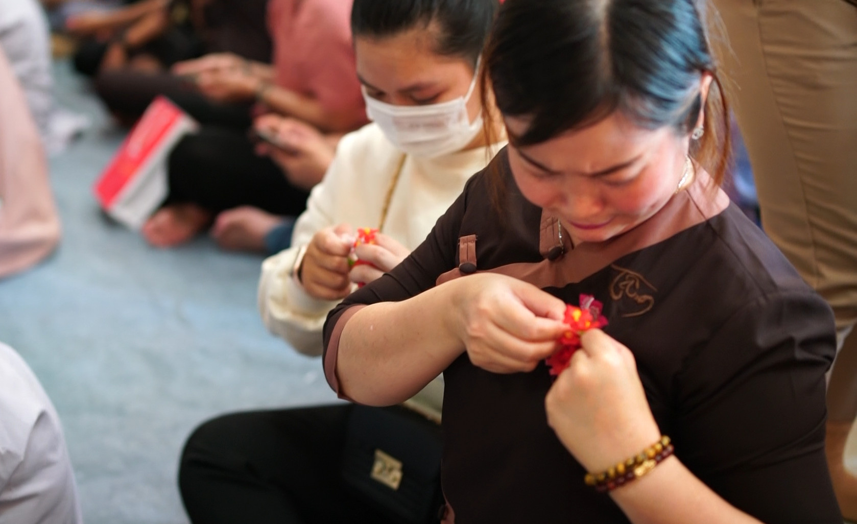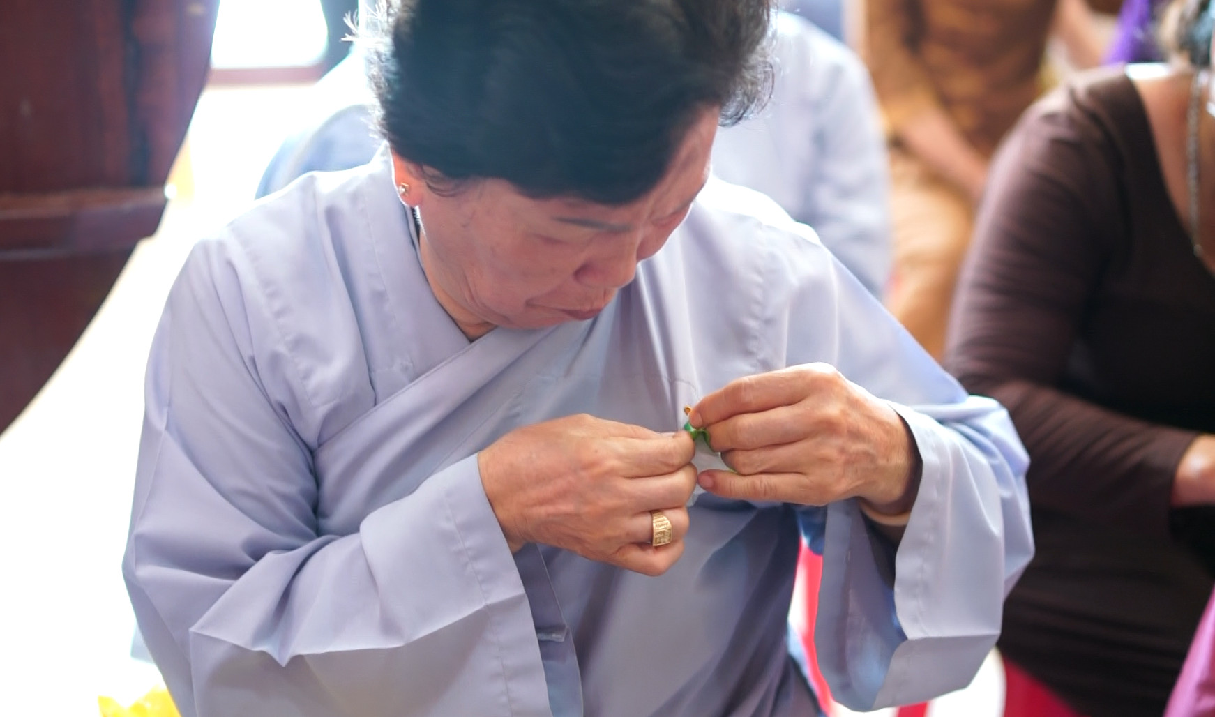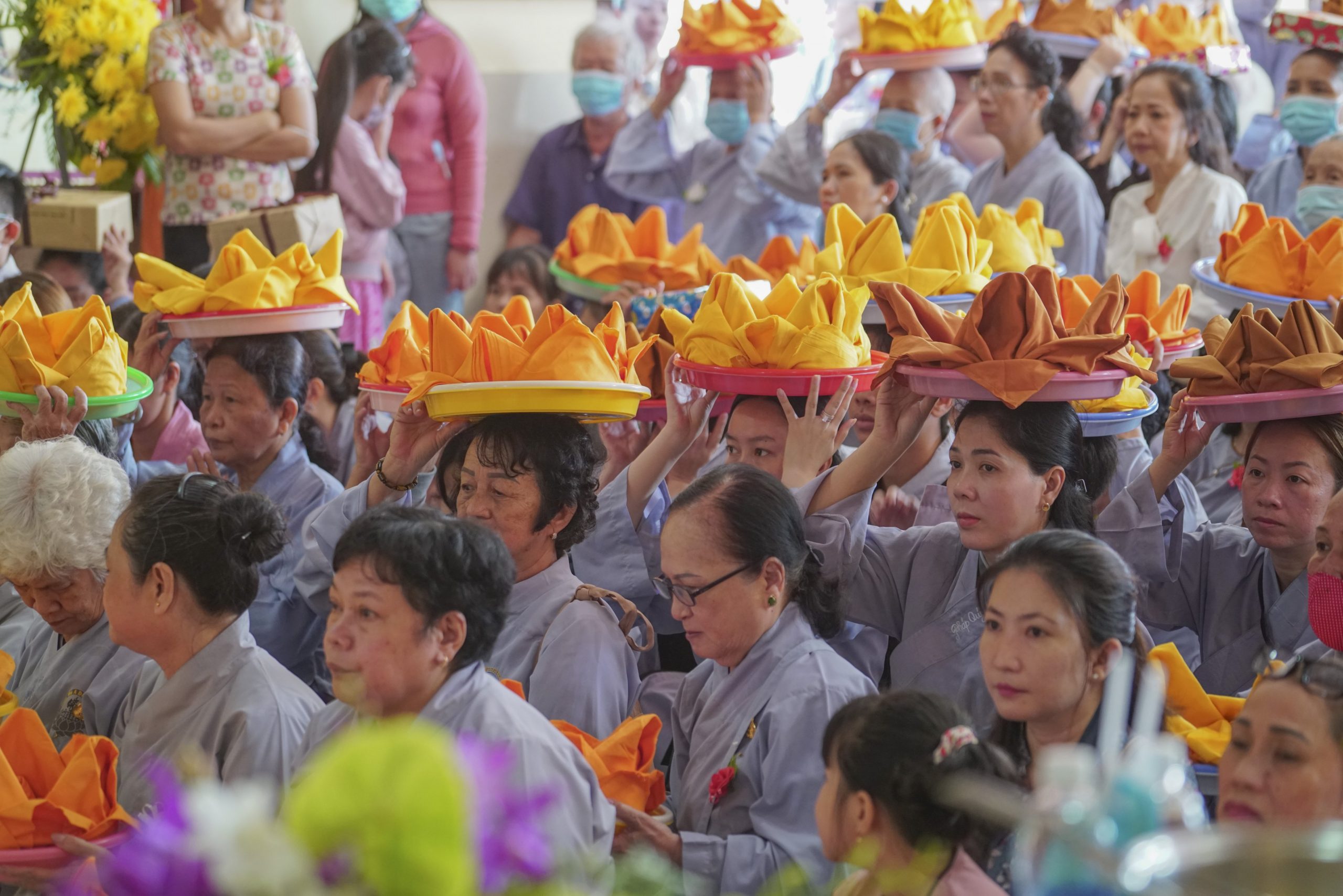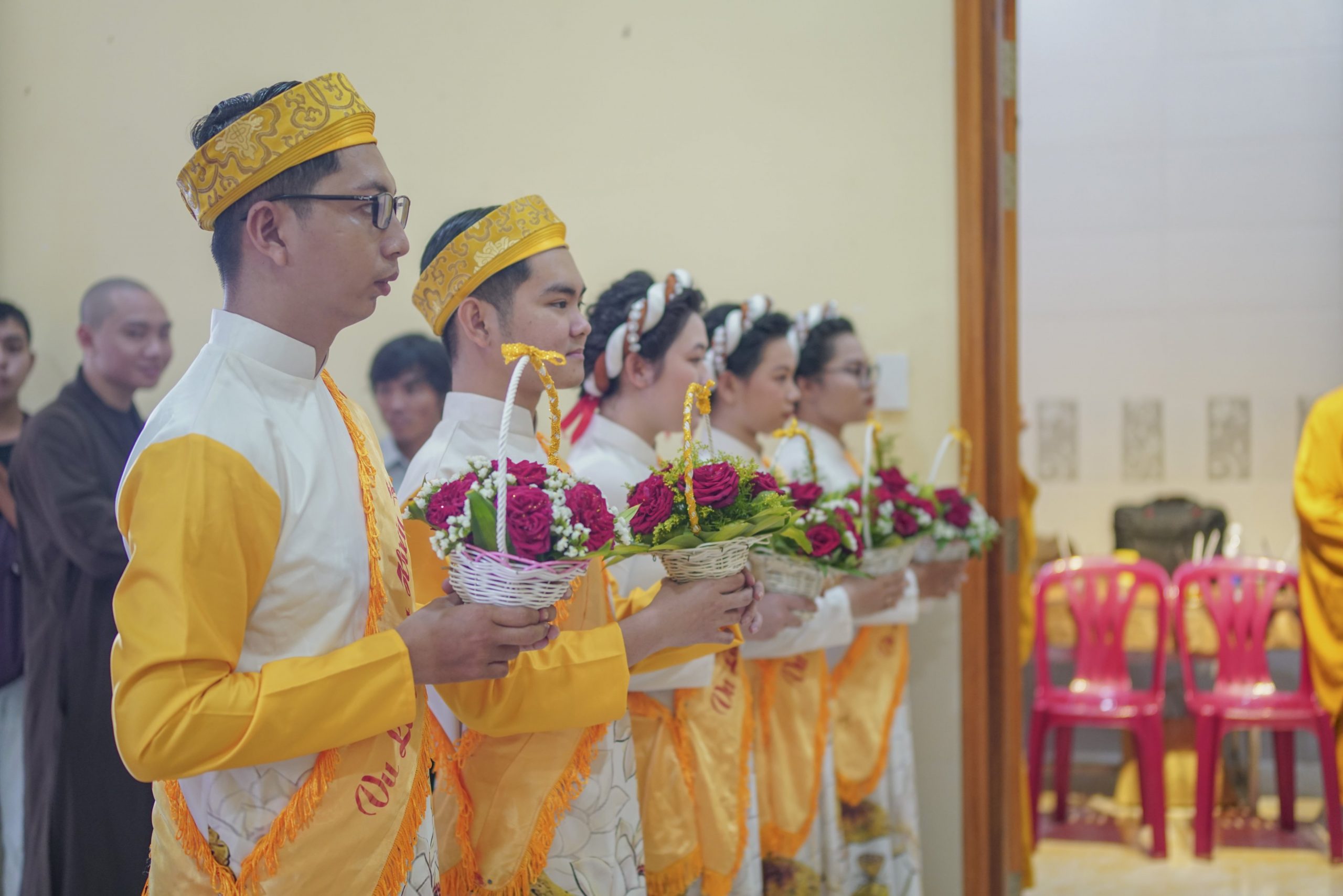 Sau khi trì tụng kinh, chư Tăng, Ni, Phật tử đã vân tập về chánh điện để chính thức diễn ra lễ cài hoa hồng vô cùng thiêng liêng. Nghi thức cài hoa hồng nhắc nhở mỗi người nhớ nghĩ về ân đức sinh thành, dưỡng dục sâu dày của hai đấng song thân. Trên những chiếc y vàng giải thoát của chư Tôn đức Tăng Ni, từng đóa hồng được Phật tử cung kính cài lên nơi ngực áo. Những đóa hồng màu đỏ được cài lên áo cho những ai còn cha, còn mẹ buồn hơn khi những ai cài lên mình chiếc hoa hồng màu trắng khi không còn cha, mẹ nữa. Cũng hoa hồng ấy cài lên ngực áo là nỗi niềm thương nhớ đến 2 đấng sinh thành. Các em Phật tử đã dâng bài tác bạch cảm niệm công đức nhân ngày Vu Lan trong niềm vui, buồn khó tả