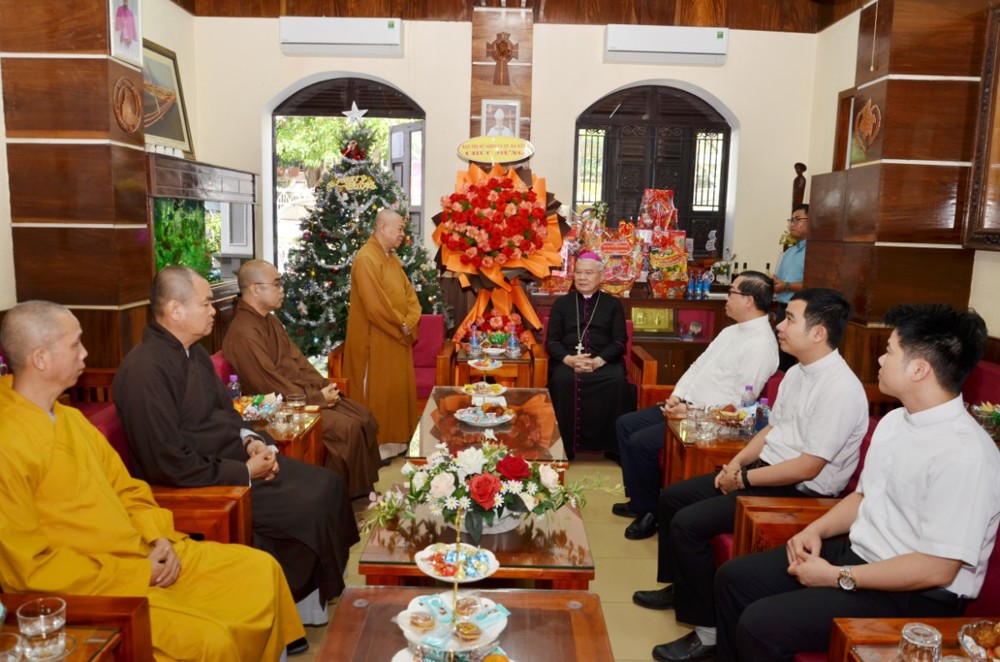 Tháp tùng đoàn có: TT. Thích Chúc Tín – Phó Ban Trị sự kiêm Trưởng ban Giáo dục Phật giáo thành phố; TT. Thích Pháp Châu – Phó Ban Trị sự kiêm Trưởng ban HDPT Phật giáo thành phố; TT. Thích Thanh Bảo – Phó Thư ký, Chánh Văn phòng Ban Trị sự; ĐĐ. Thích Pháp Ý – Phó Thư ký, Phó Văn phòng đã đến thăm và chúc mừng Giáng sinh năm 2025, đón chào năm mới 2026 tại Toà Giám mục Giáo phận Đà Nẵng.
