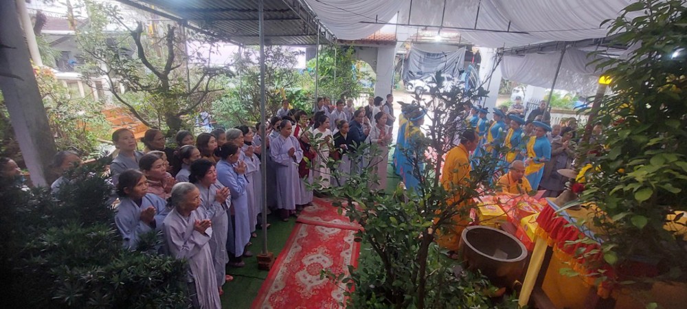 Không gian buổi lễ chính được an trí trang nghiêm phía trước chánh điện, nơi tôn trí kim thân Đức Phật A Di Đà, để chư Tăng Ni và Phật tử thành kính dâng hương lễ bái, nhất tâm hướng về Tam Bảo.