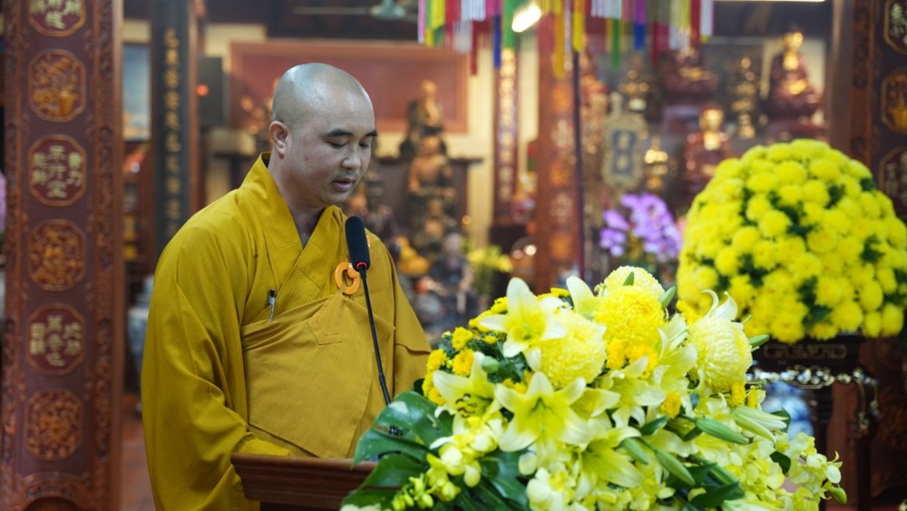 Mở đầu buổi lễ, Thượng tọa Thích Đạo Phong cung kính đọc tiểu sử Đức Vua – Phật Hoàng Trần Nhân Tông; ôn lại cuộc đời và sự nghiệp tu hành, hoằng pháp của Ngài.