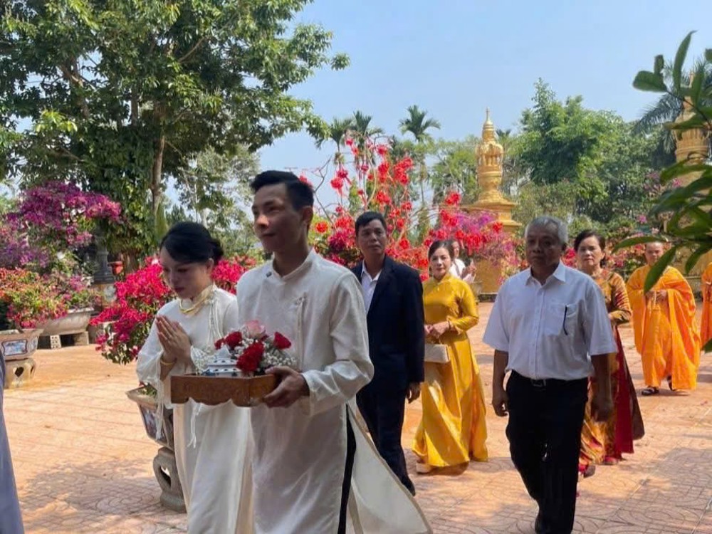 PSO - Ngày 11/4/2026 (nhằm ngày 24/2 năm Bính Ngọ), được sự chấp thuận của song thân hai họ, đôi tân lang Hoàng Hồng Sơn và tân nương Cái Võ Ngọc Như Quỳnh đã phát tâm về chùa Linh Thứu (phường Cư Bao, TDP Sơn Lộc 2) để cử hành Lễ hằng thuận theo nghi thức Phật giáo.